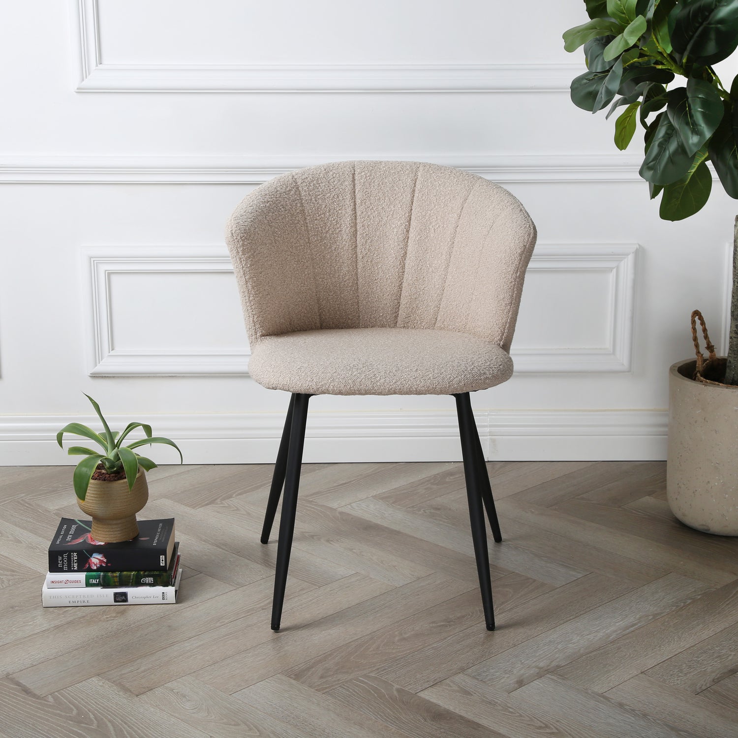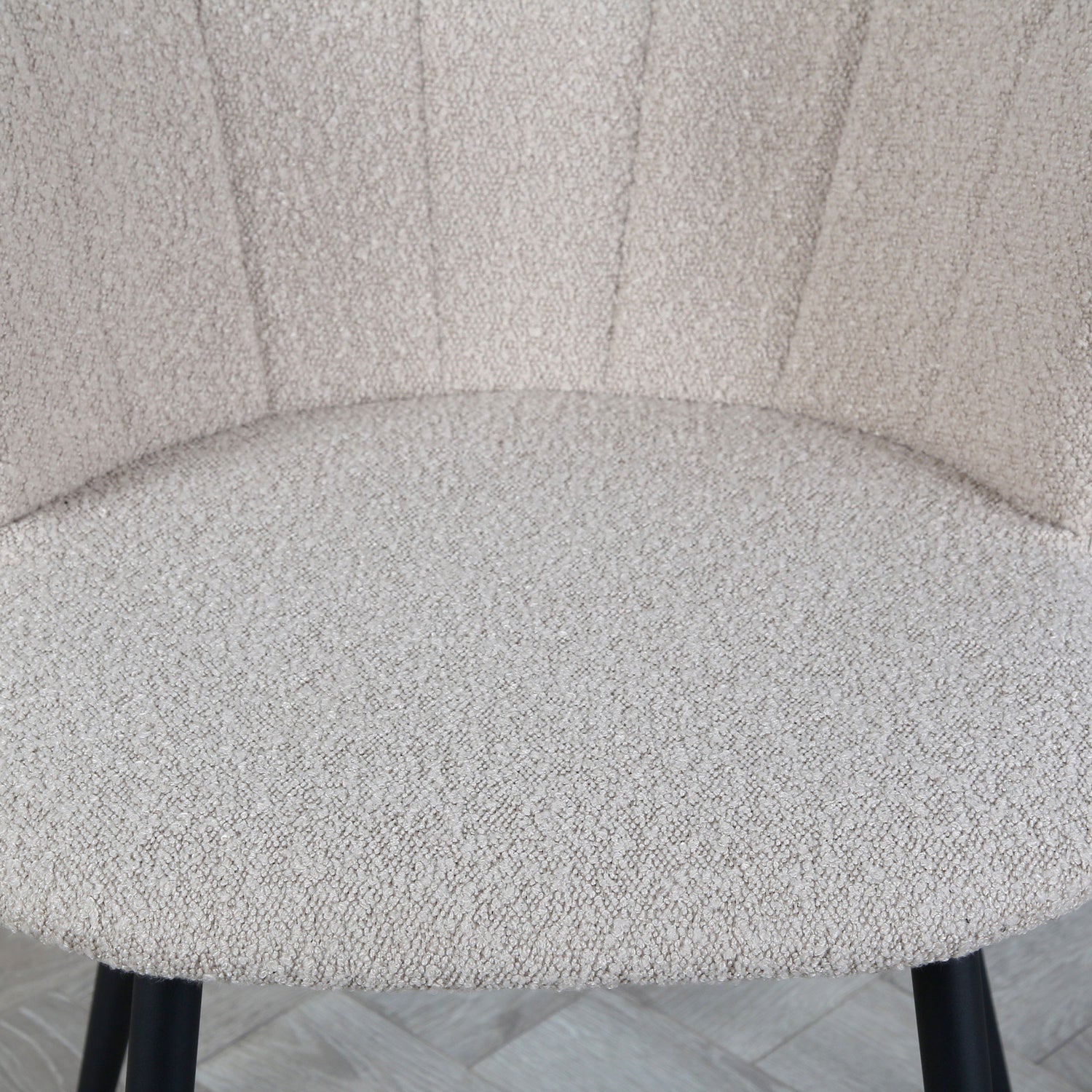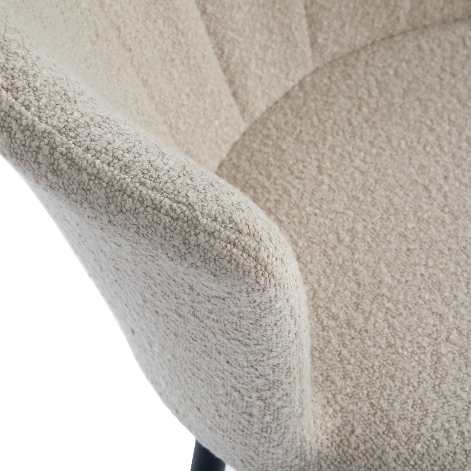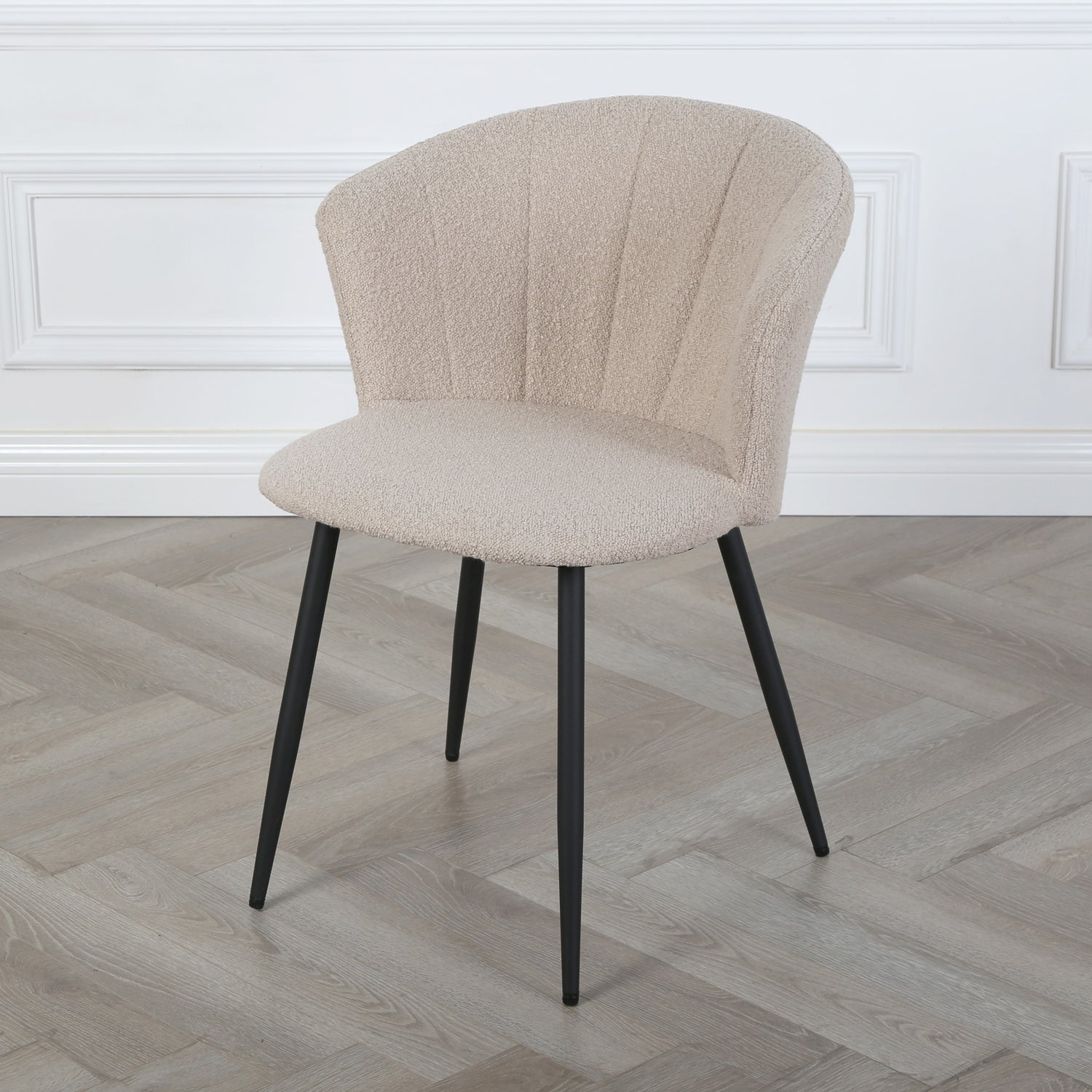 Crafted with precision, the Dunelm can also be considered as an "occasional chair". It features a bouclé beige upholstery, also known as teddy fabric, that not only adds a touch of vintage charm but also ensures a comfortable seating experience. The soft and textured fabric complements of our boucle chair makes them a versatile and timeless addition to your dining room.