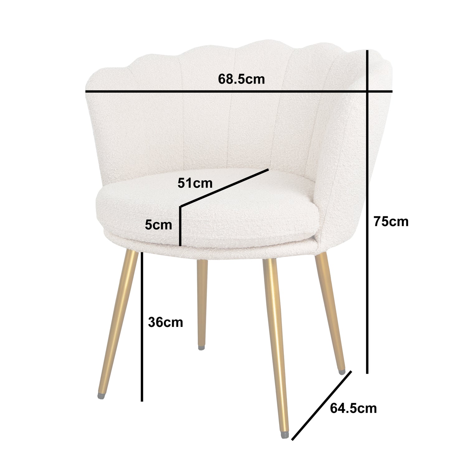The Flora armchair has a seat height of 50 cm and is made of high-quality boucle fabric and sponge for comfort and durability. The boucle fabric's lovely texture and the fluffy sponge cushioning provide the ideal balance of support and comfort.