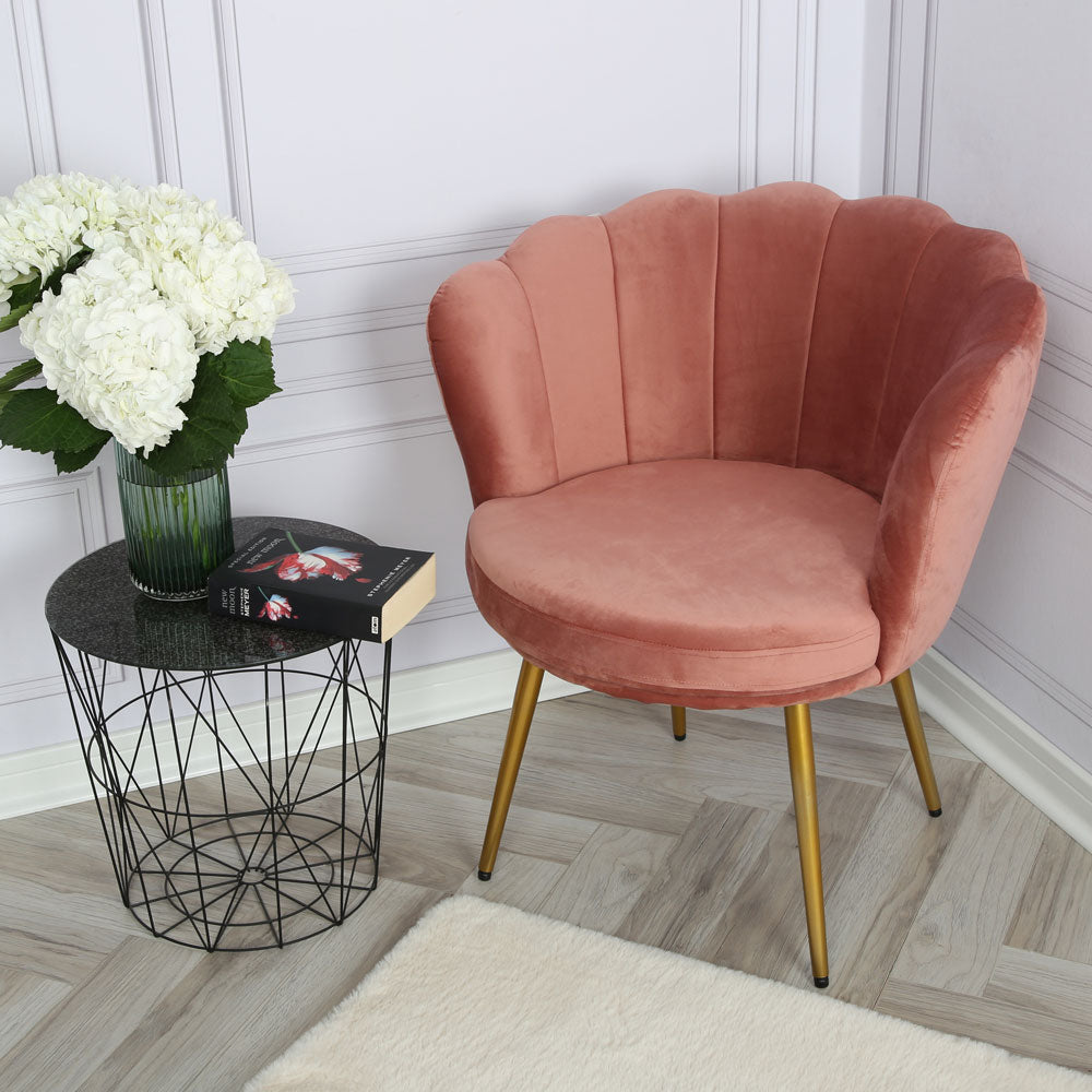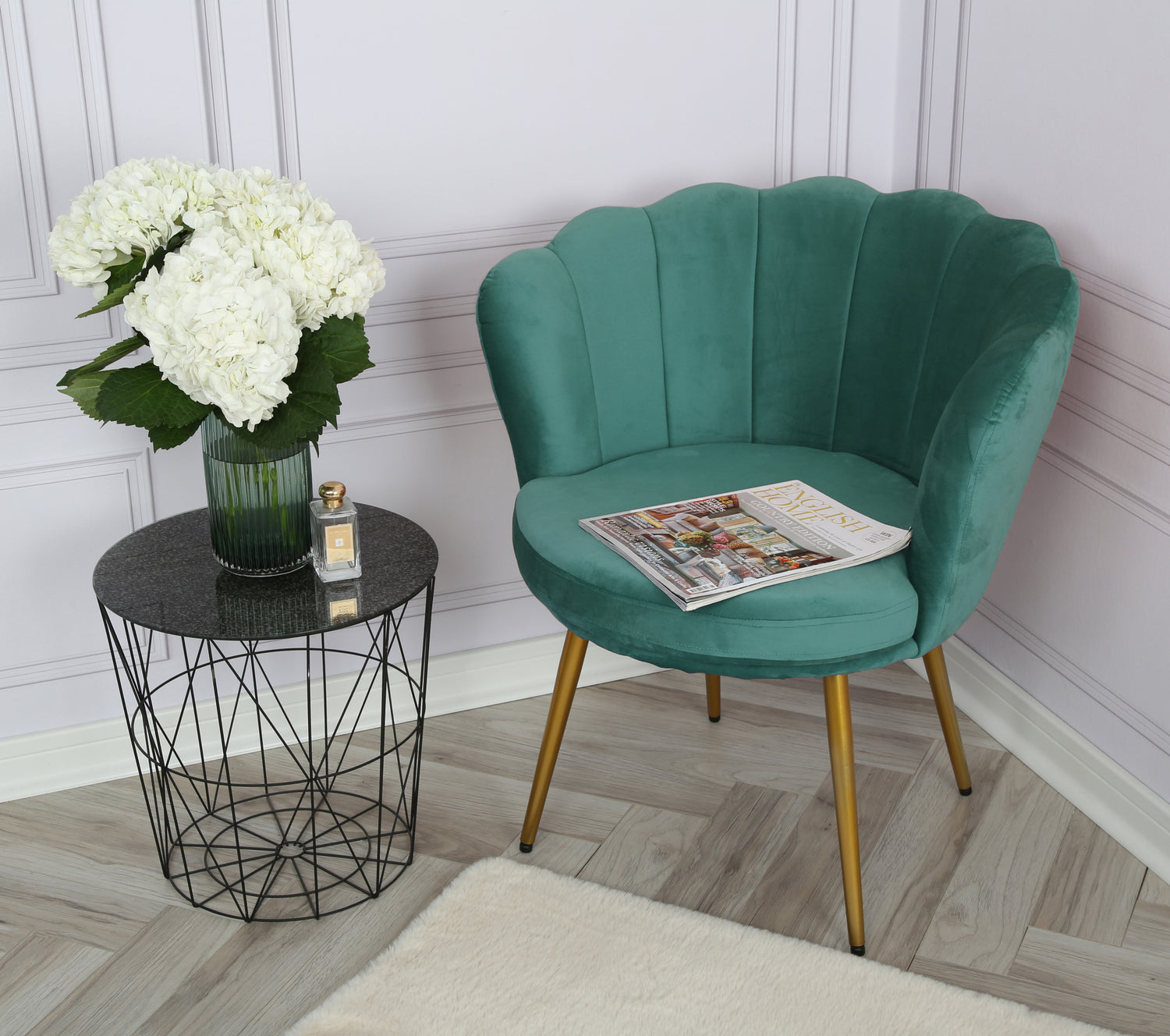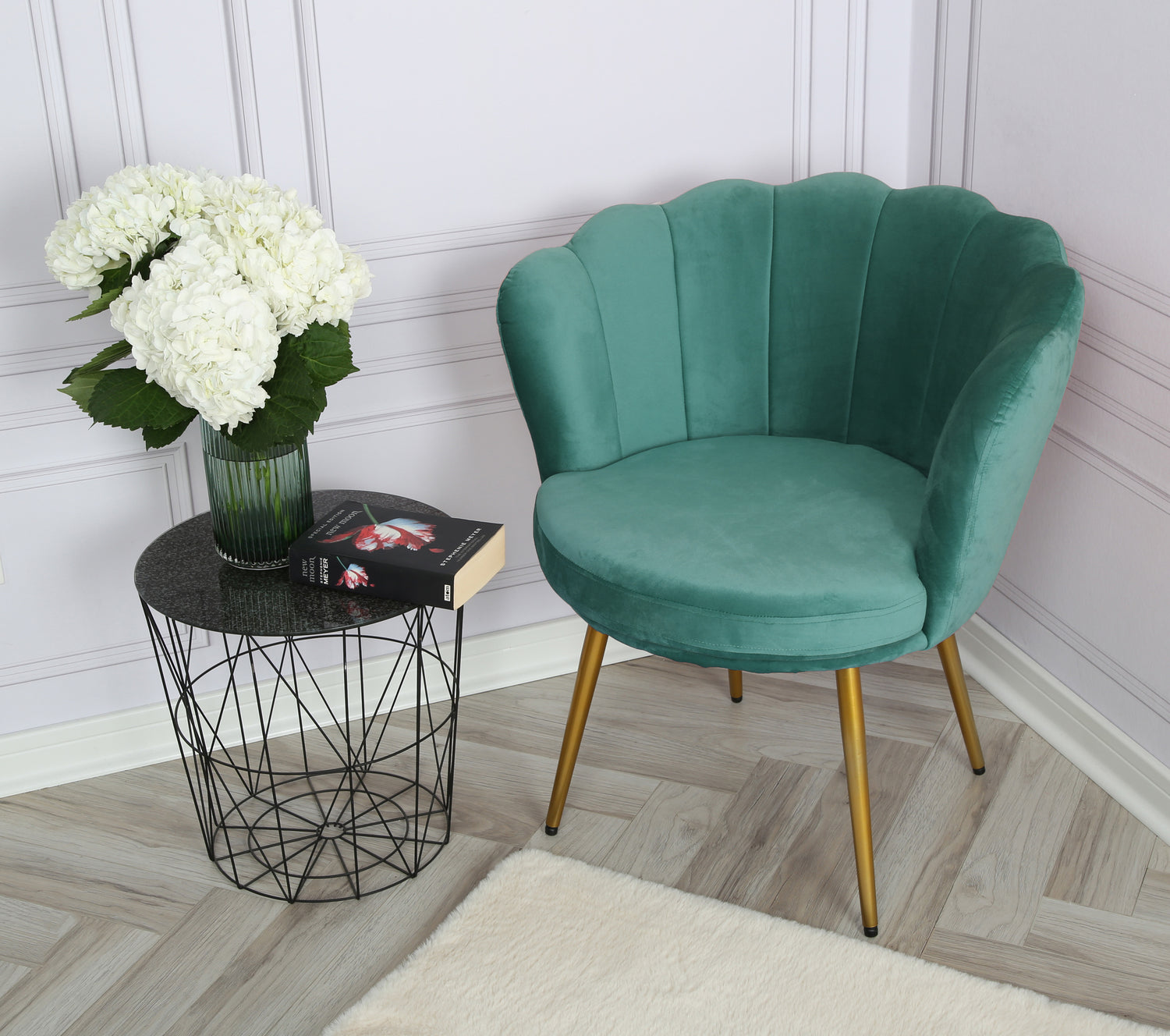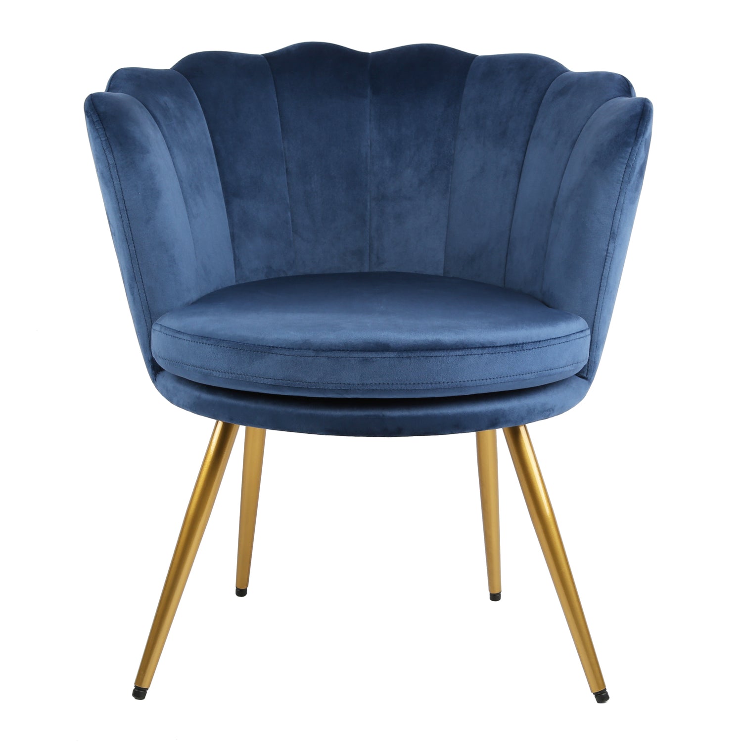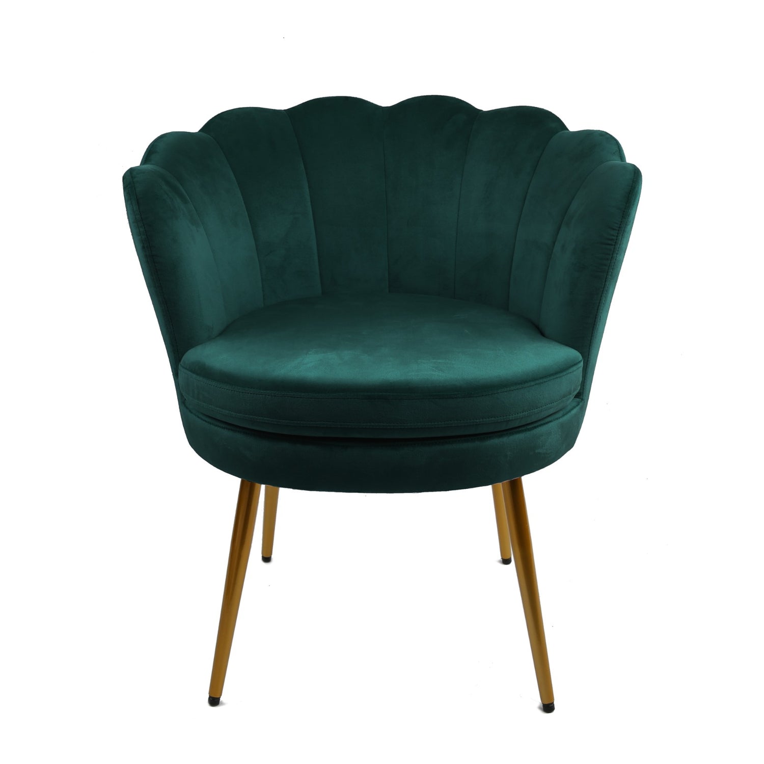 The Flora Accent Chair with Petal Back Scallop Armchair in Velvet is an elegant and eye-catching accent chair that will fit perfectly into any modern home. This chair combines modern floral curves with an array of unique patterns. It's constructed on a rust-free metal frame, features gold-coated metal legs and offers unparalleled durability, convenience and style.