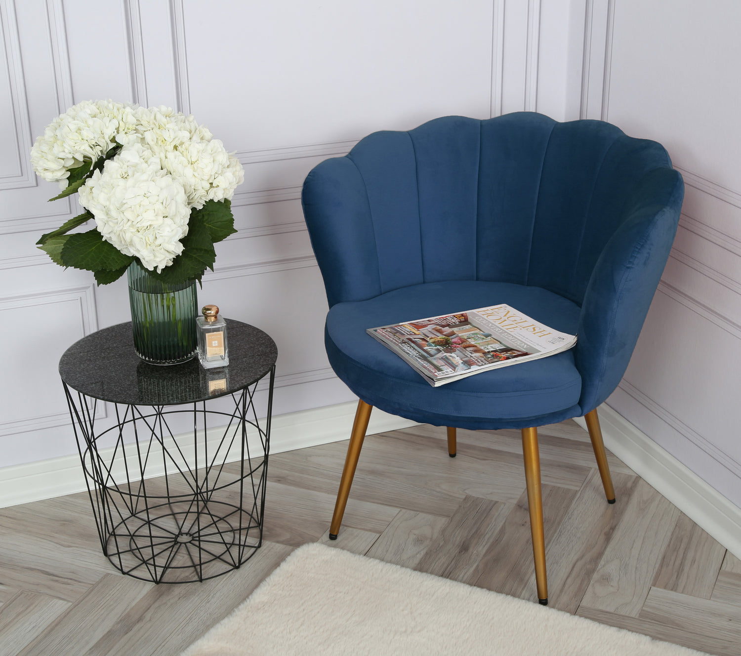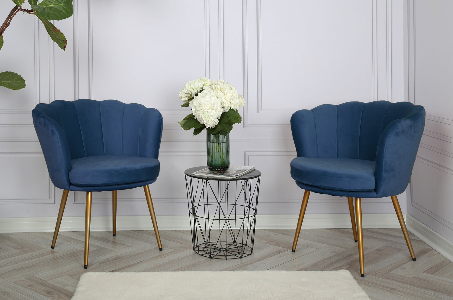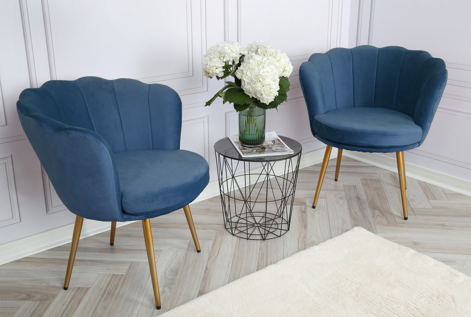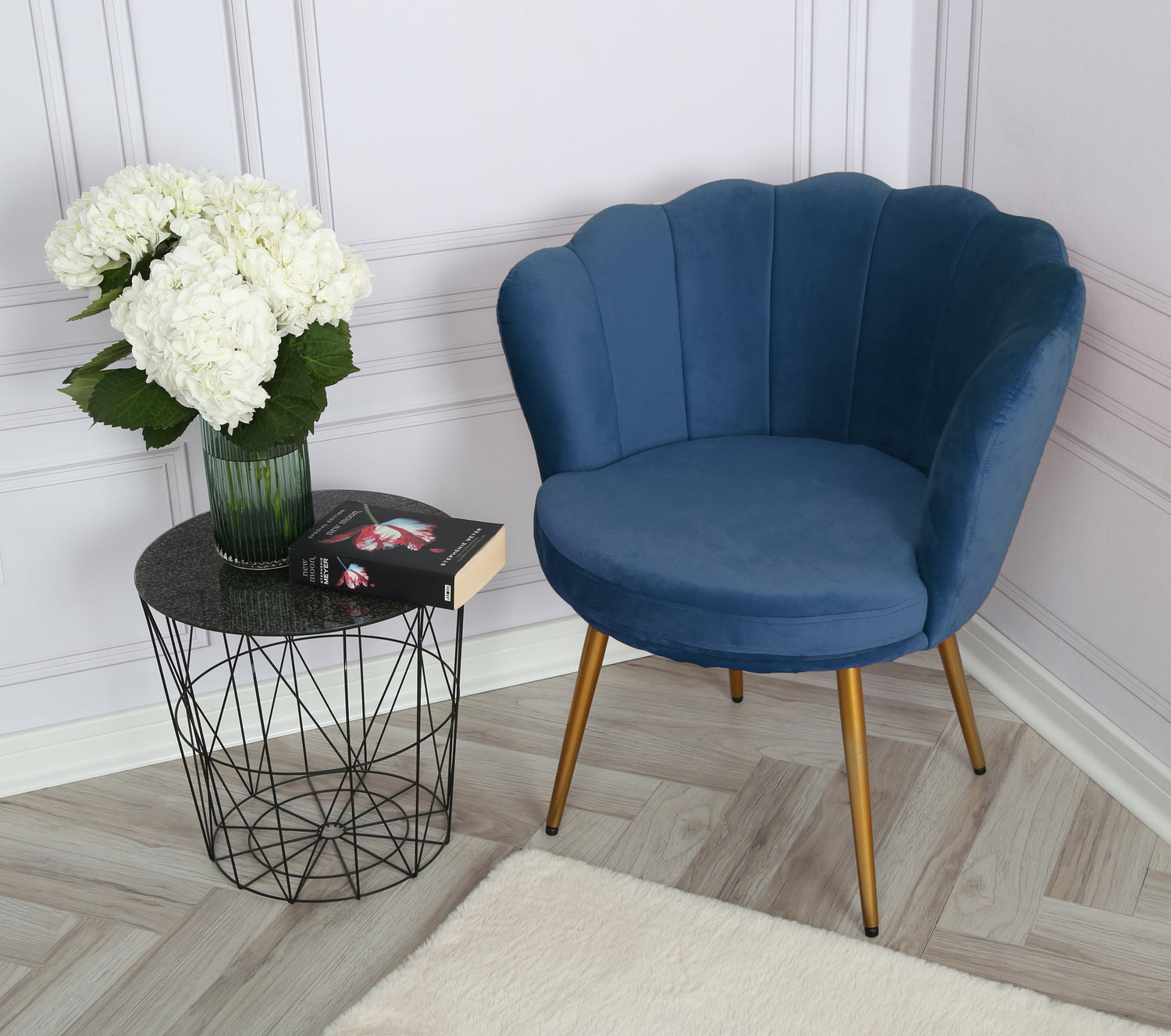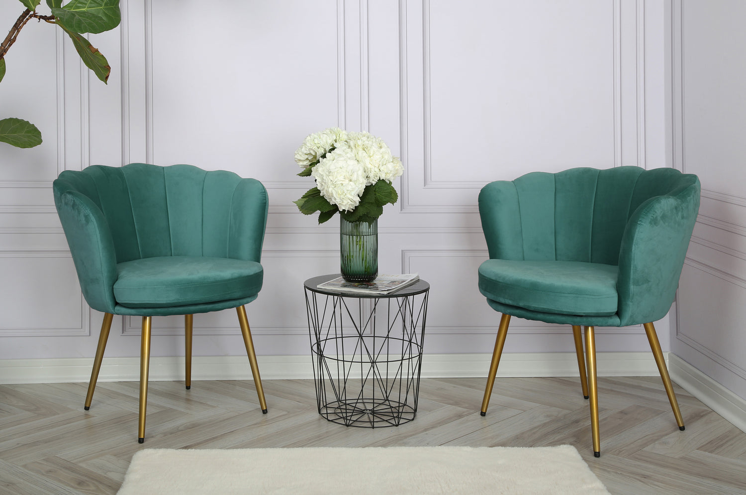 The Flora Accent Chair with Petal Back Scallop Armchair in Velvet is an elegant and eye-catching accent chair that will fit perfectly into any modern home. This chair combines modern floral curves with an array of unique patterns. It's constructed on a rust-free metal frame, features gold-coated metal legs and offers unparalleled durability, convenience and style.