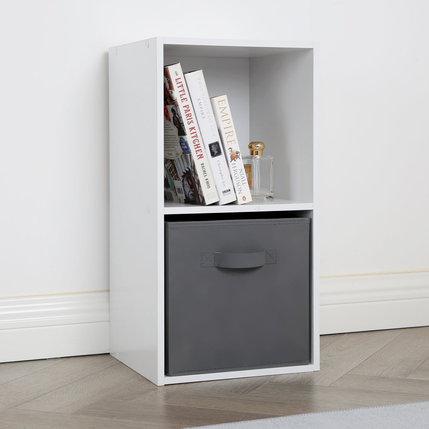 We'd like to introduce the 2x1 Jane white bookcase, a functional and adaptable storage option created to fit your organisational requirements. A dependable and practical shelving unit modern solution made to match your home's decor, this shelf unit corner is offered in a traditional white finish with one grey basket.