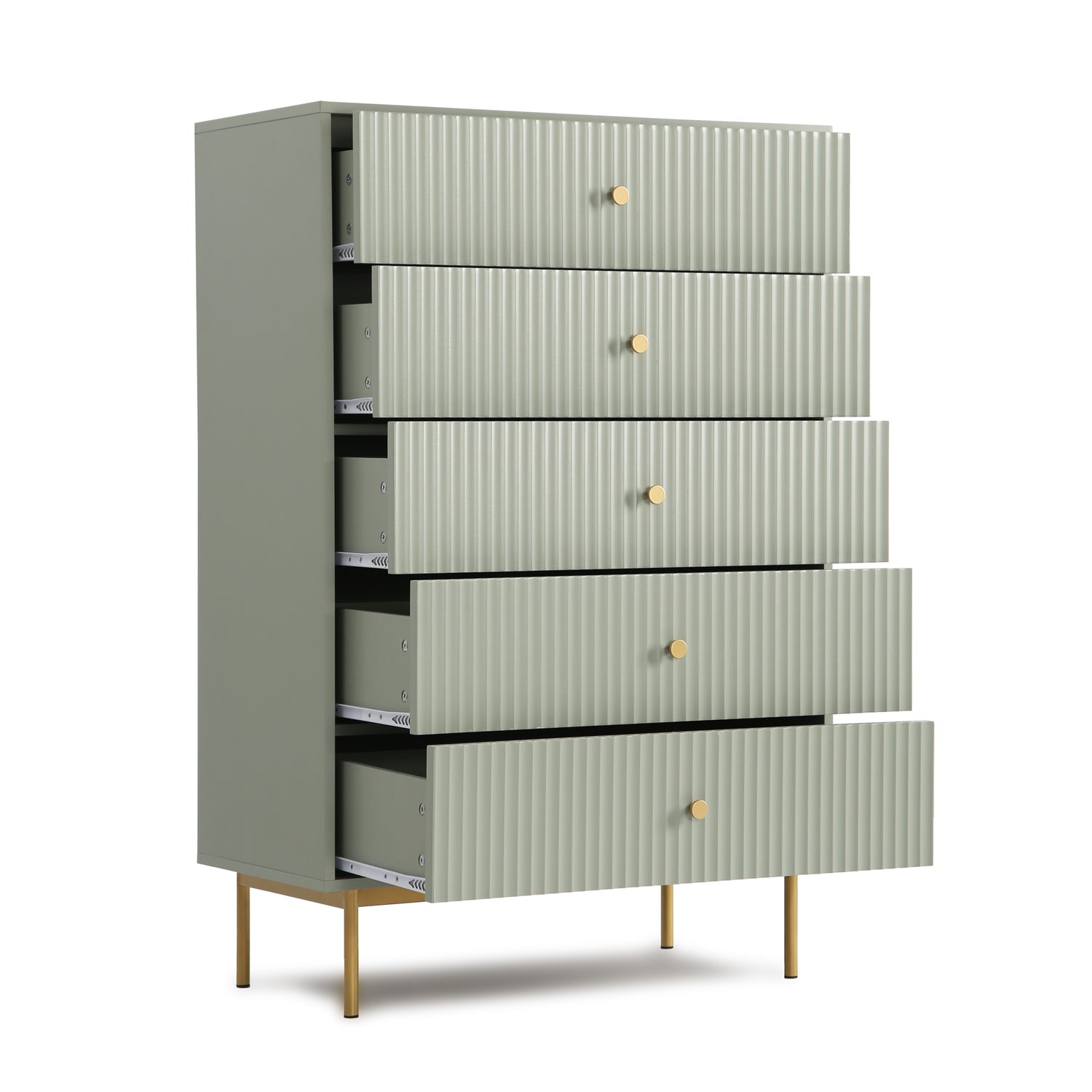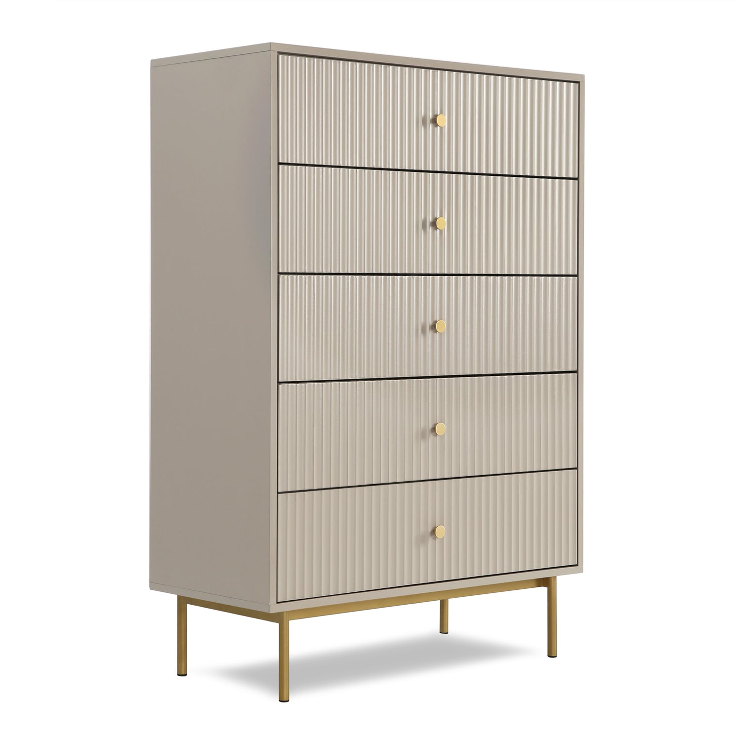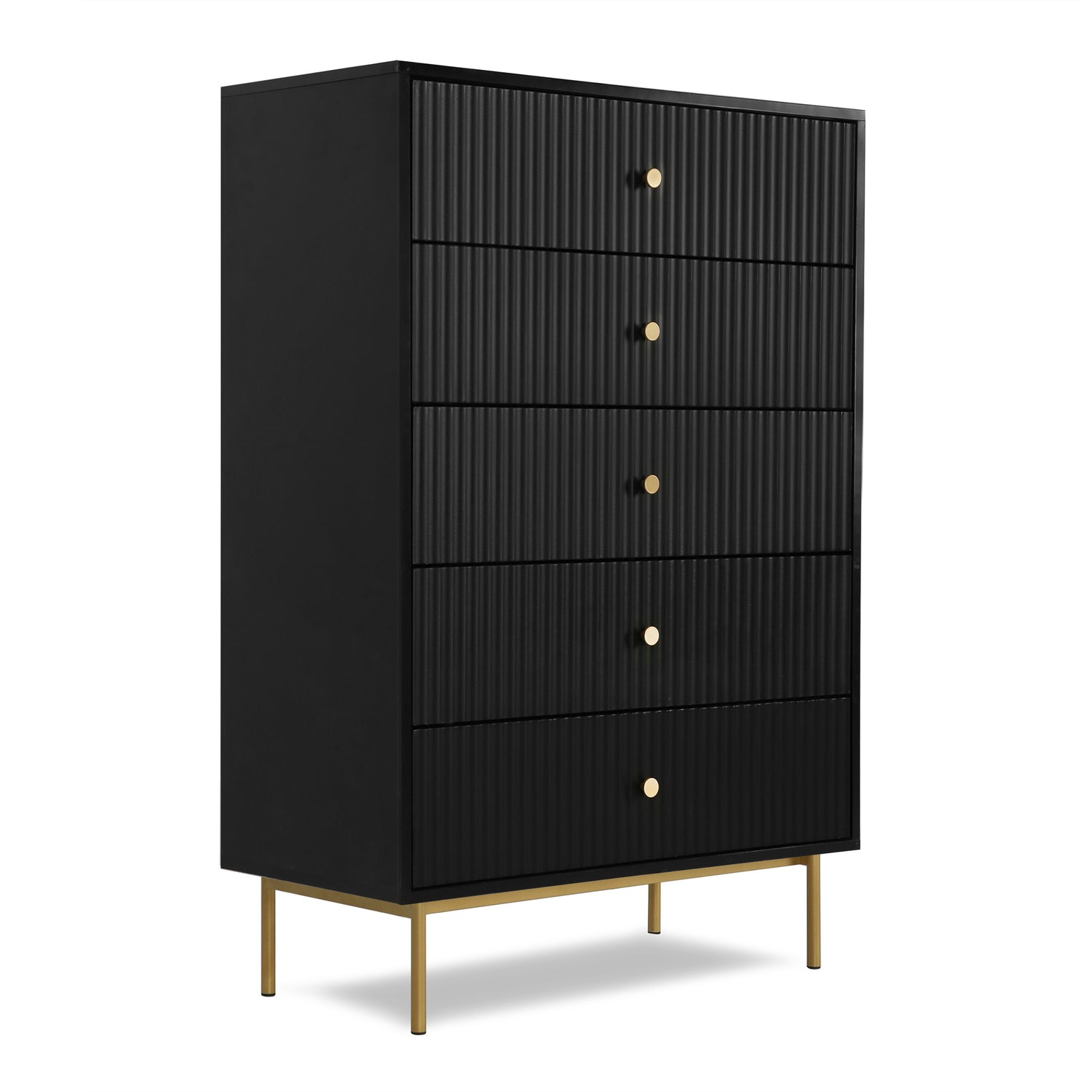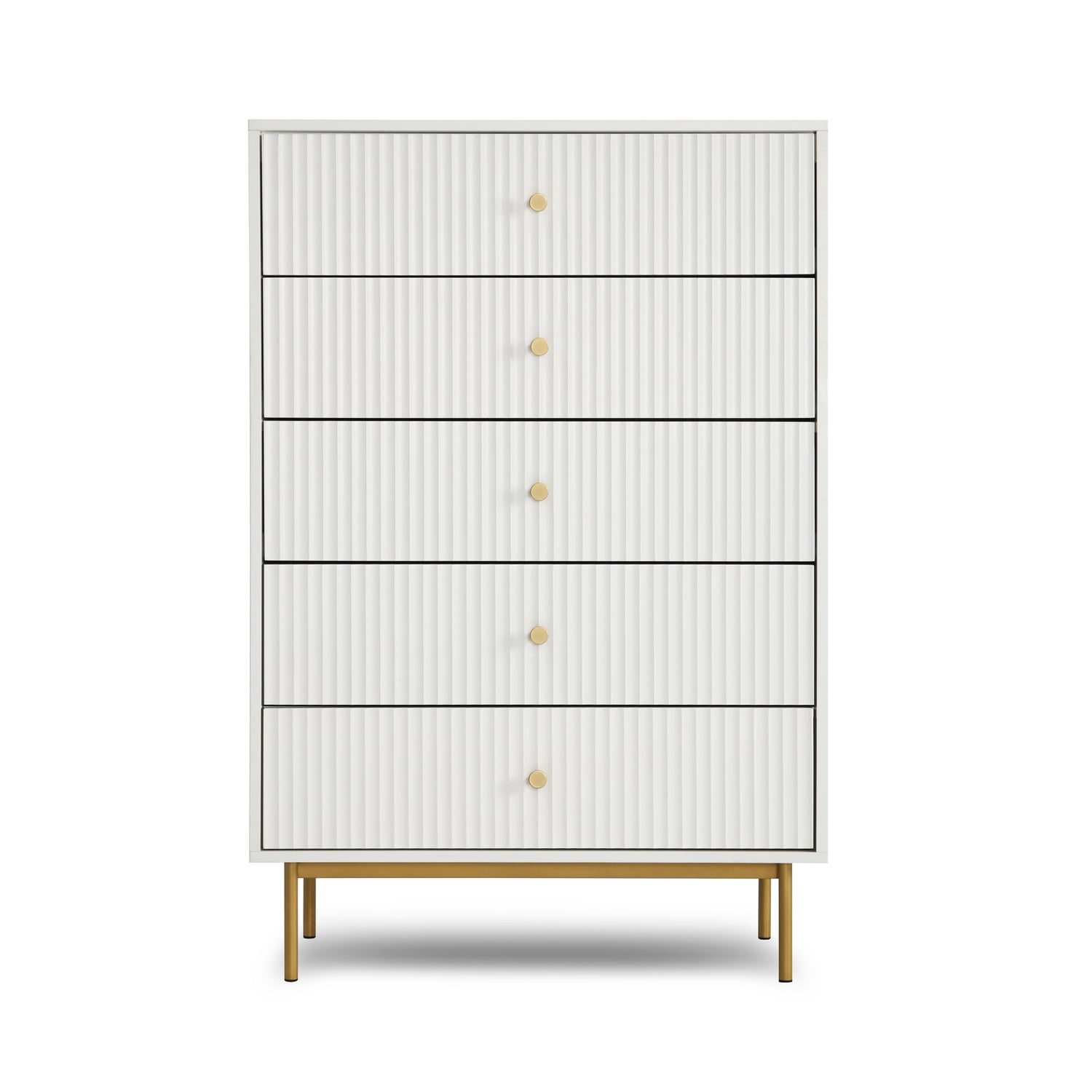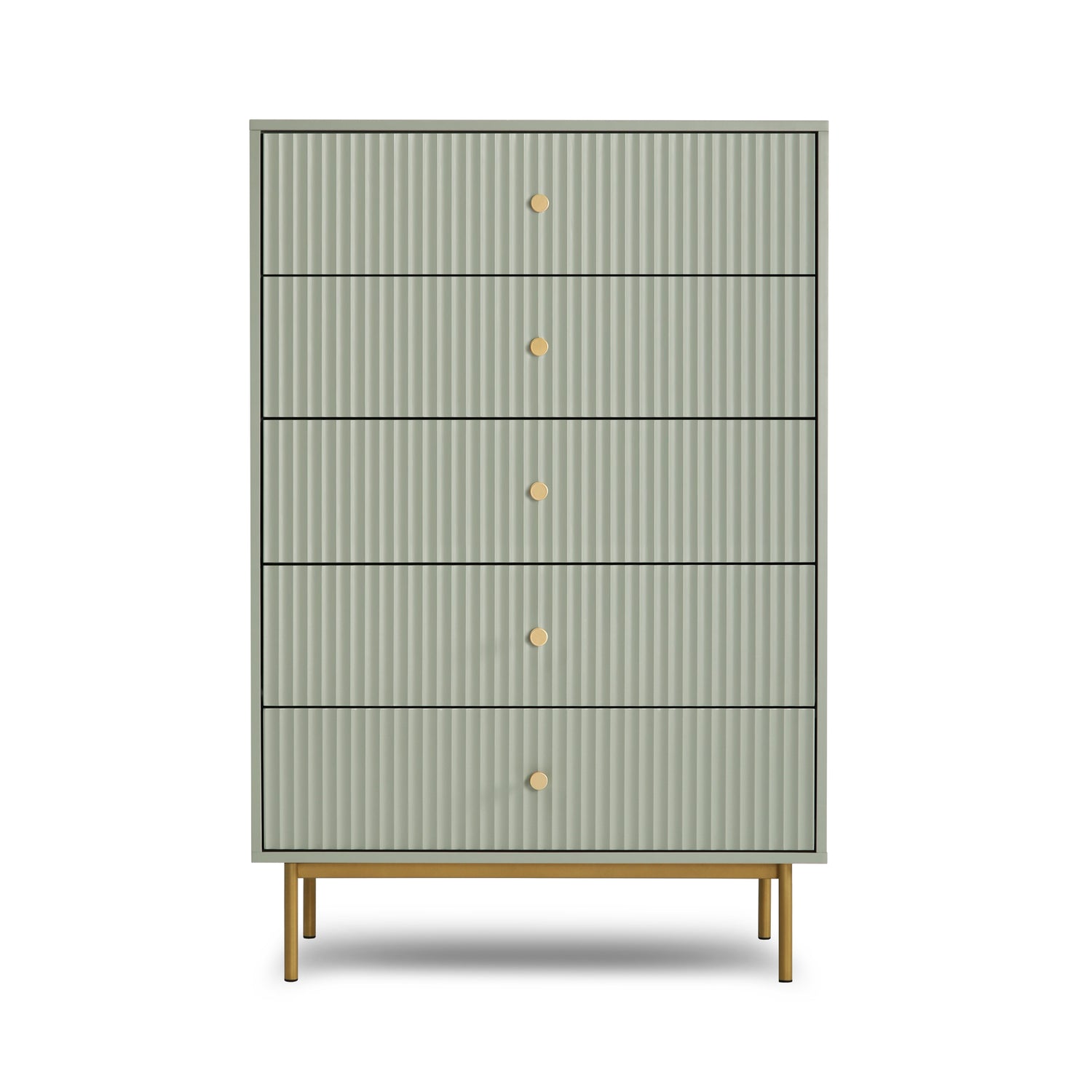 The Devon chest of 5 drawers is an elegant and practical piece designed to enhance bedroom storage. This large chest of drawers is crafted from a sturdy MDF frame, finished with a matte PU paint available in four stylish colours: white, black, grey, and sage. The wide chest of 5 drawers offers ample storage space, making it an ideal chest of drawers for bedroom settings. The metal handles and legs are coated with a durable powder finish, adding a touch of sophistication and ensuring the piece's longevity.