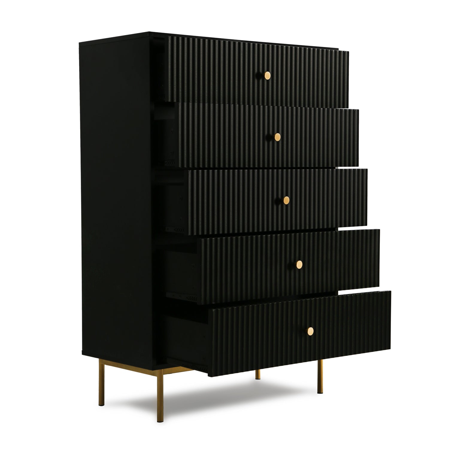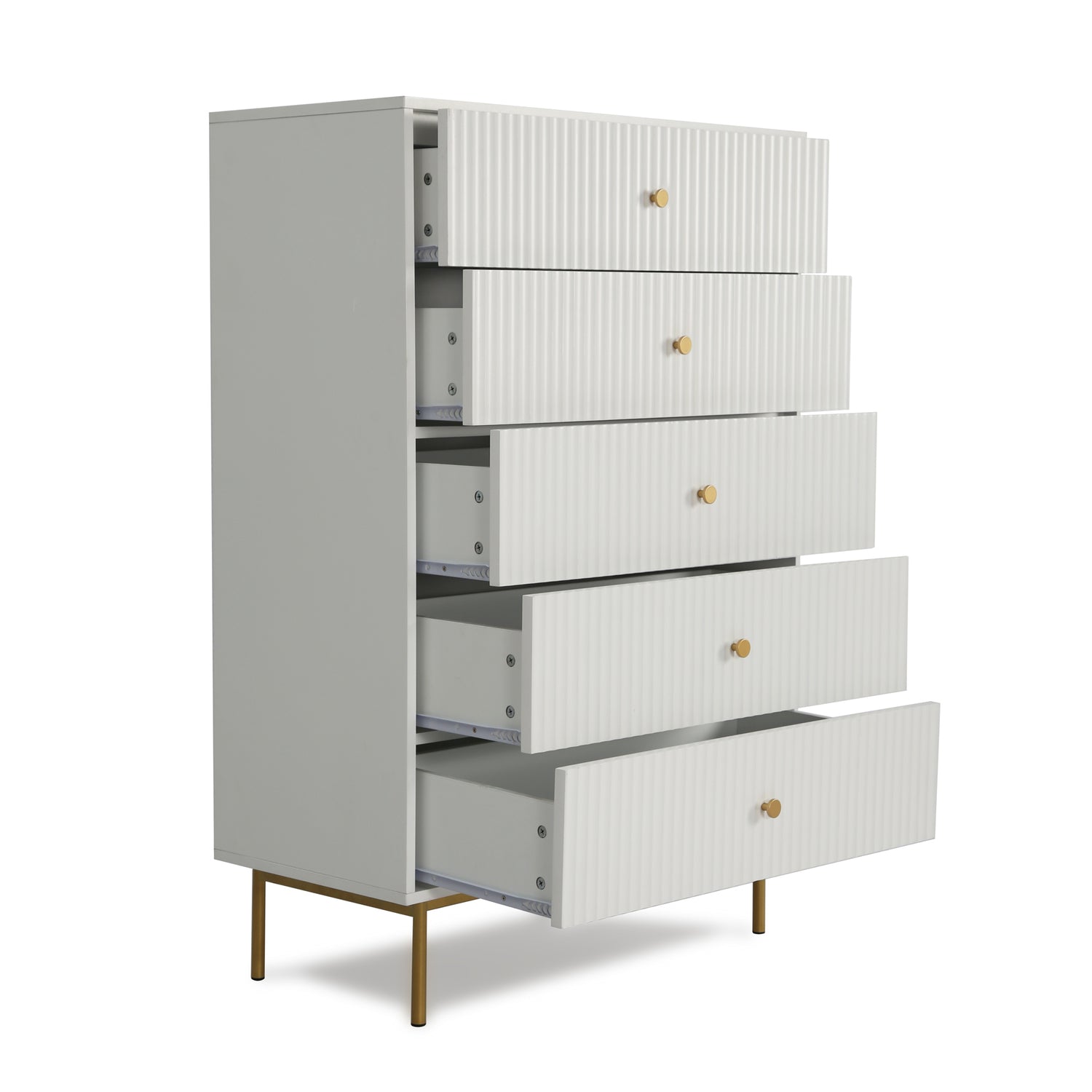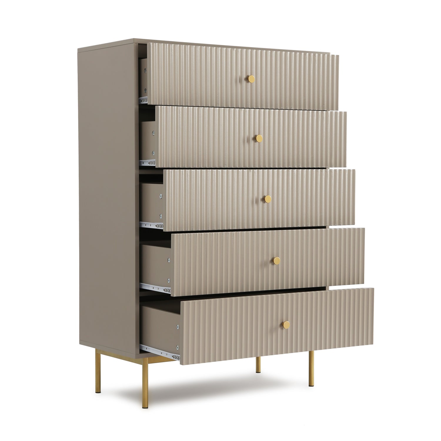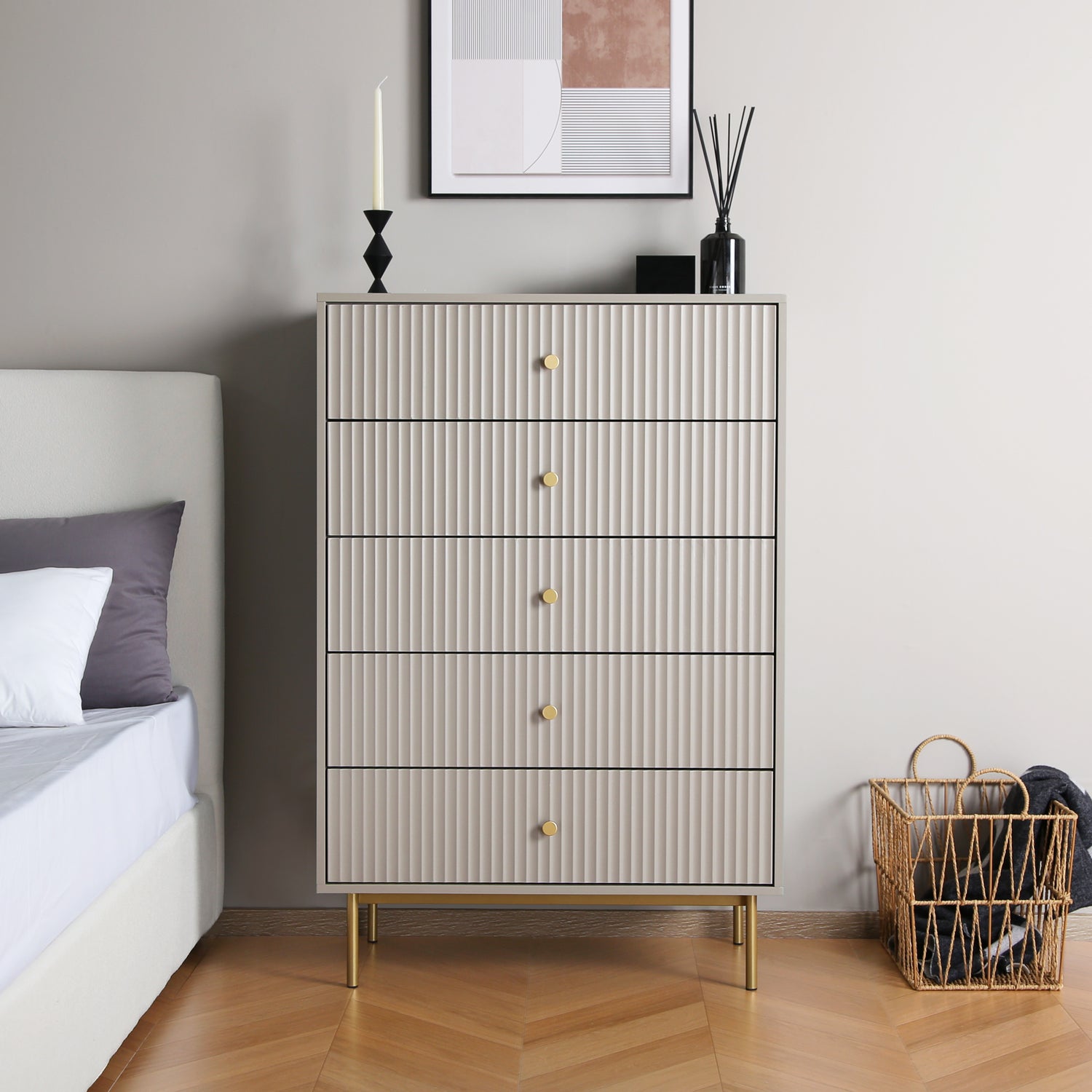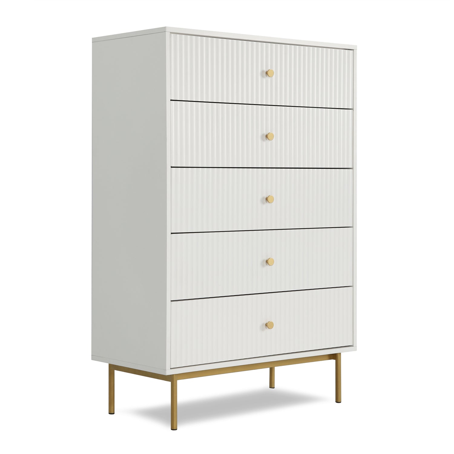 The Devon chest of 5 drawers is an elegant and practical piece designed to enhance bedroom storage. This large chest of drawers is crafted from a sturdy MDF frame, finished with a matte PU paint available in four stylish colours: white, black, grey, and sage. The wide chest of 5 drawers offers ample storage space, making it an ideal chest of drawers for bedroom settings. The metal handles and legs are coated with a durable powder finish, adding a touch of sophistication and ensuring the piece's longevity.