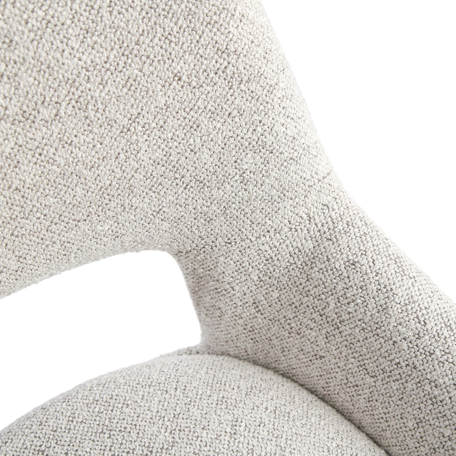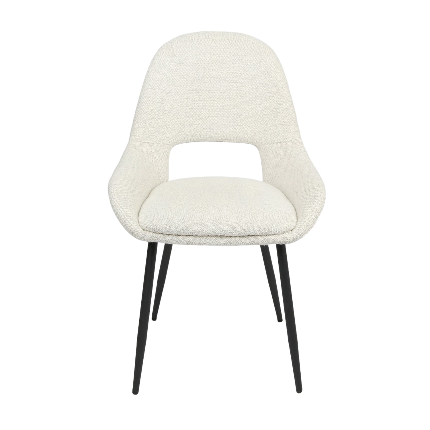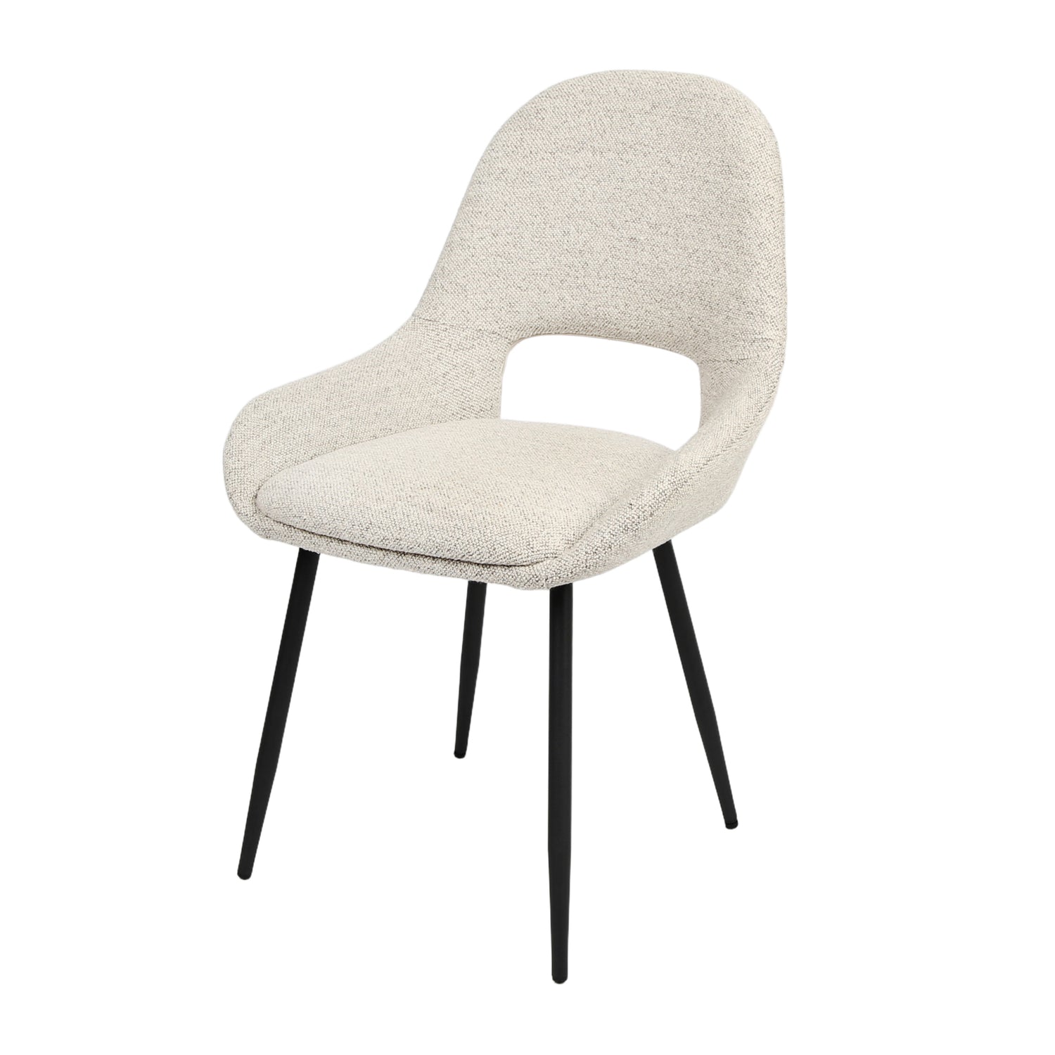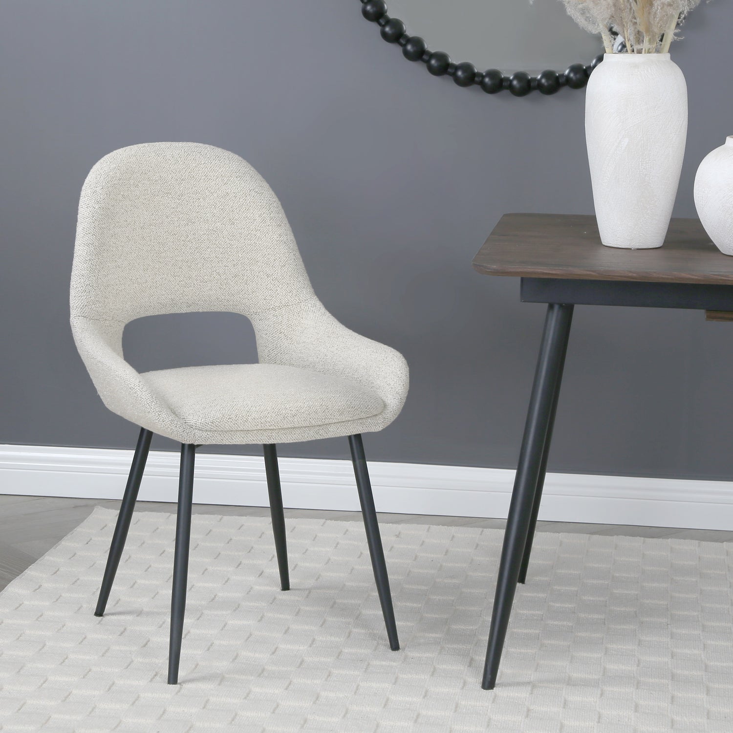 Supported by a sleek black sandy iron base with adjustable studs for stability, it’s designed to adapt to a variety of floor surfaces—ideal for both compact apartments and spacious homes. Available in soft cream and warm beige, this modern dining chair pairs effortlessly with wood, glass, or metal dining tables, and also functions beautifully as a side chair or statement piece in a bedroom or hallway.