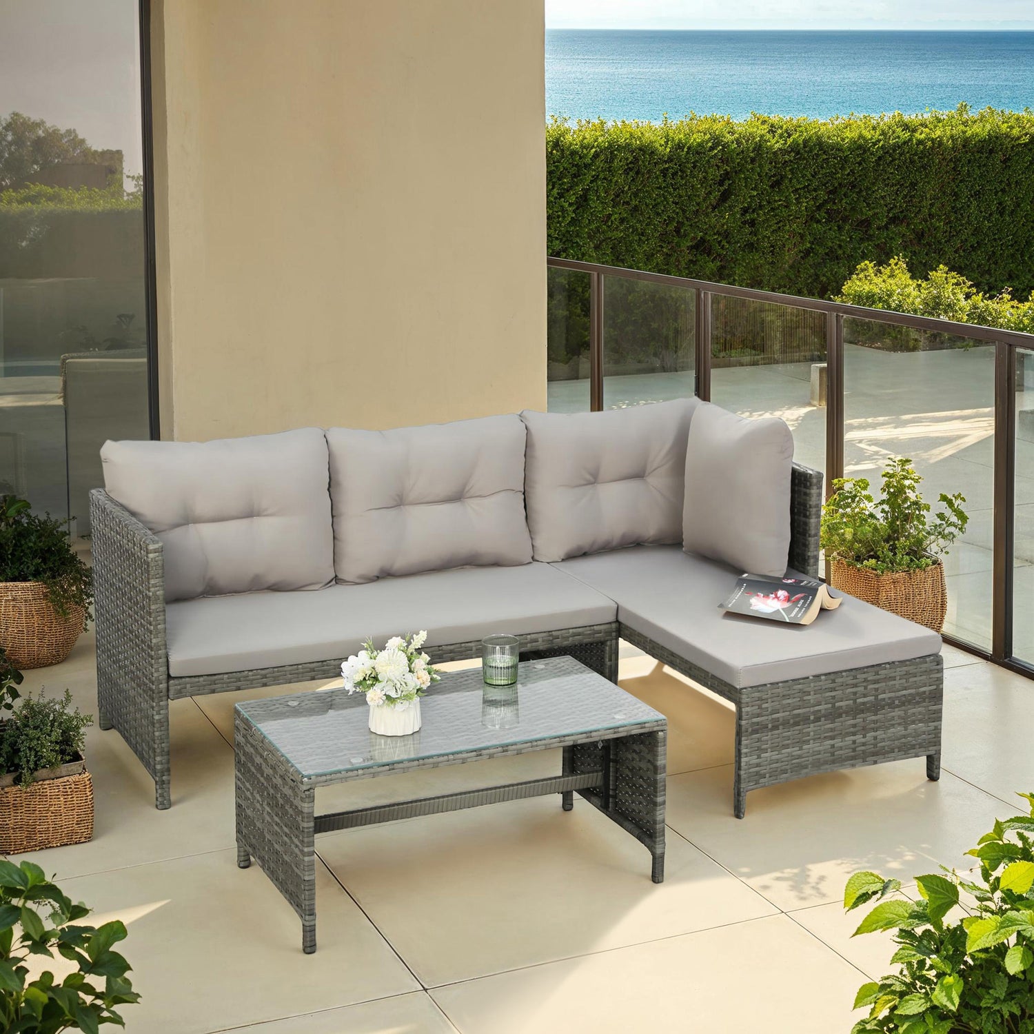This rattan corner sofa with coffee table is large enough to seat up to three guests comfortably (maximum 4), but compact enough to allow liberal enjoyment of your outdoor space.