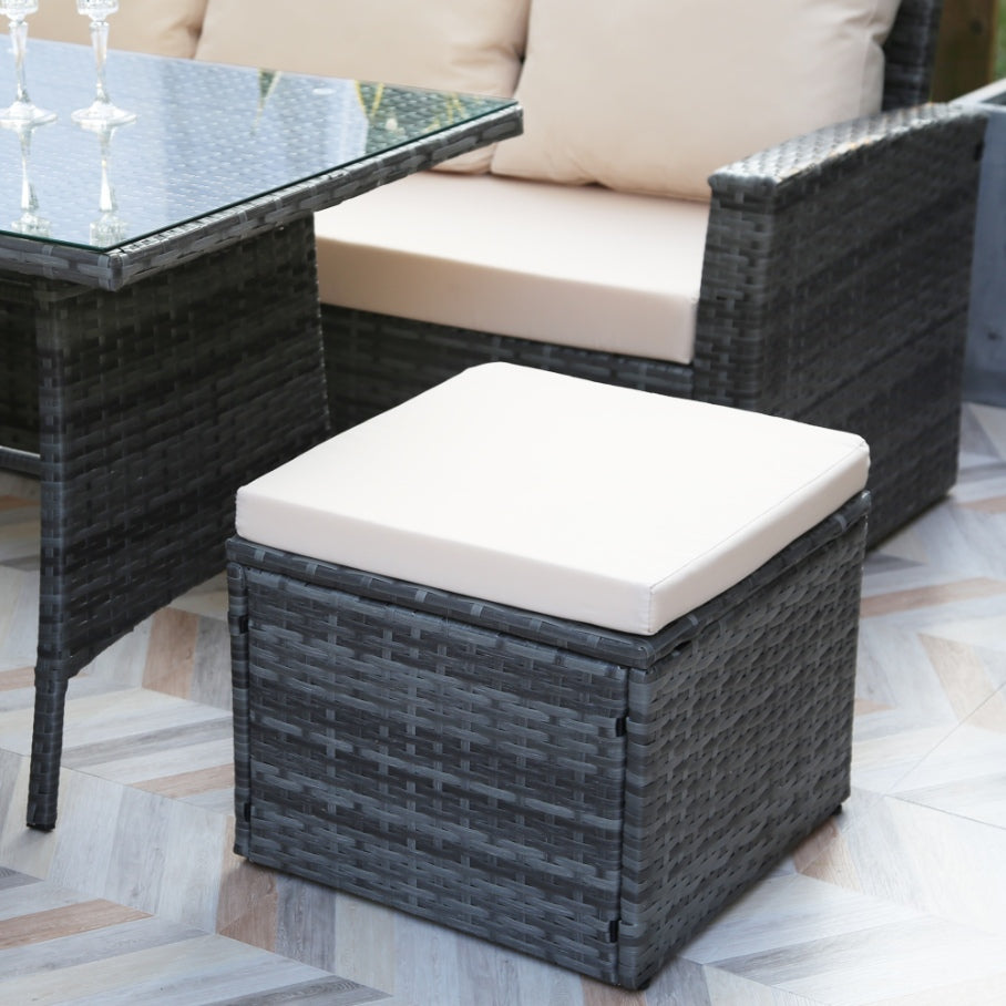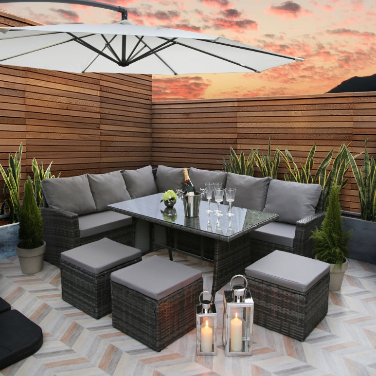 The Pelias rattan corner sofa and dining set is a great choice for informal dining. The corner sofa can comfortably seat six people, and with the addition of three footstools that can be used as additional seating, the set can accommodate up to nine people. This makes it perfect for outdoor dinner parties with friends and family.