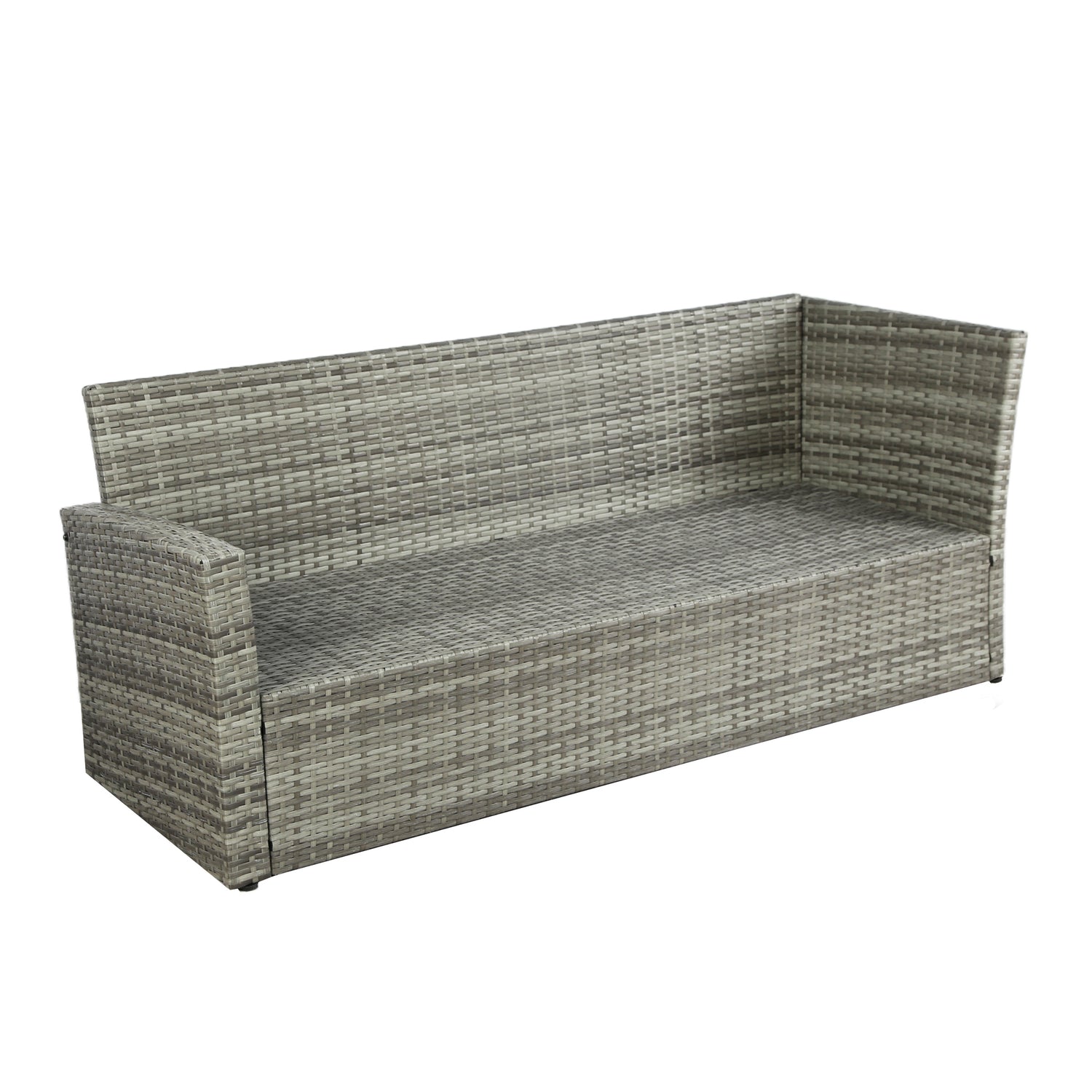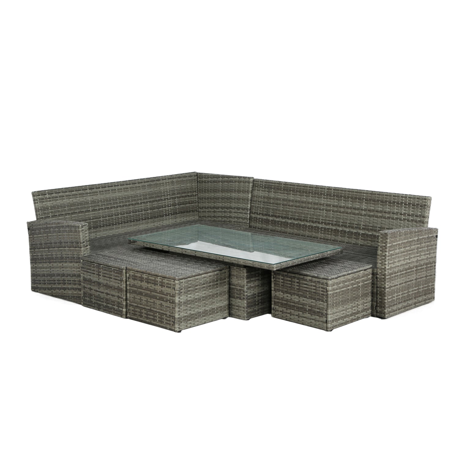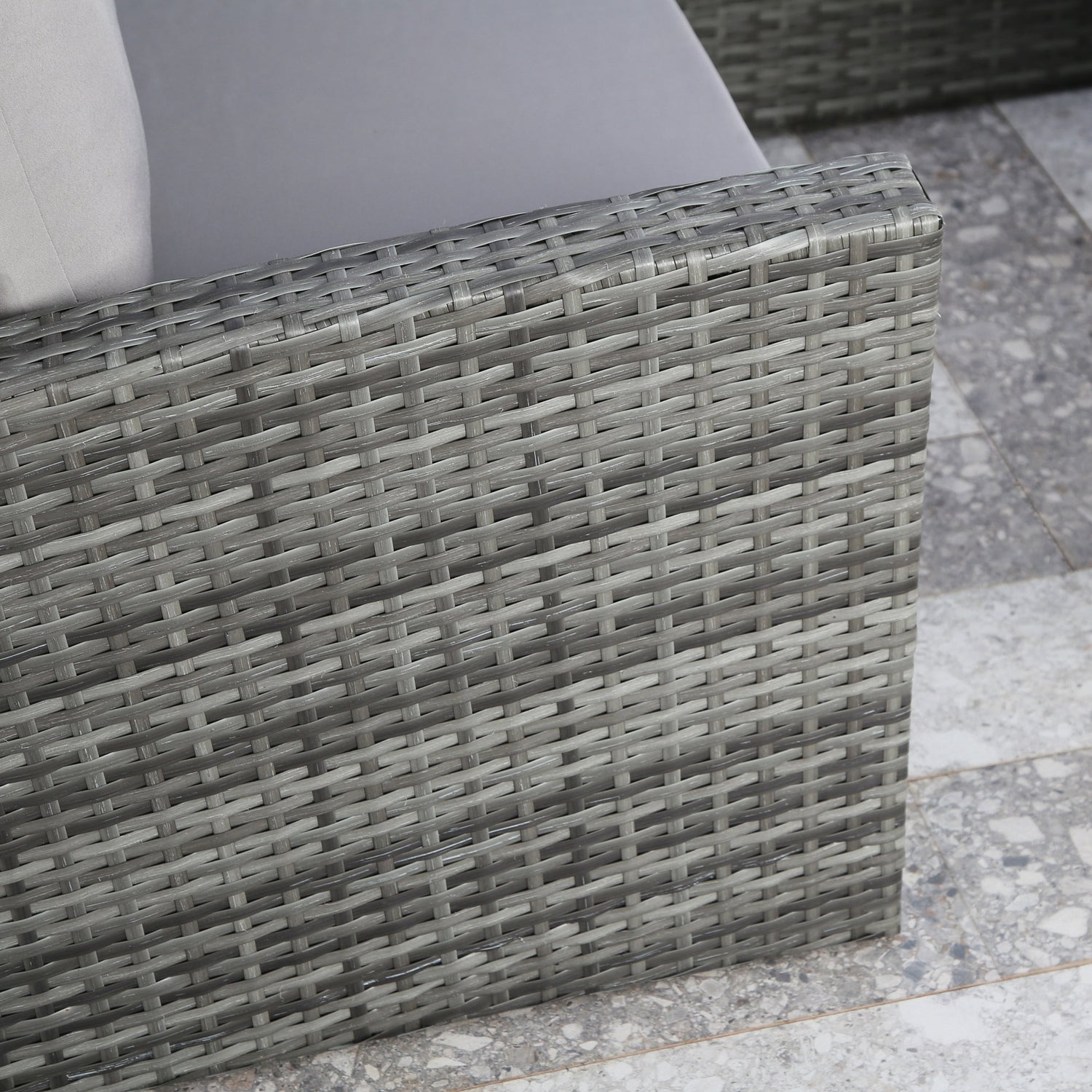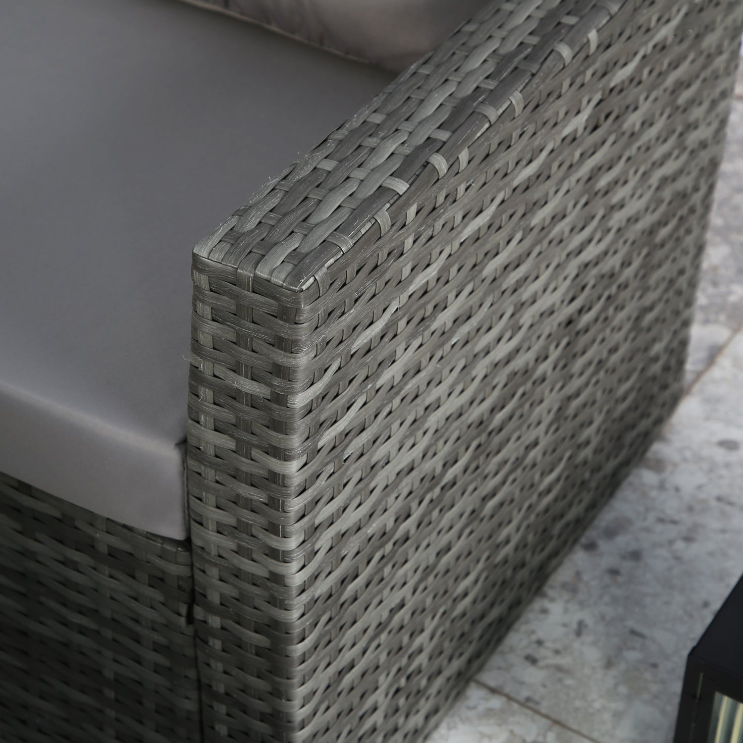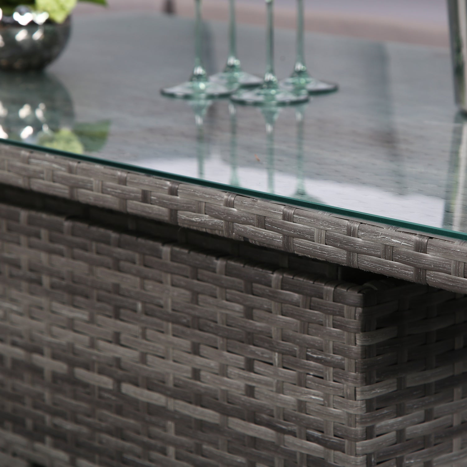 Each piece in this garden corner sofa set is built with a sturdy powder coated metal frame and finished in a sleek grey rattan weave. The corner sofa comes complete with weather-resistant cushions and plush back pillows to ensure comfortable seating, while the adjustable table features a 5mm-thick tempered glass top for a stylish and practical finishing touch.