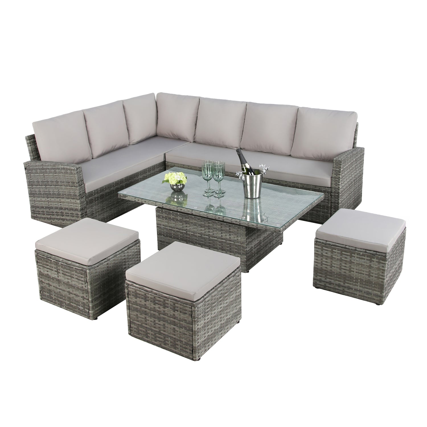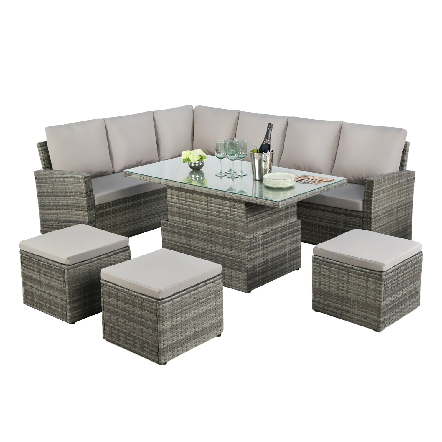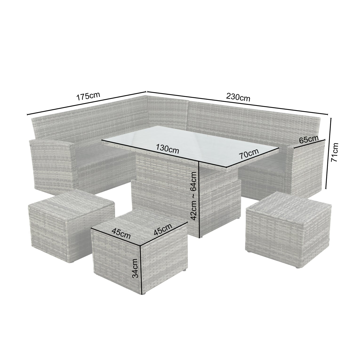 The versatile design includes a spacious corner sofa, three ottomans for extra seating, and a height-adjustable table that easily transitions from a casual coffee table to a dining table.