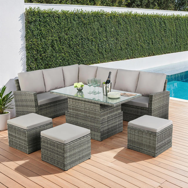 The versatile design includes a spacious corner sofa, three ottomans for extra seating, and a height-adjustable table that easily transitions from a casual coffee table to a dining table.