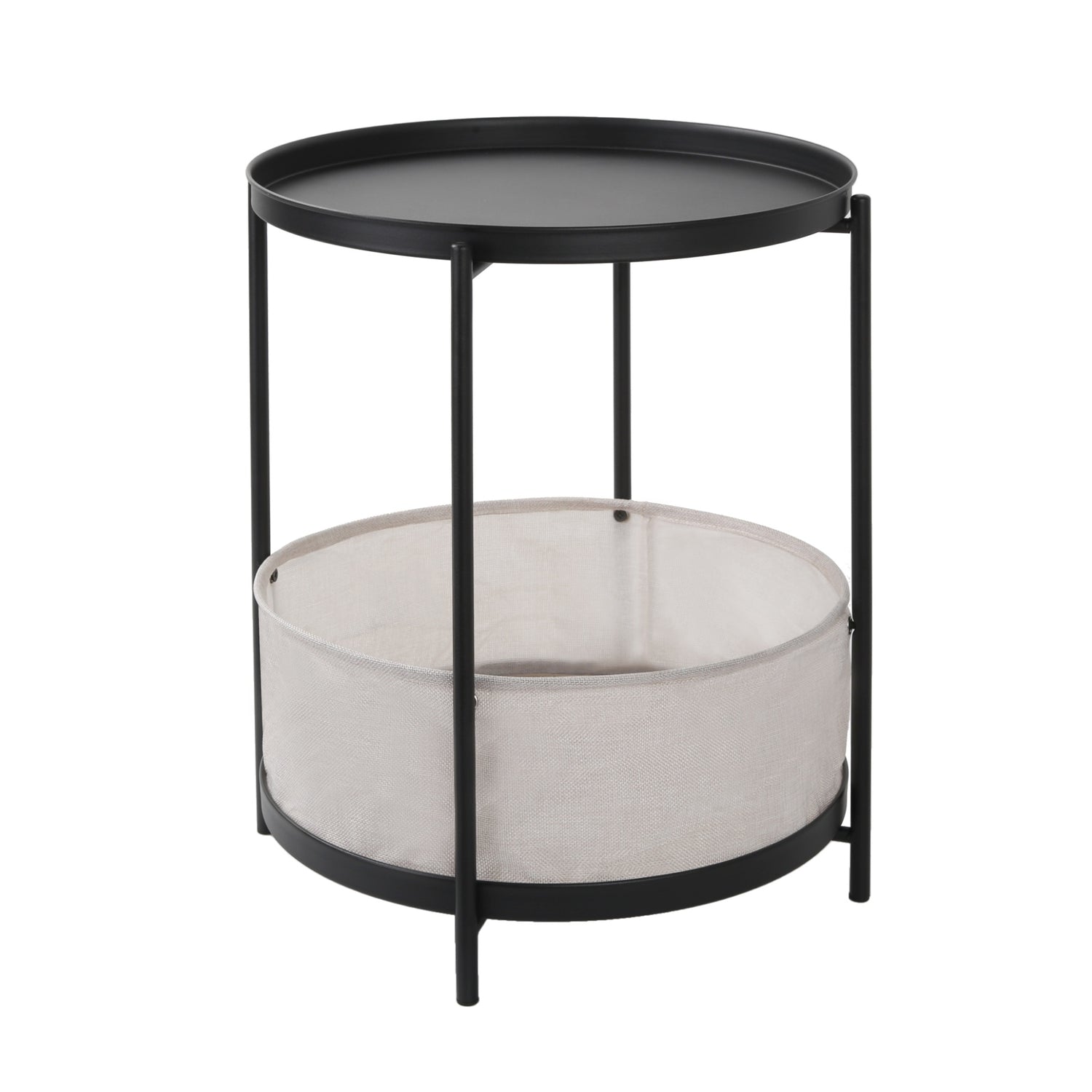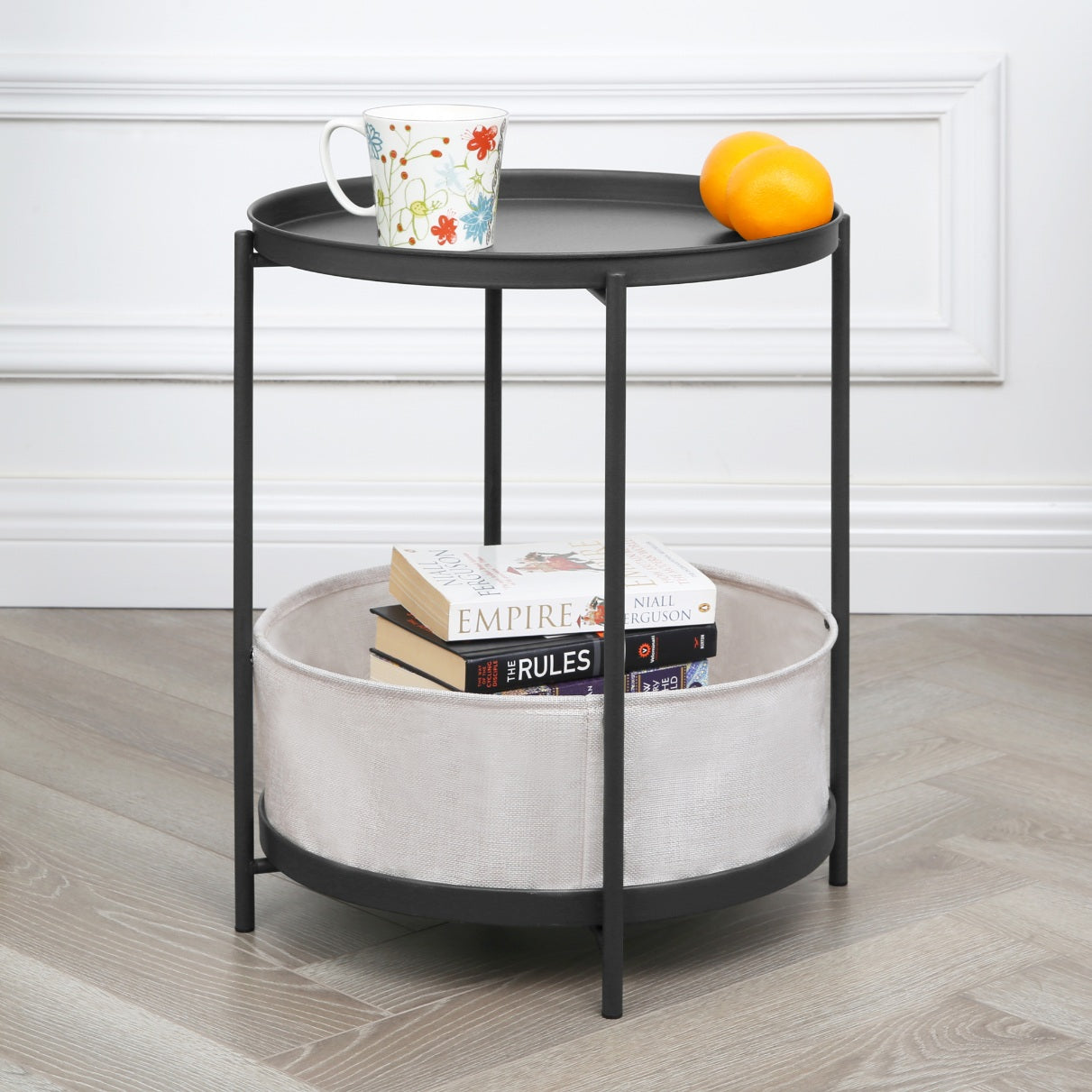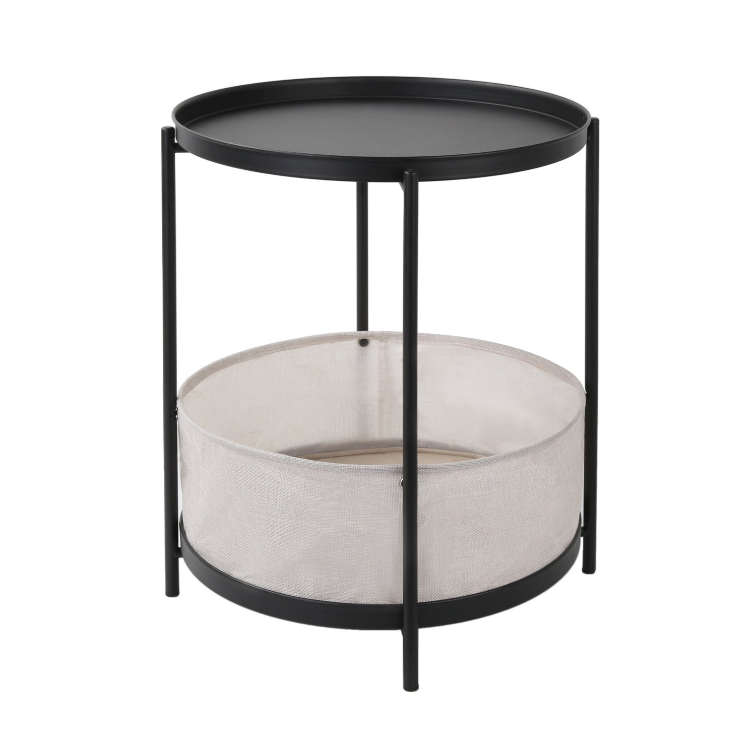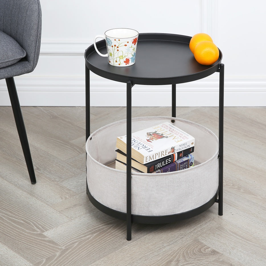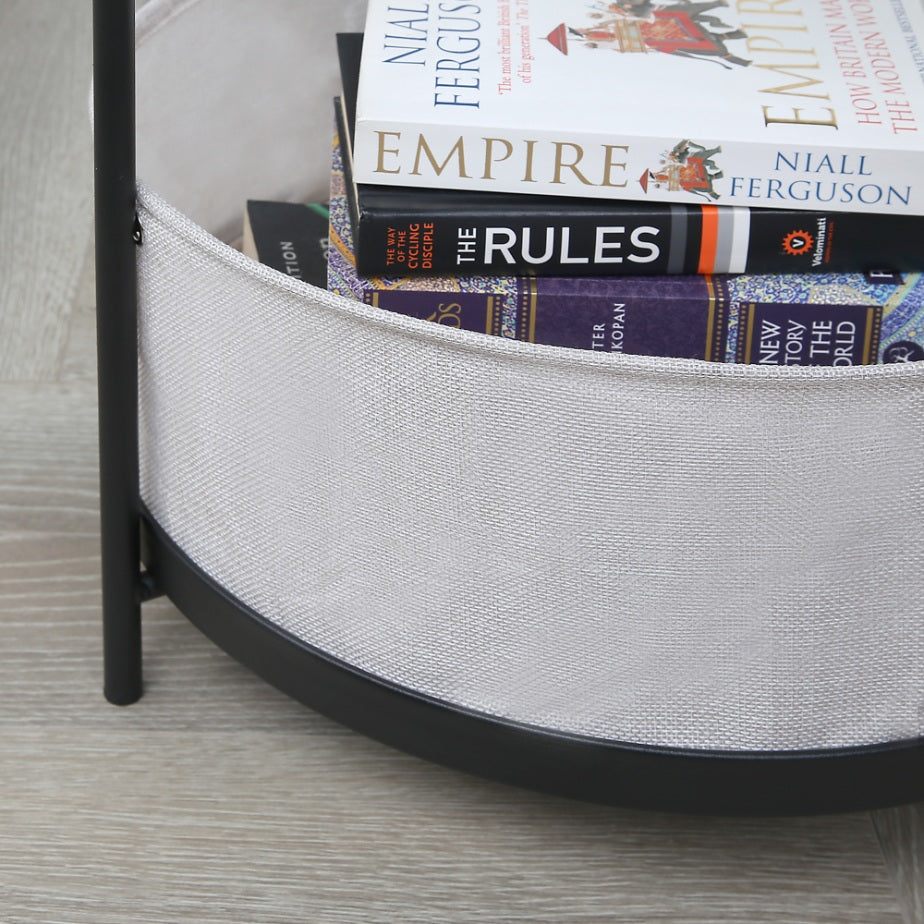 - This side-coffee table has a rounded basket on the lower level to prevent items from falling off the base.