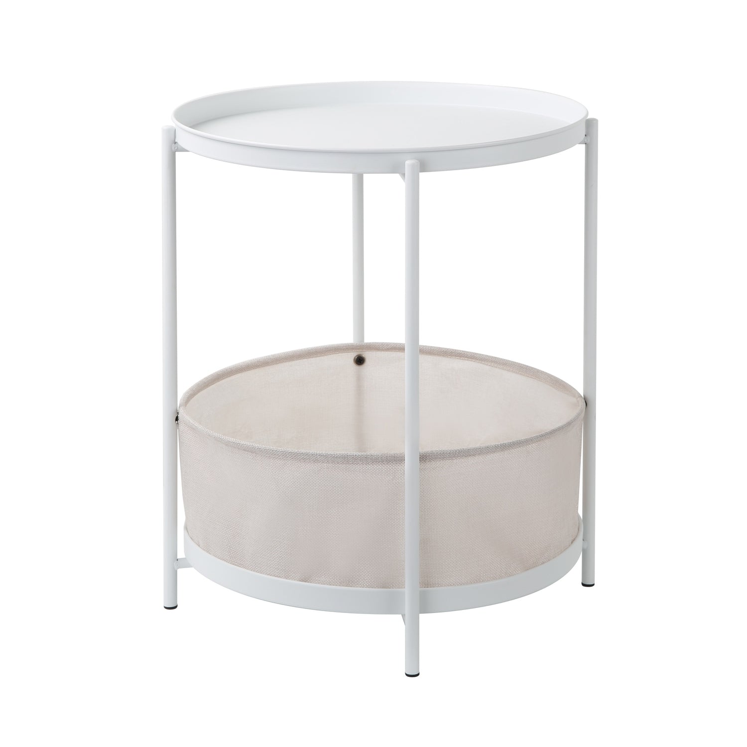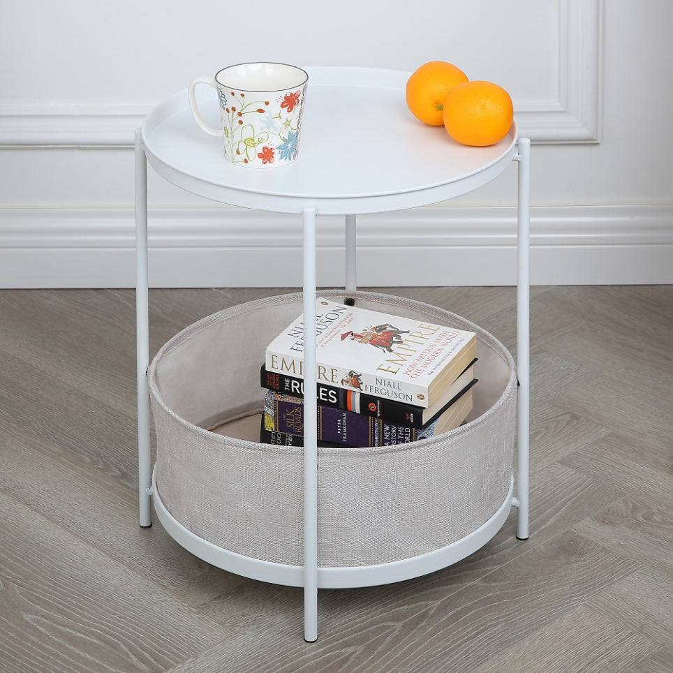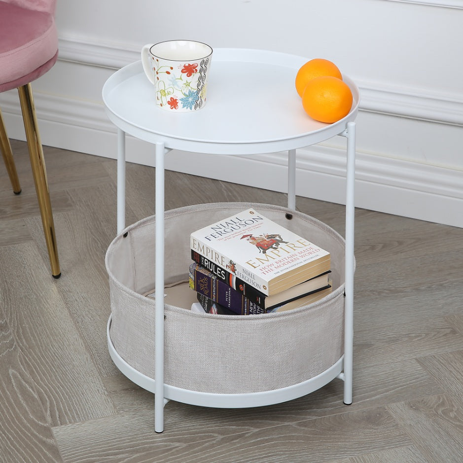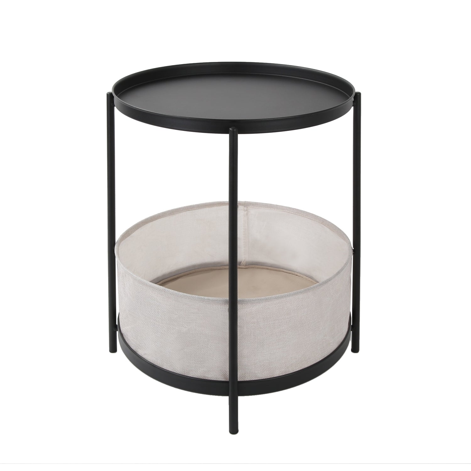 - This side-coffee table has a rounded basket on the lower level to prevent items from falling off the base.