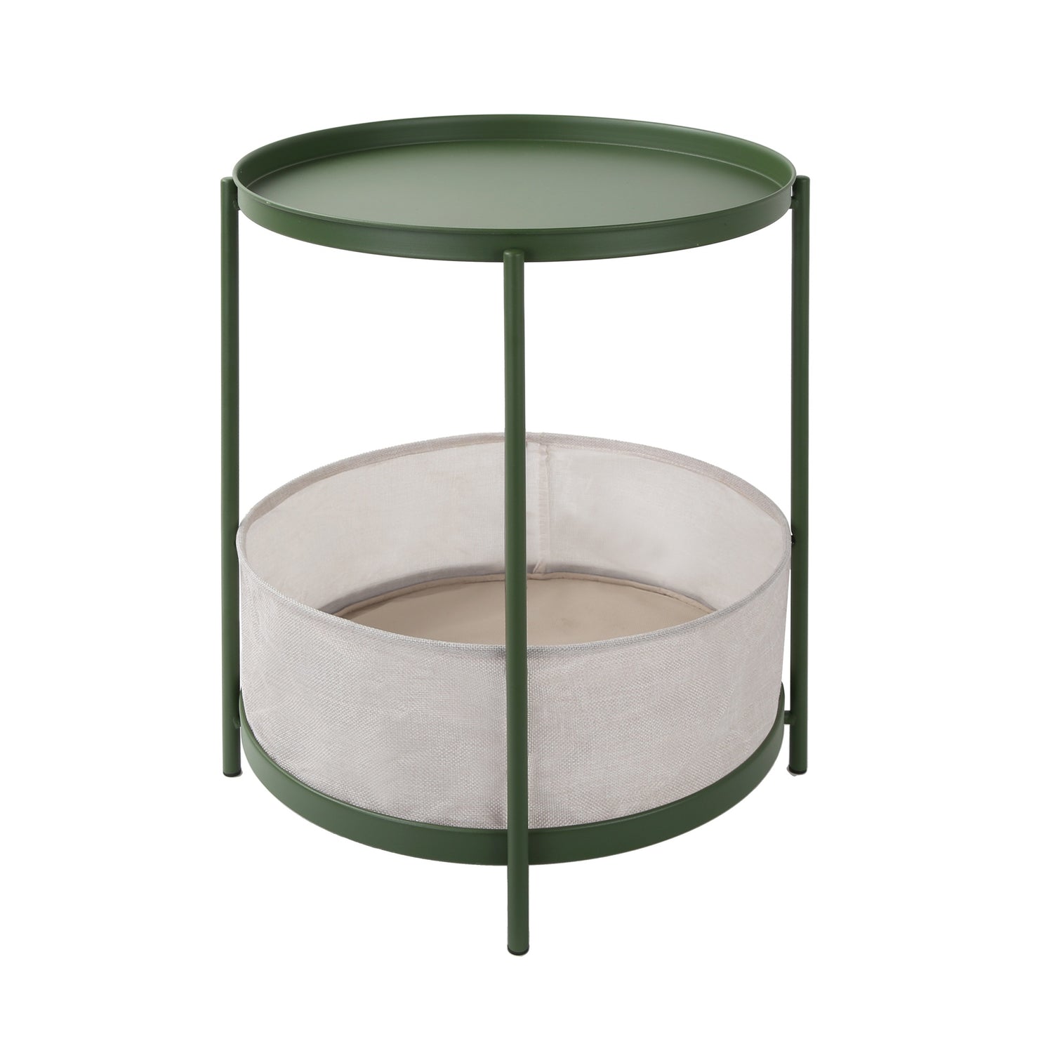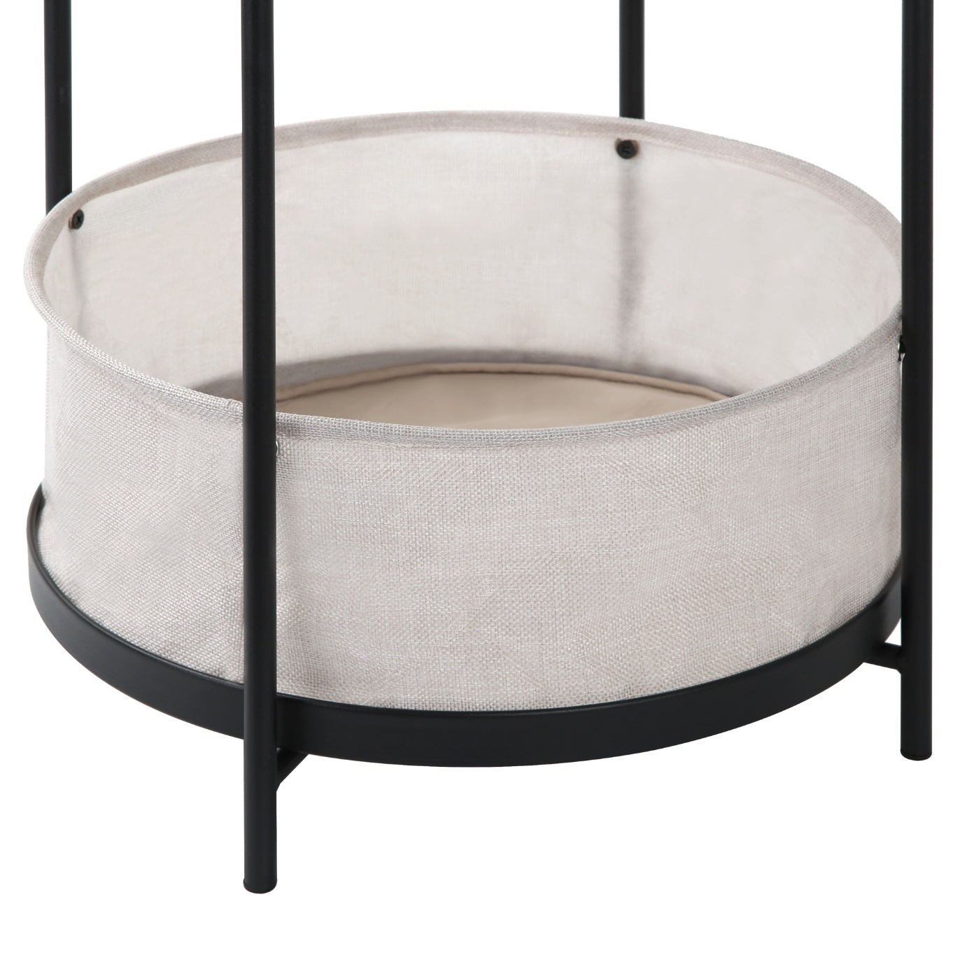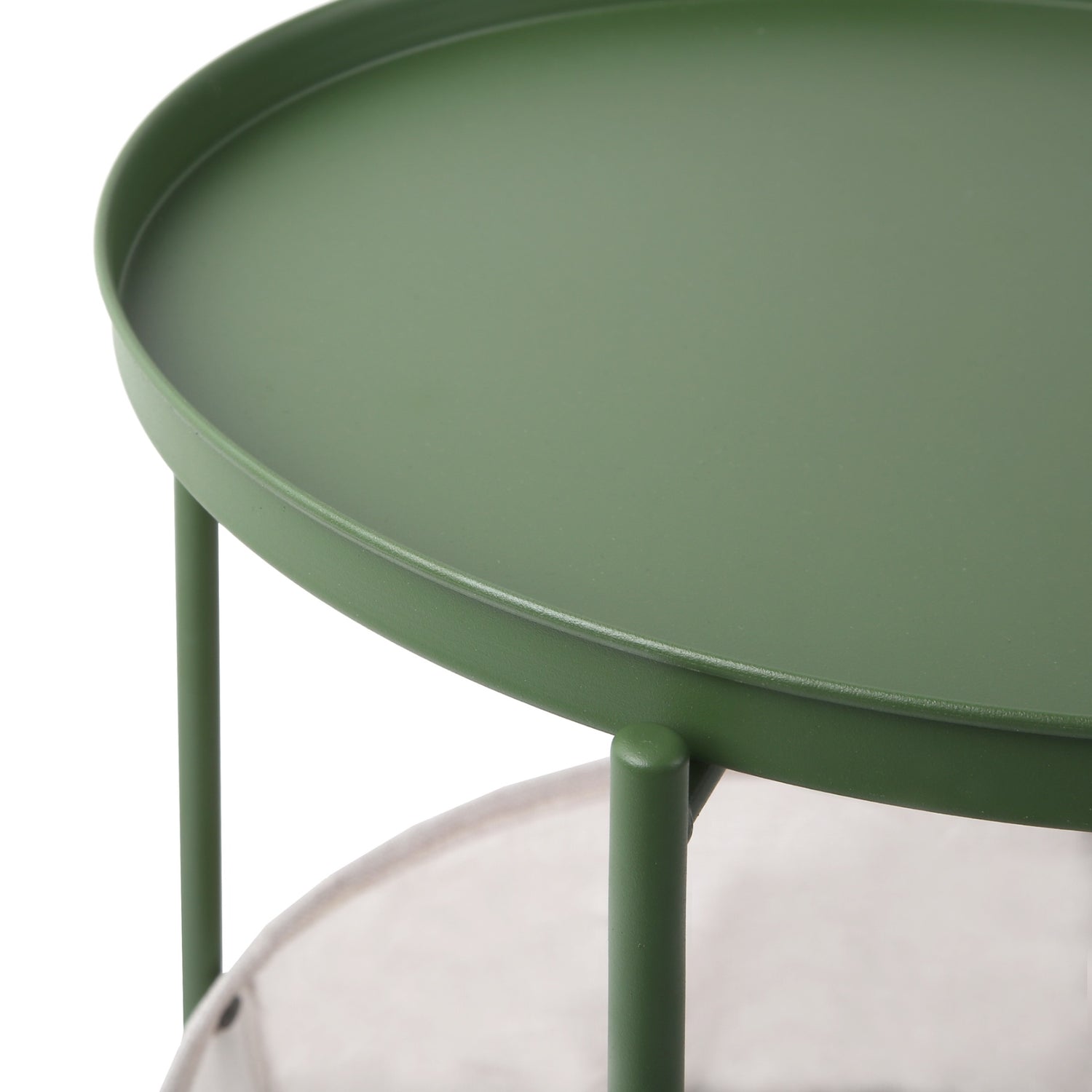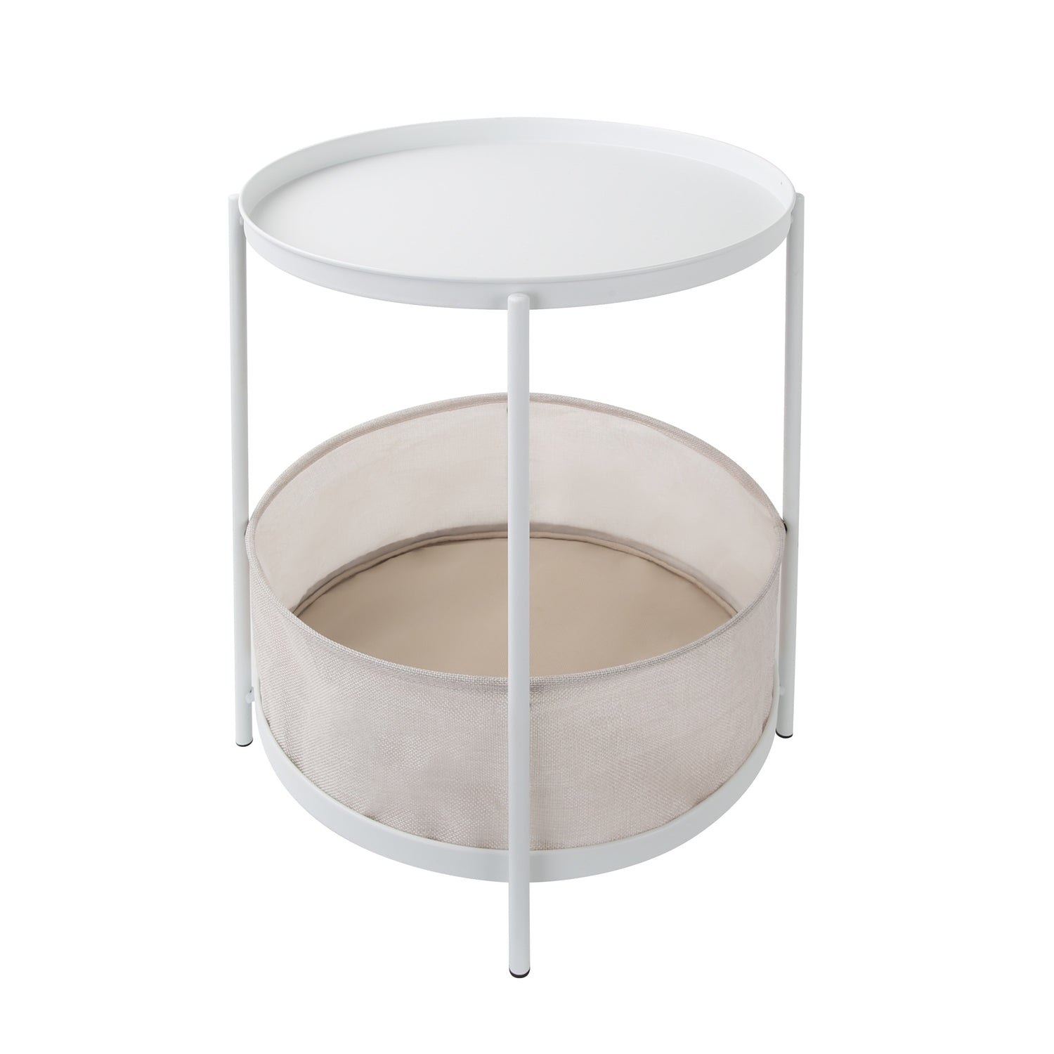 - This side-coffee table has a rounded basket on the lower level to prevent items from falling off the base.