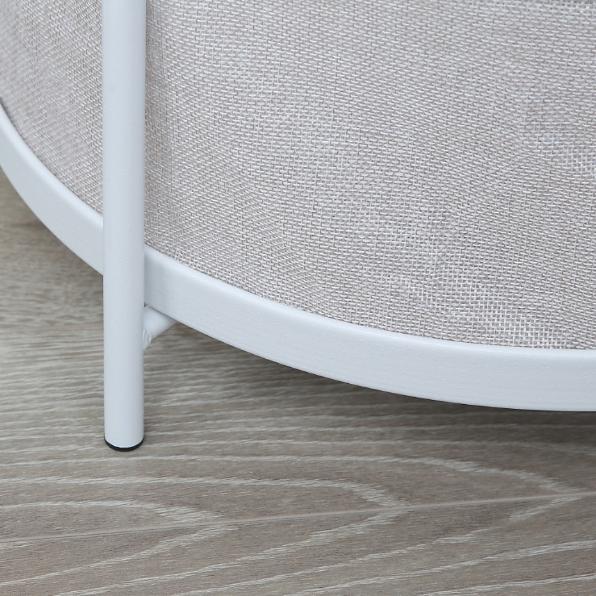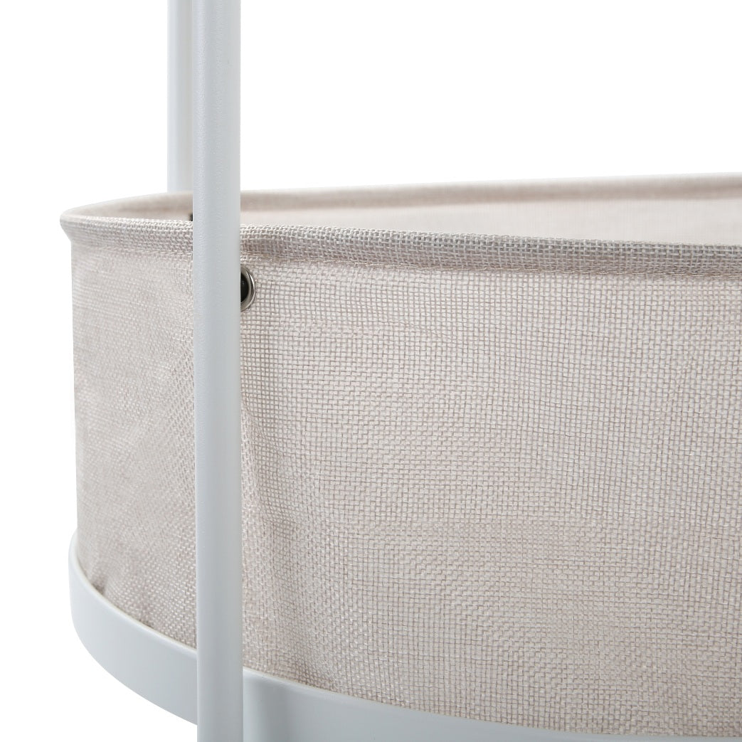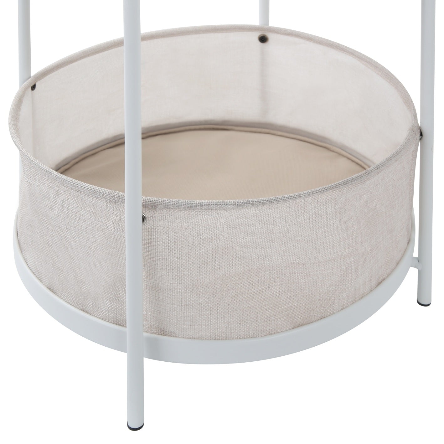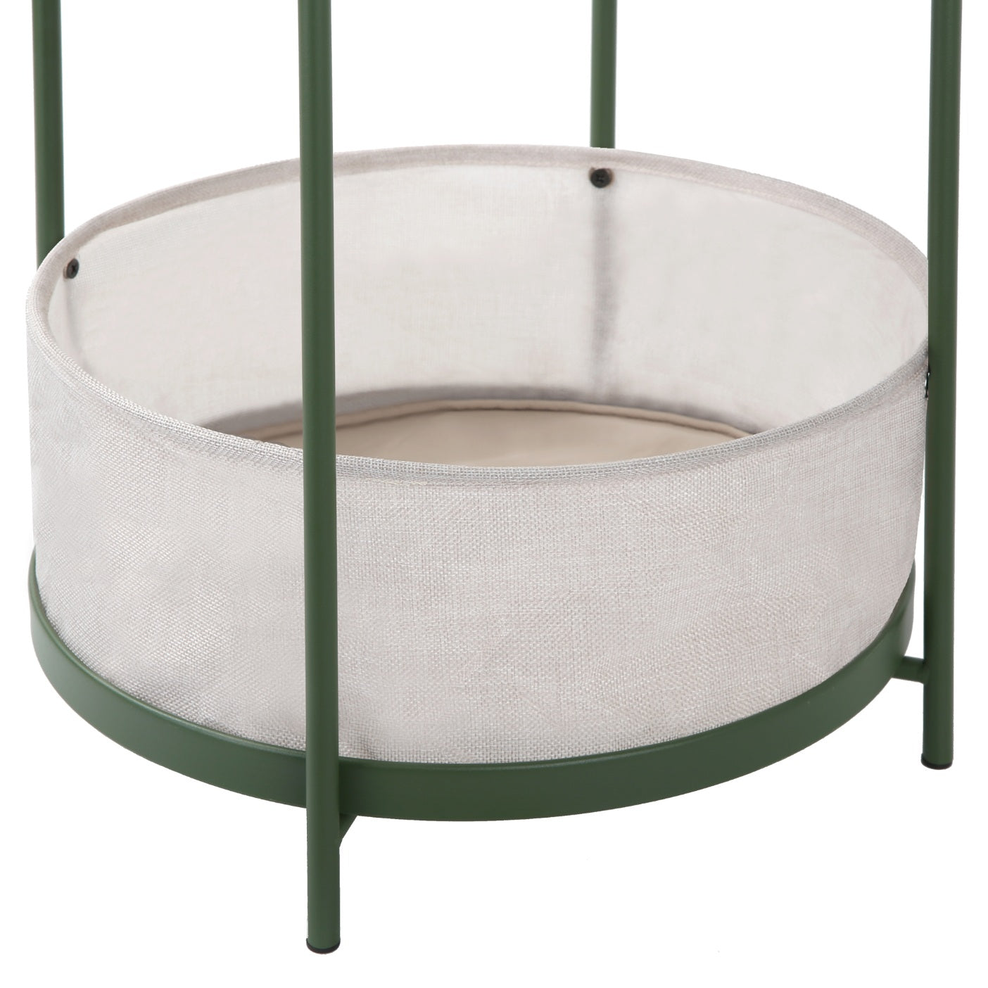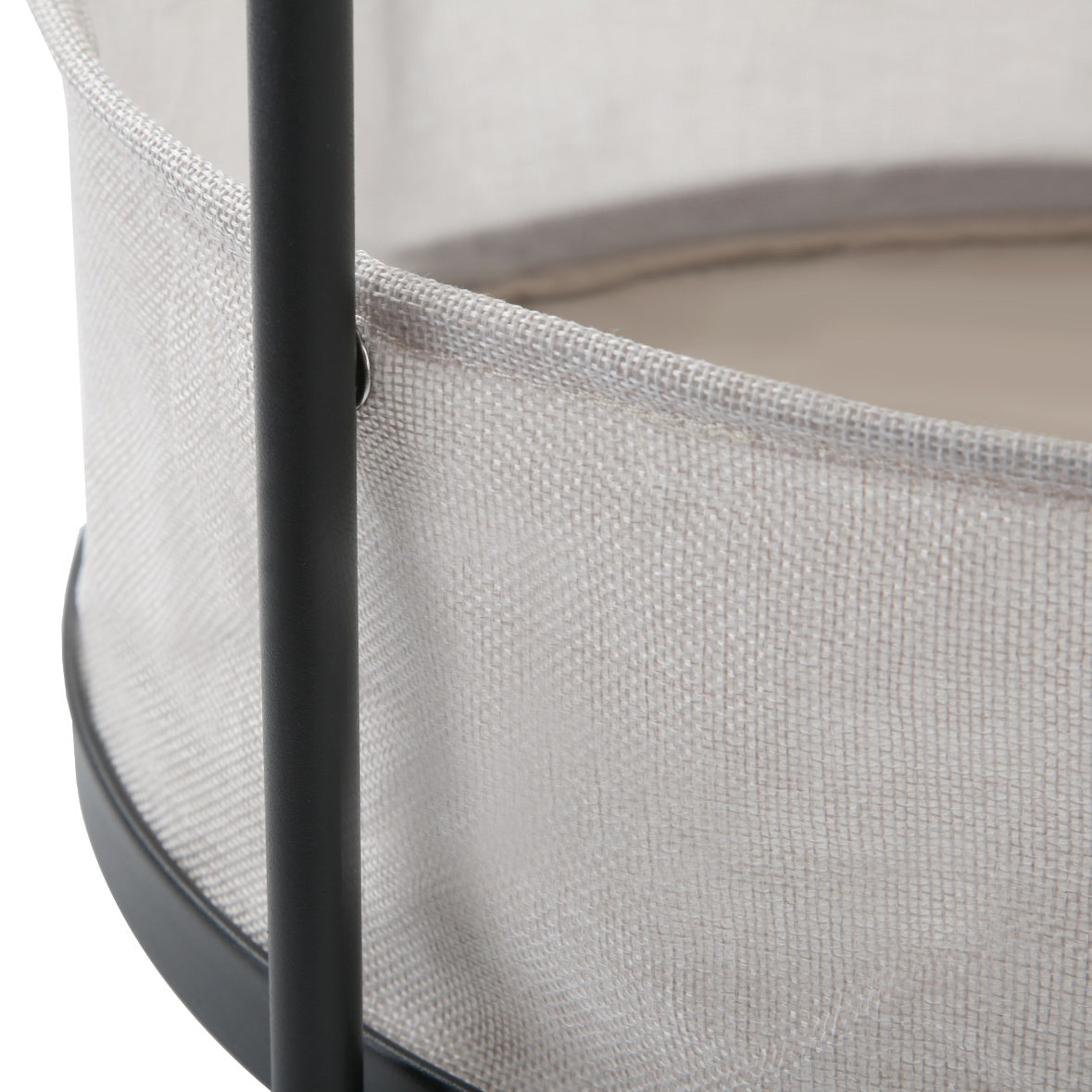 - This side-coffee table has a rounded basket on the lower level to prevent items from falling off the base.