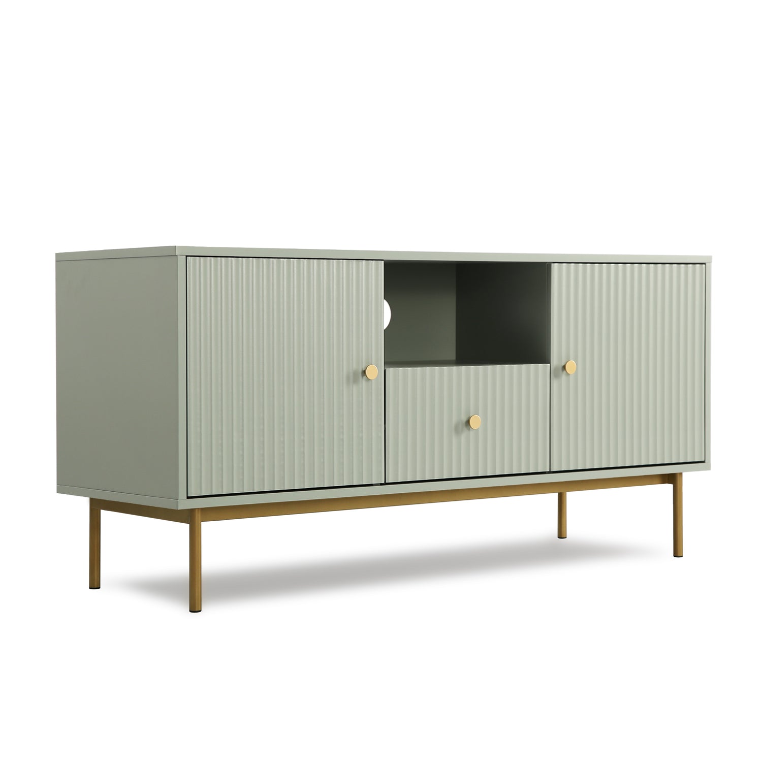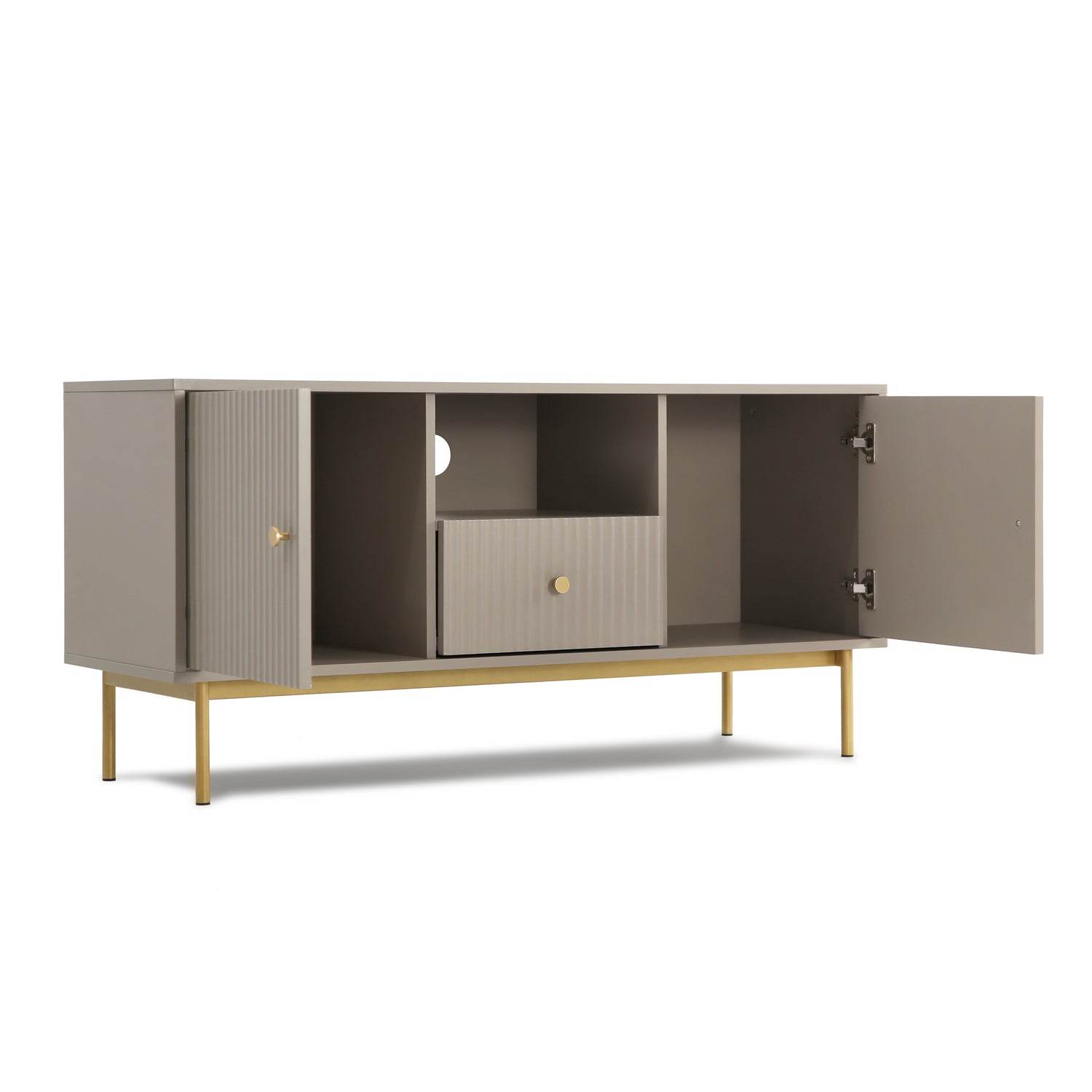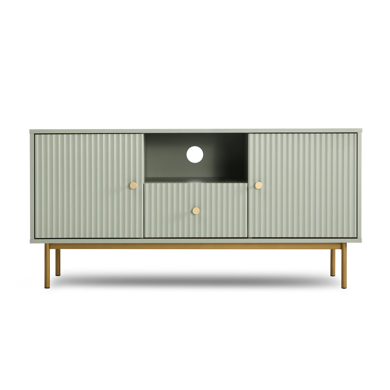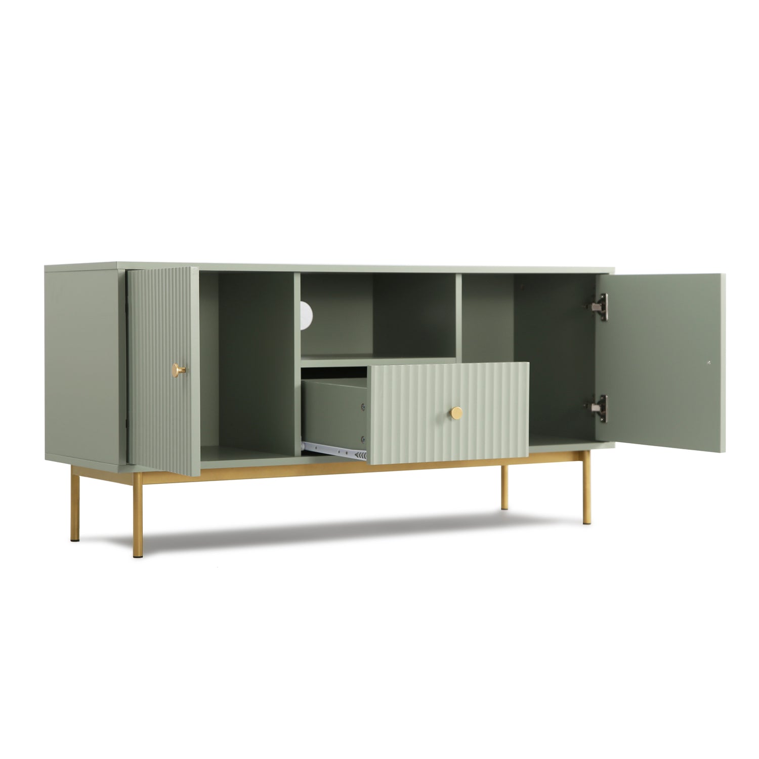 The Devon wide TV media unit is a sophisticated and functional piece designed to enhance your living room. Constructed from a sturdy MDF frame and finished with a matte PU paint, this TV stand is available in four elegant colours: white, black, grey, and sage. The wide TV unit features ample storage options, ideal for organising. The handles and legs are made of metal with a durable powder coating, adding a modern touch and ensuring long-lasting durability.