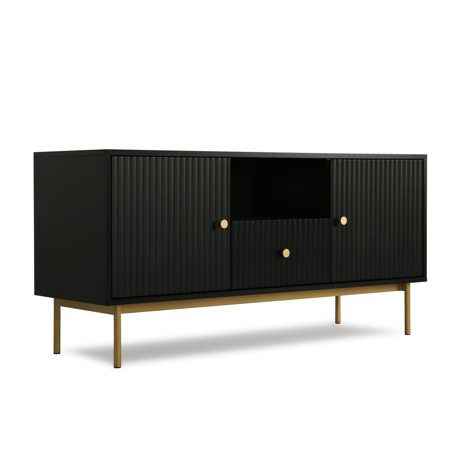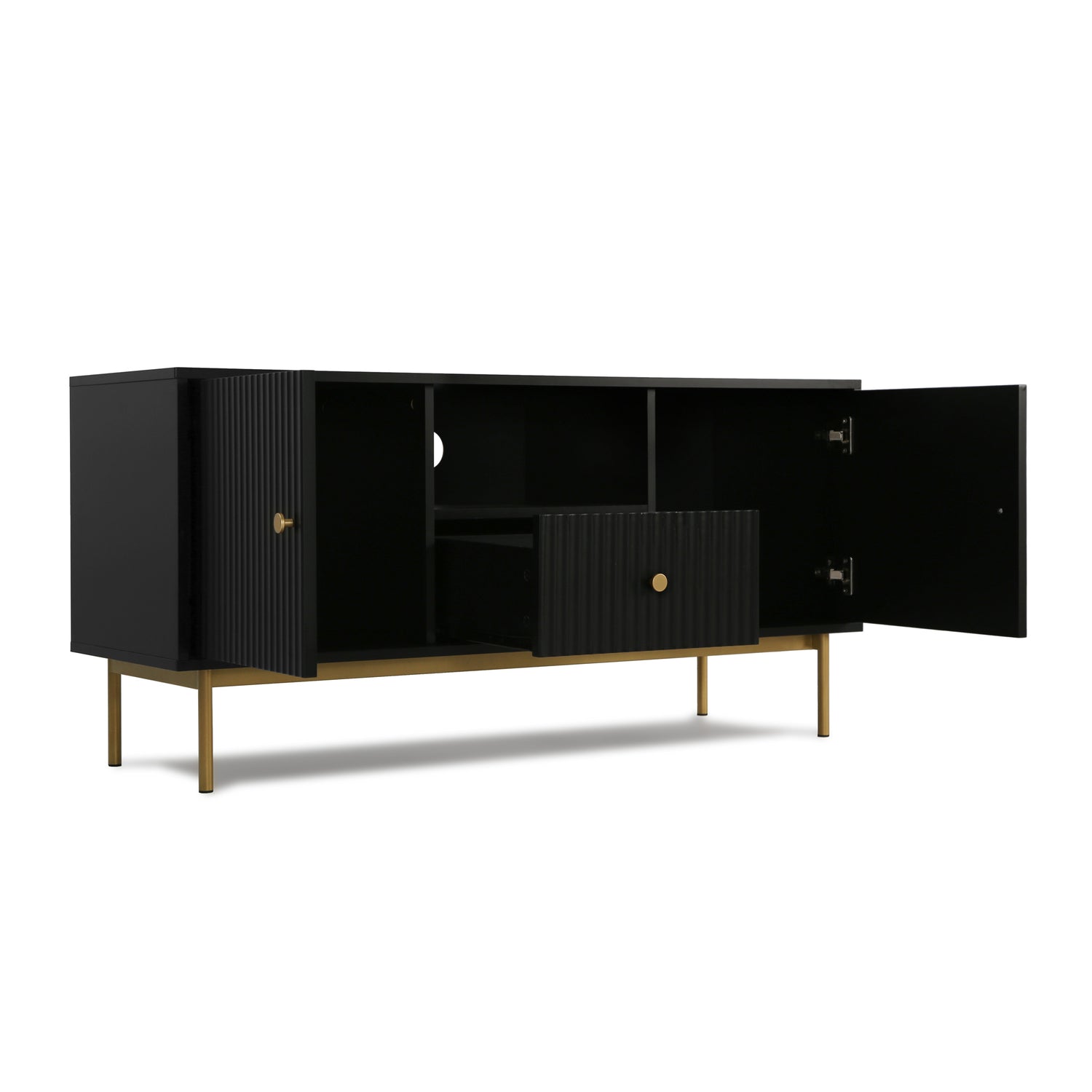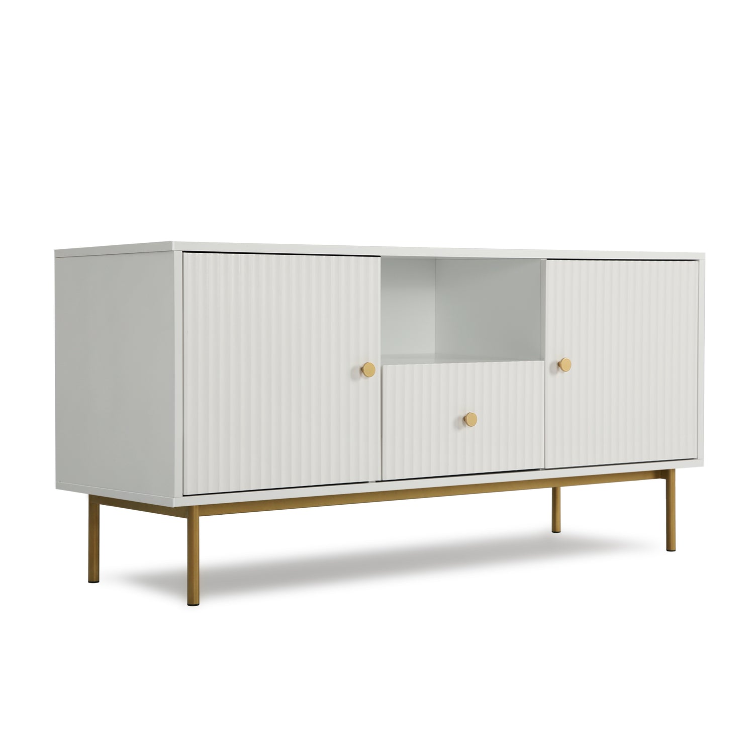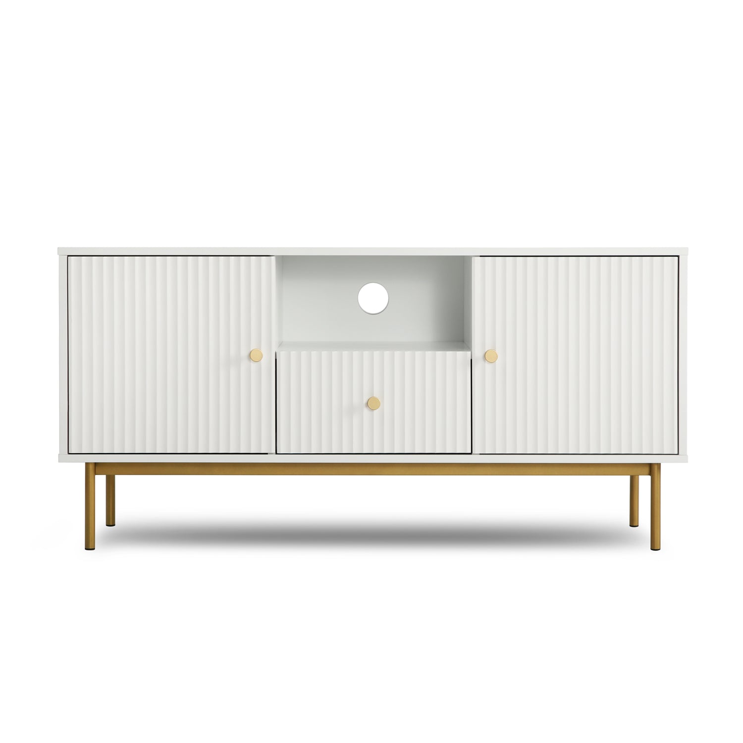 The Devon wide TV media unit is a sophisticated and functional piece designed to enhance your living room. Constructed from a sturdy MDF frame and finished with a matte PU paint, this TV stand is available in four elegant colours: white, black, grey, and sage. The wide TV unit features ample storage options, ideal for organising. The handles and legs are made of metal with a durable powder coating, adding a modern touch and ensuring long-lasting durability.