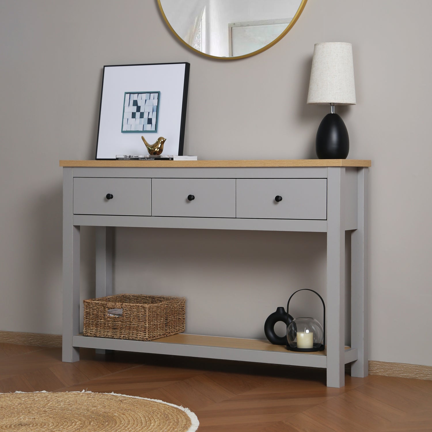 The Wiltshire 3 drawer console table is a chic furniture piece intended to elevate room organisation and visual appeal. Fashioned from high-quality MDF melamine, this console table boasts a sleek grey finish, elegantly complemented by a wood-coloured top. Serving as a console table with drawers, it provides generous storage space, making it perfect for organising your living area. Its practical design also makes it an excellent choice for those looking for hallway tables with storage, offering both style and functionality for entryways and corridors.
