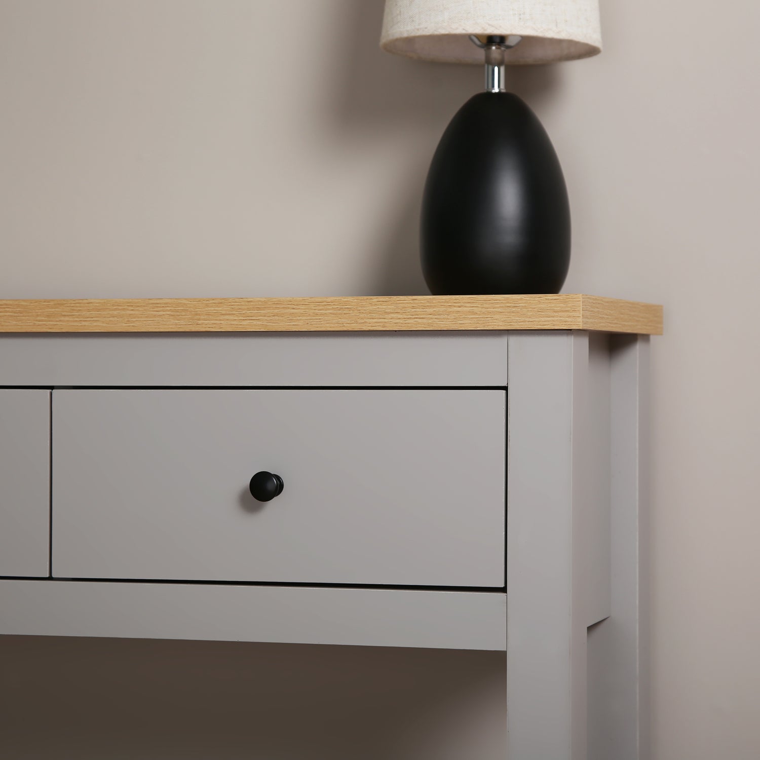 The Wiltshire console table with storage seamlessly blends practicality with sophistication. This contemporary console table effortlessly integrates with various decor styles, enriching your home with both functionality and allure. The versatile grey console table design is suitable for displaying decorative items, and whether positioned in a hallway, living room, or bedroom, the Wiltshire console table with 3 drawers presents a pragmatic and visually appealing storage solution.