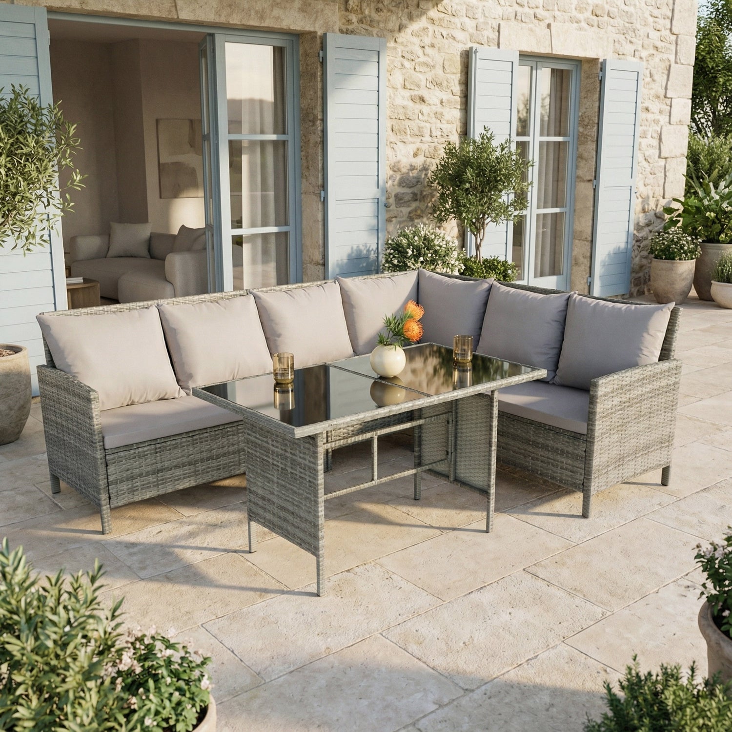 Designed for stylish outdoor entertaining, the Alia Rattan Garden Corner Dining Sofa Set in Grey or Natural Brown is crafted for comfort, relaxation, and everyday durability. Ideal for gardens, patios, and terraces, this elegant rattan garden corner dining sofa set creates a welcoming and functional outdoor living space for dining and social gatherings.
