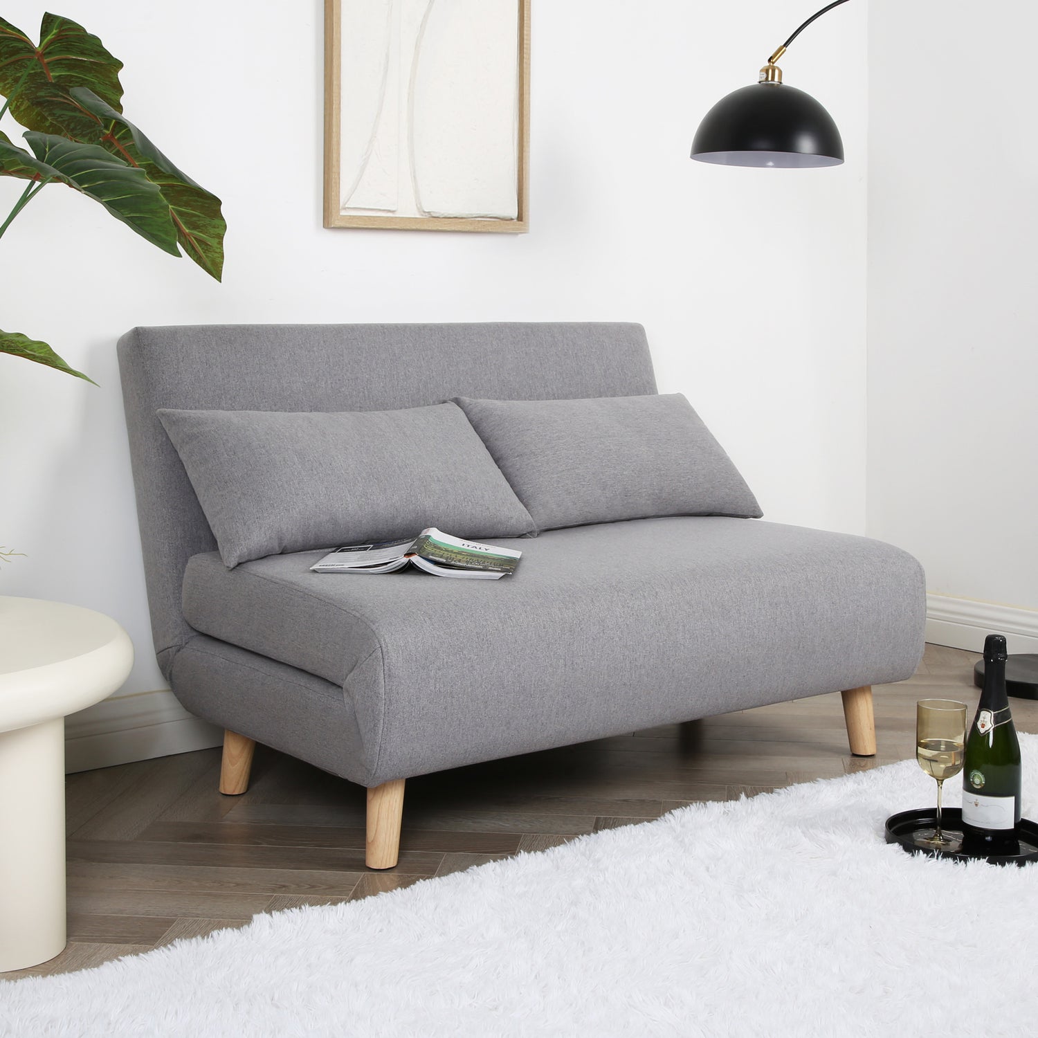 The Aurora double sofa bed is a stylish and functional addition to any living space. Upholstered in dark grey linen, this fold out futon linen design offers a sophisticated look. The sofa bed features a foam-filled construction, complemented by two cushions for added support. Its light KD rubber wood legs and sturdy wood frame with spring support provide both durability and a touch of elegance. This versatile piece is perfect for those who need a reliable and attractive pull out sofa bed.