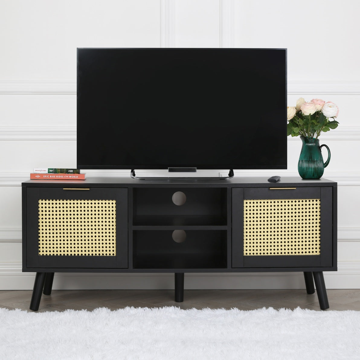 The Craven TV unit is a trendy piece that adds a dark bohemian edge to your living space. It features sliding cane front doors, a black painted finish, and natural cane detailing. The large tabletop is suitable for TVs with stands of 45 inches or smaller, making it perfect for modern life and for enjoying your favorite streaming services, gaming consoles, and movies. The unit also has plenty of storage for media units, TV controls, and other living room items. The cable management hole on each shelf allows for easy access to console cables and helps keep your media cabinet tidy. The Craven TV unit is an ideal choice for adding a functional and fashionable touch to your living space.