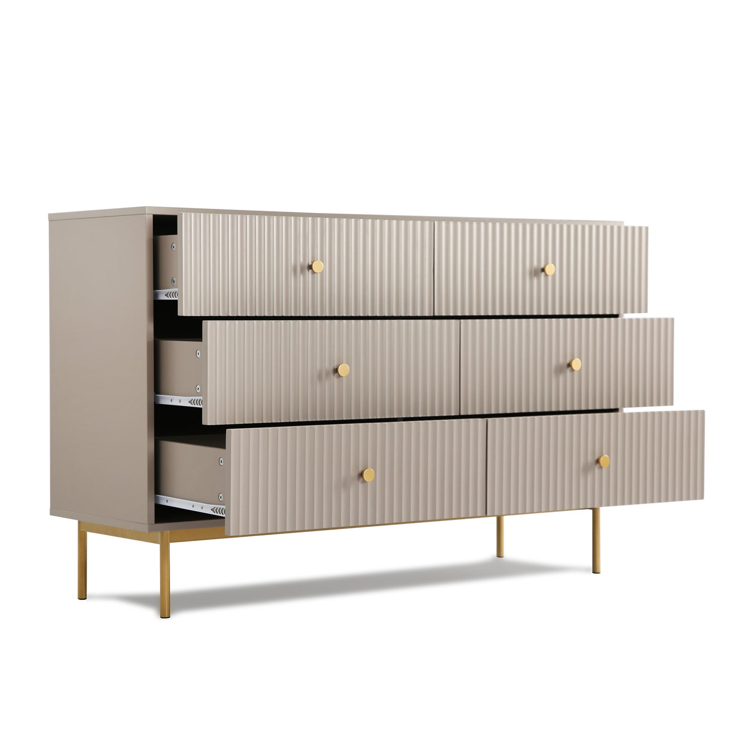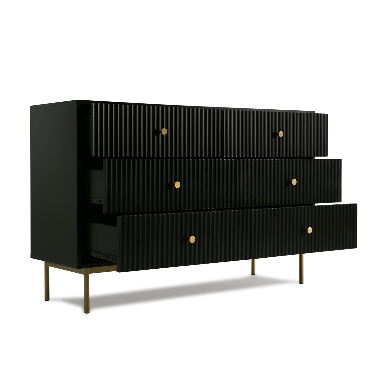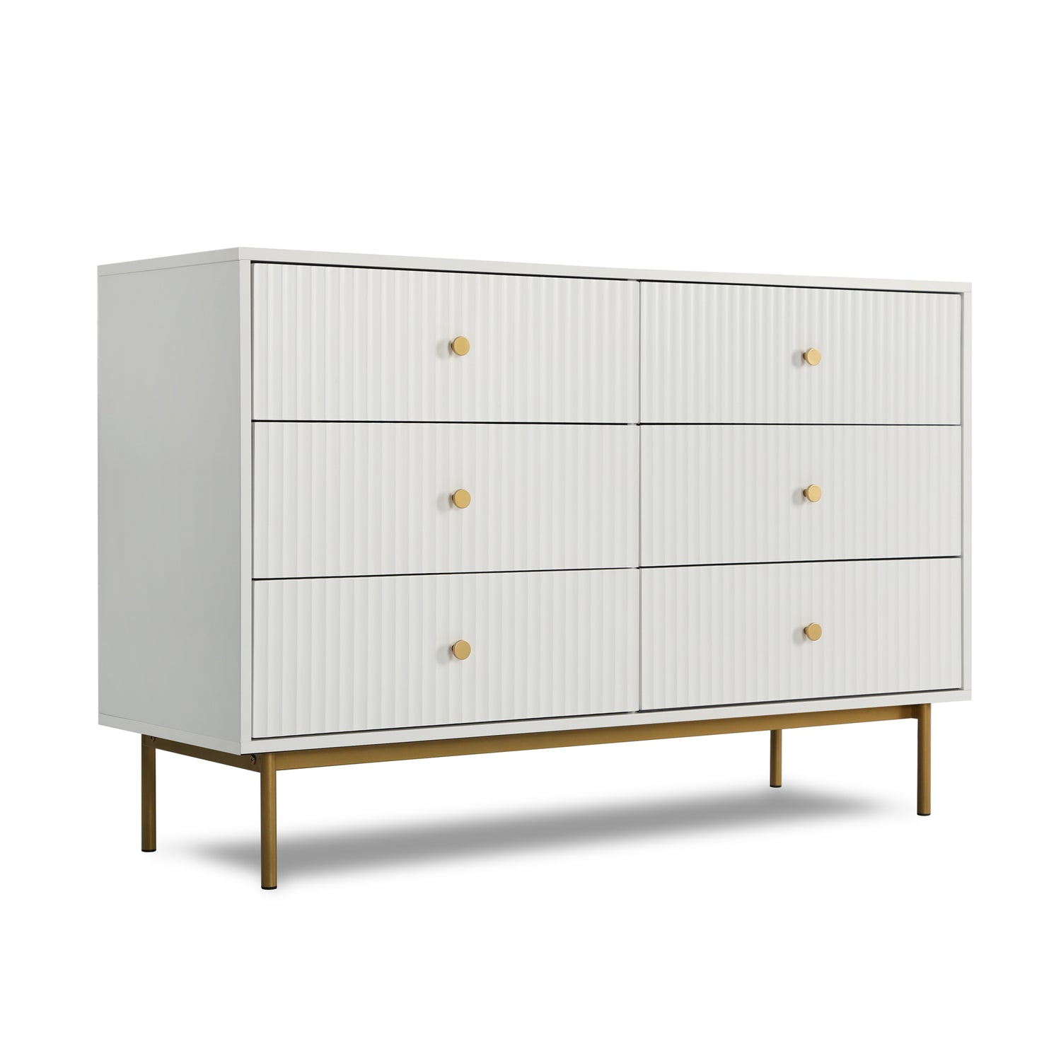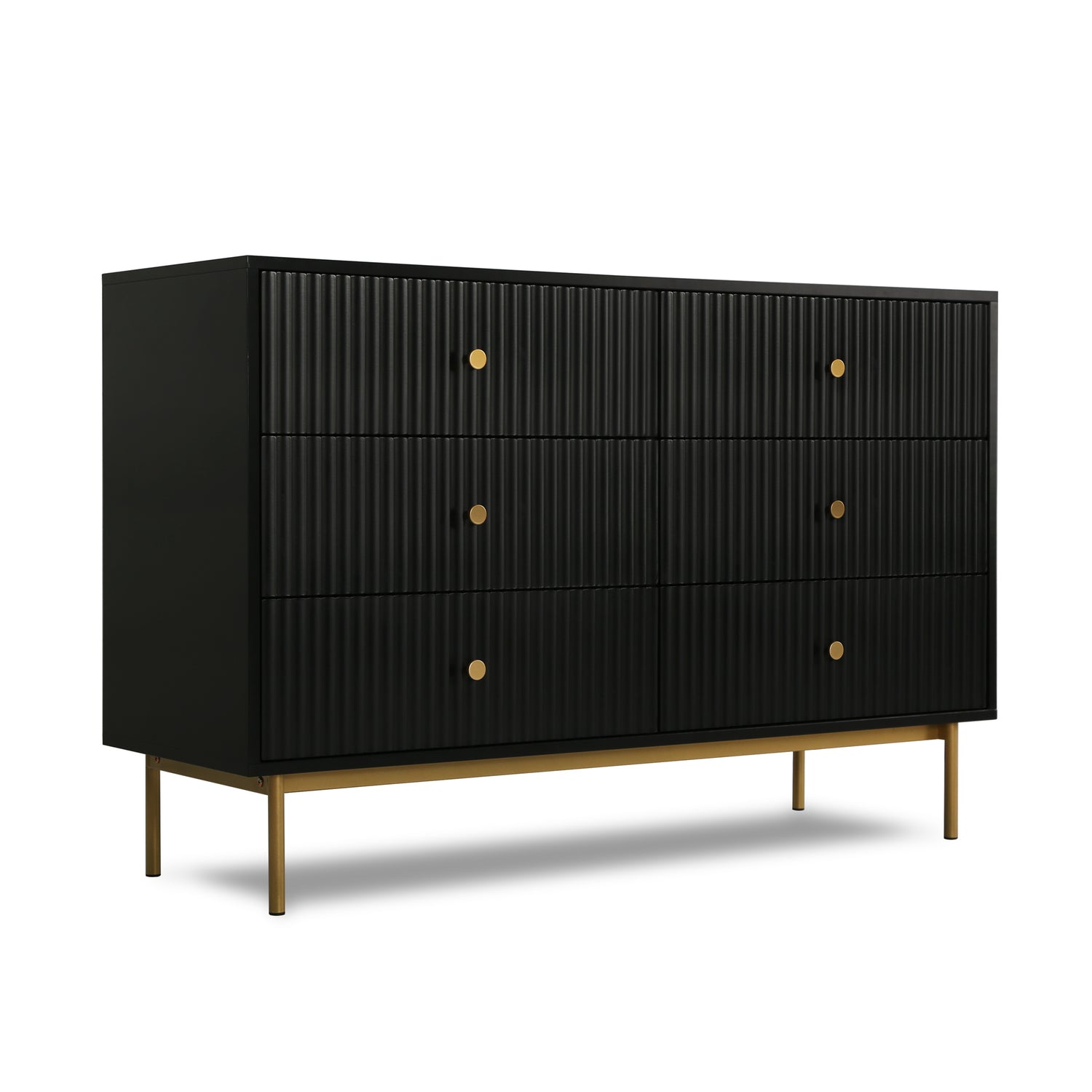 The Devon wide chest of 6 drawers is a sophisticated and functional piece designed to enhance bedroom storage solutions. This chest of drawers is constructed with a sturdy MDF frame, finished in a matte PU paint that is available in four colours: white, black, grey and sage. The wide chest of drawers features six spacious drawers, providing ample space, making it an essential chest of drawers for bedroom. The metal handles and legs, coated with a durable golden powder finish, add a touch of elegance.