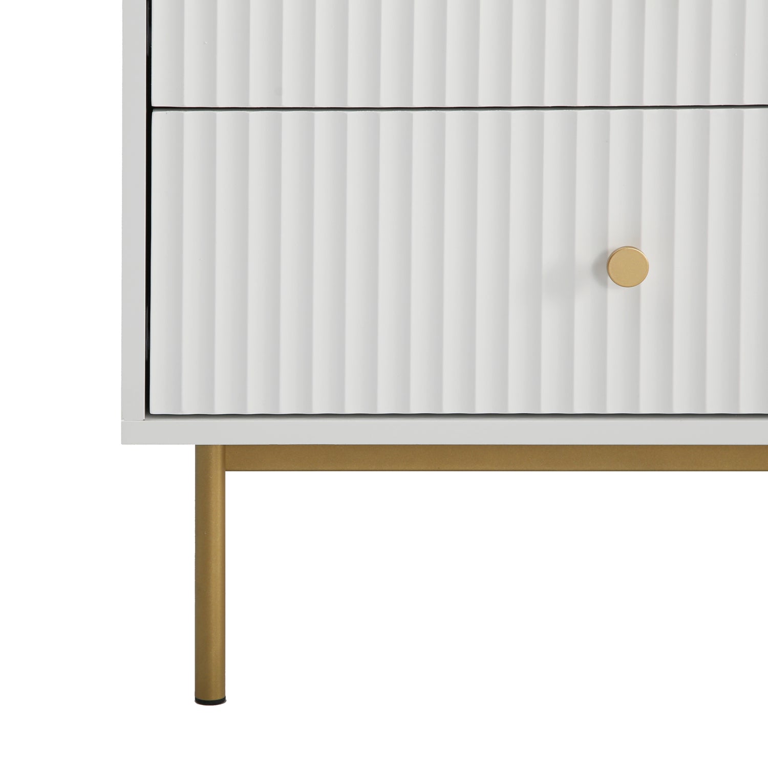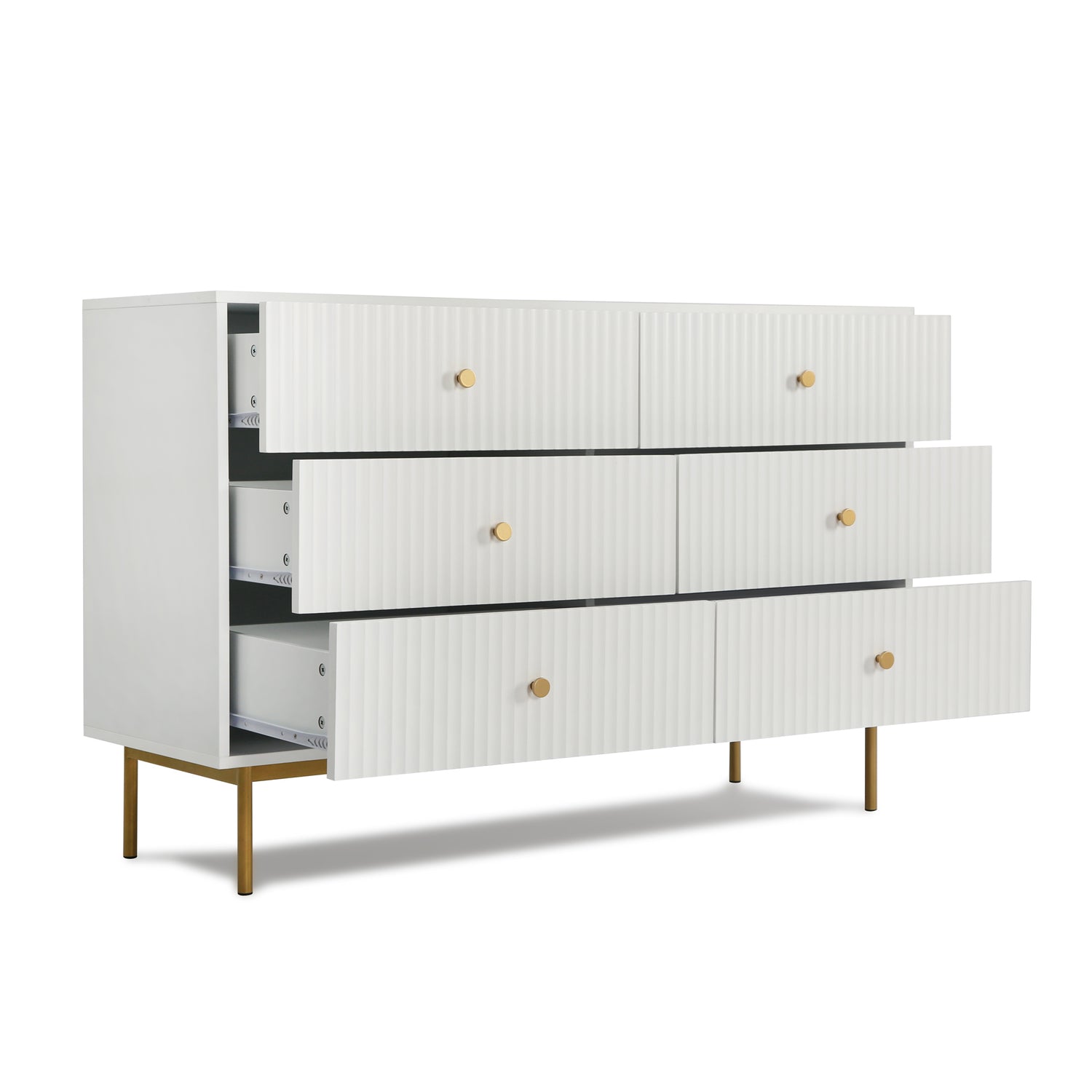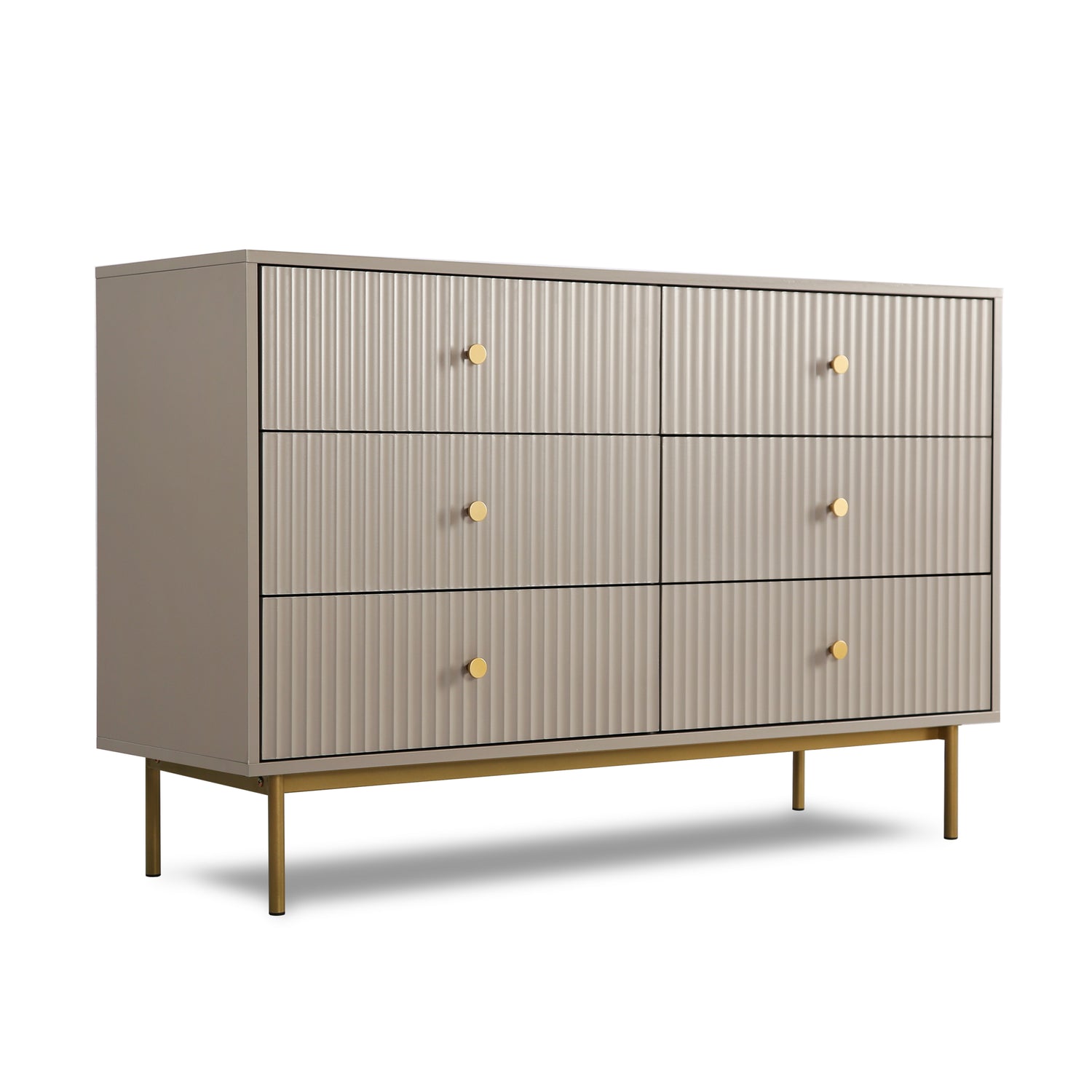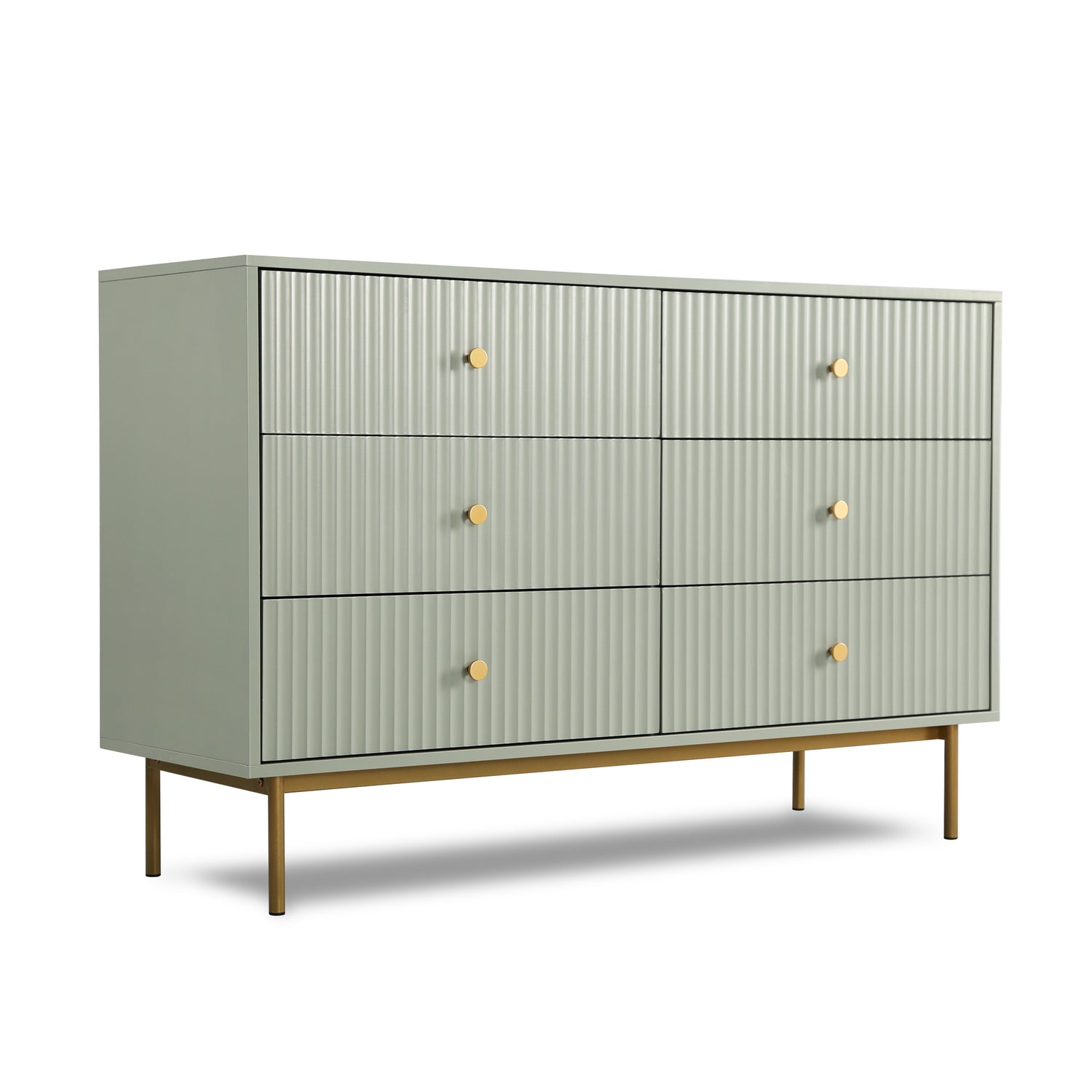 The Devon wide chest of 6 drawers is a sophisticated and functional piece designed to enhance bedroom storage solutions. This chest of drawers is constructed with a sturdy MDF frame, finished in a matte PU paint that is available in four colours: white, black, grey and sage. The wide chest of drawers features six spacious drawers, providing ample space, making it an essential chest of drawers for bedroom. The metal handles and legs, coated with a durable golden powder finish, add a touch of elegance.