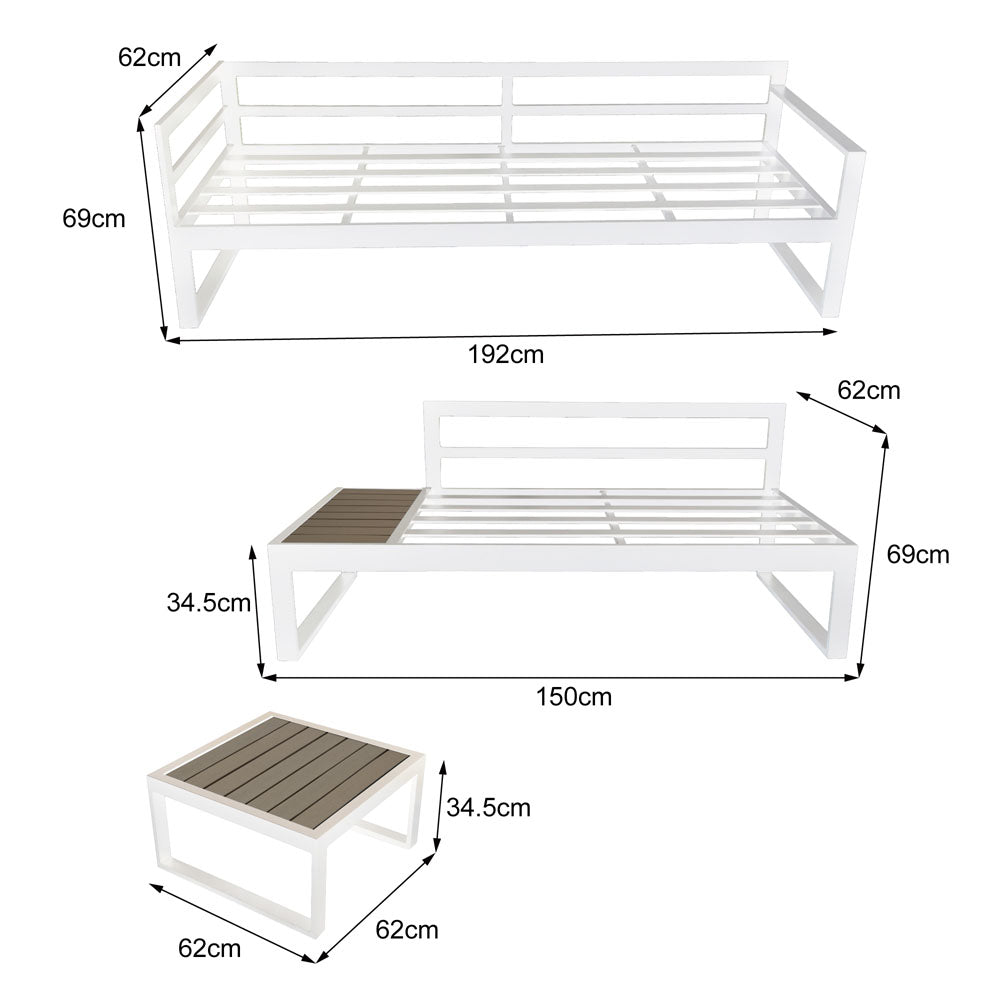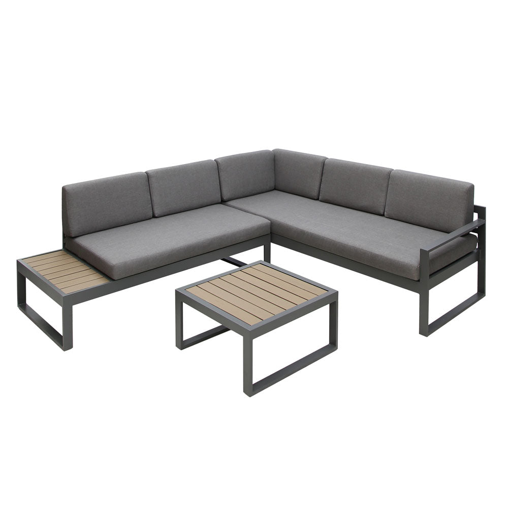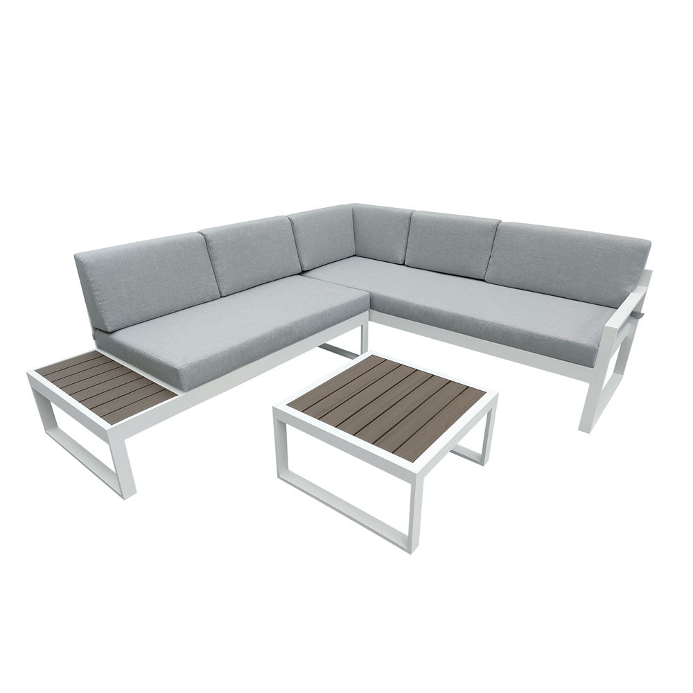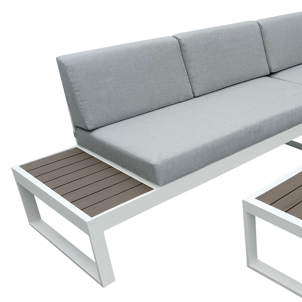 Enhance your outdoor living area with the Maia garden corner sofa set. The engineering of this lounge corner sofa allows you to set it as a right or left corner configuration, depending your needs. This stylish furniture set can accommodate up to 5 people and is perfect for hosting gatherings or simply lounging in the sun. The dark grey or white aluminum frame and wood-effect slats give the set a modern and sophisticated appearance, while the grey cushions add a touch of comfort. Upgrade your outdoor space with the Maia garden sofa set.