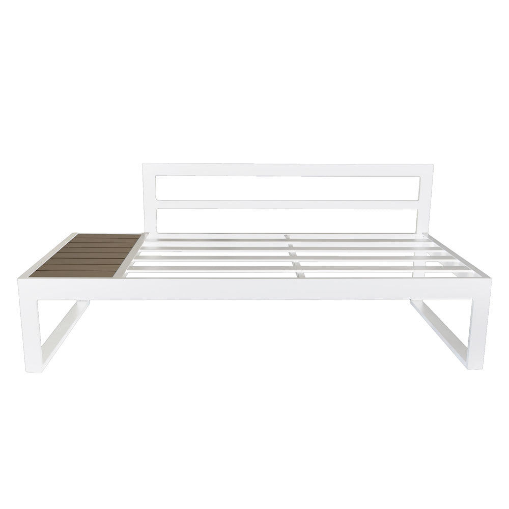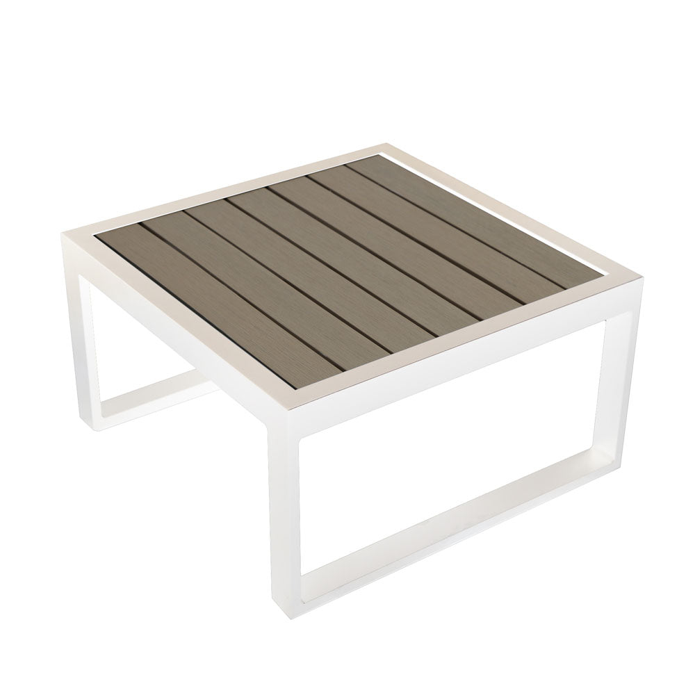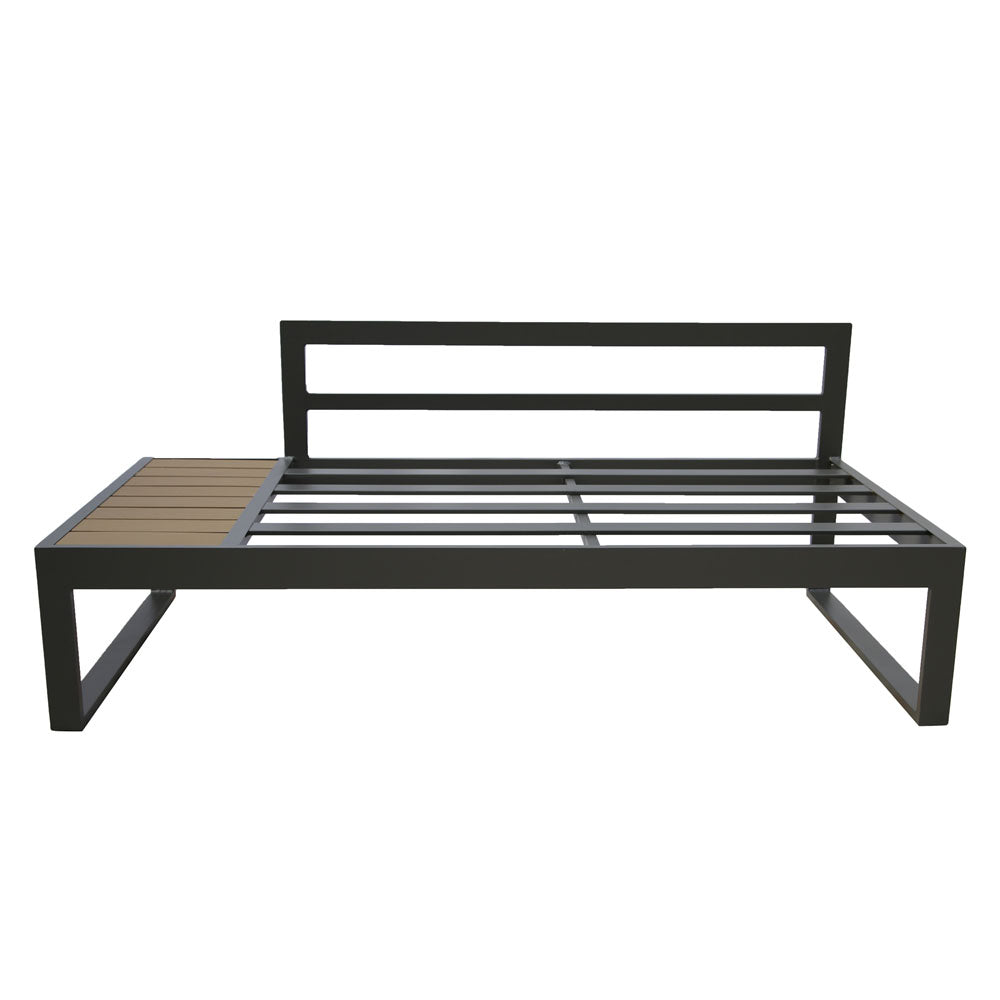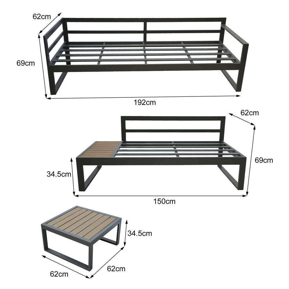 Enhance your outdoor living area with the Maia garden corner sofa set. The engineering of this lounge corner sofa allows you to set it as a right or left corner configuration, depending your needs. This stylish furniture set can accommodate up to 5 people and is perfect for hosting gatherings or simply lounging in the sun. The dark grey or white aluminum frame and wood-effect slats give the set a modern and sophisticated appearance, while the grey cushions add a touch of comfort. Upgrade your outdoor space with the Maia garden sofa set.