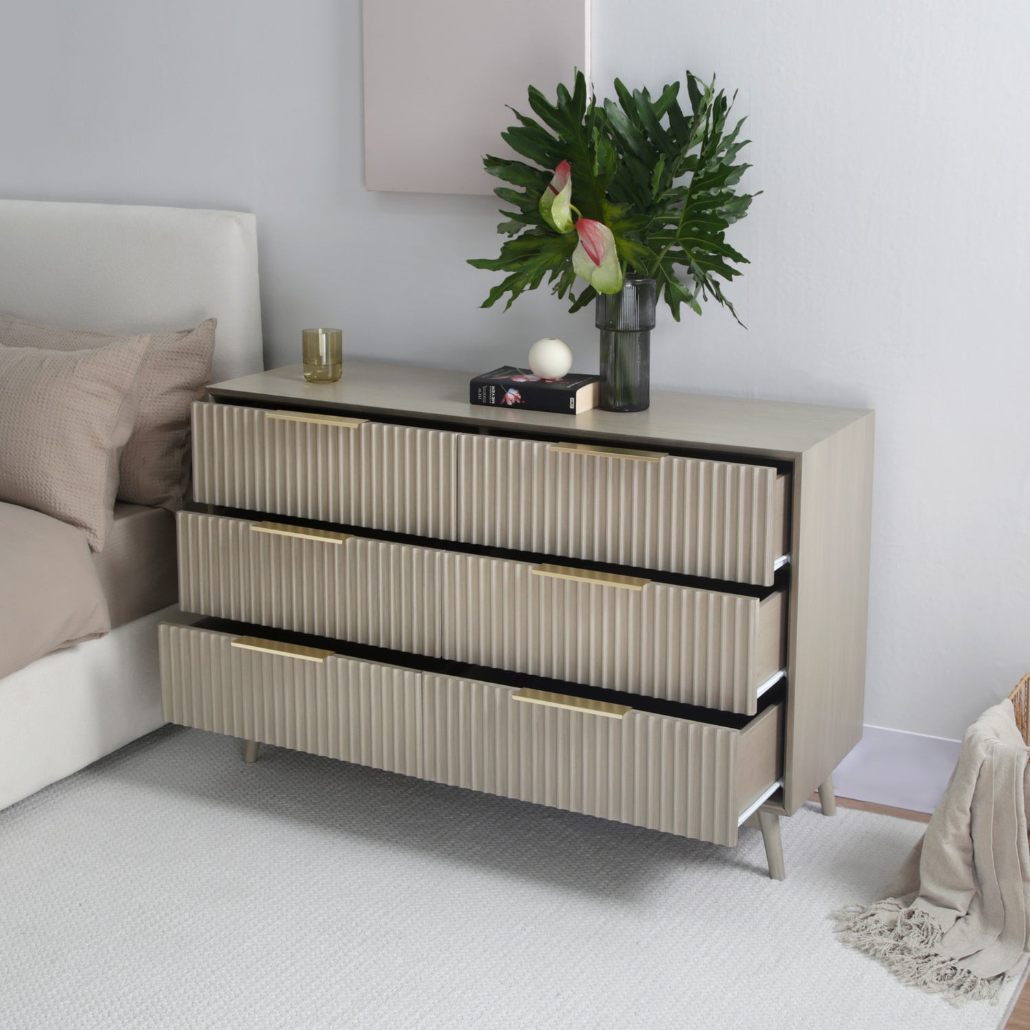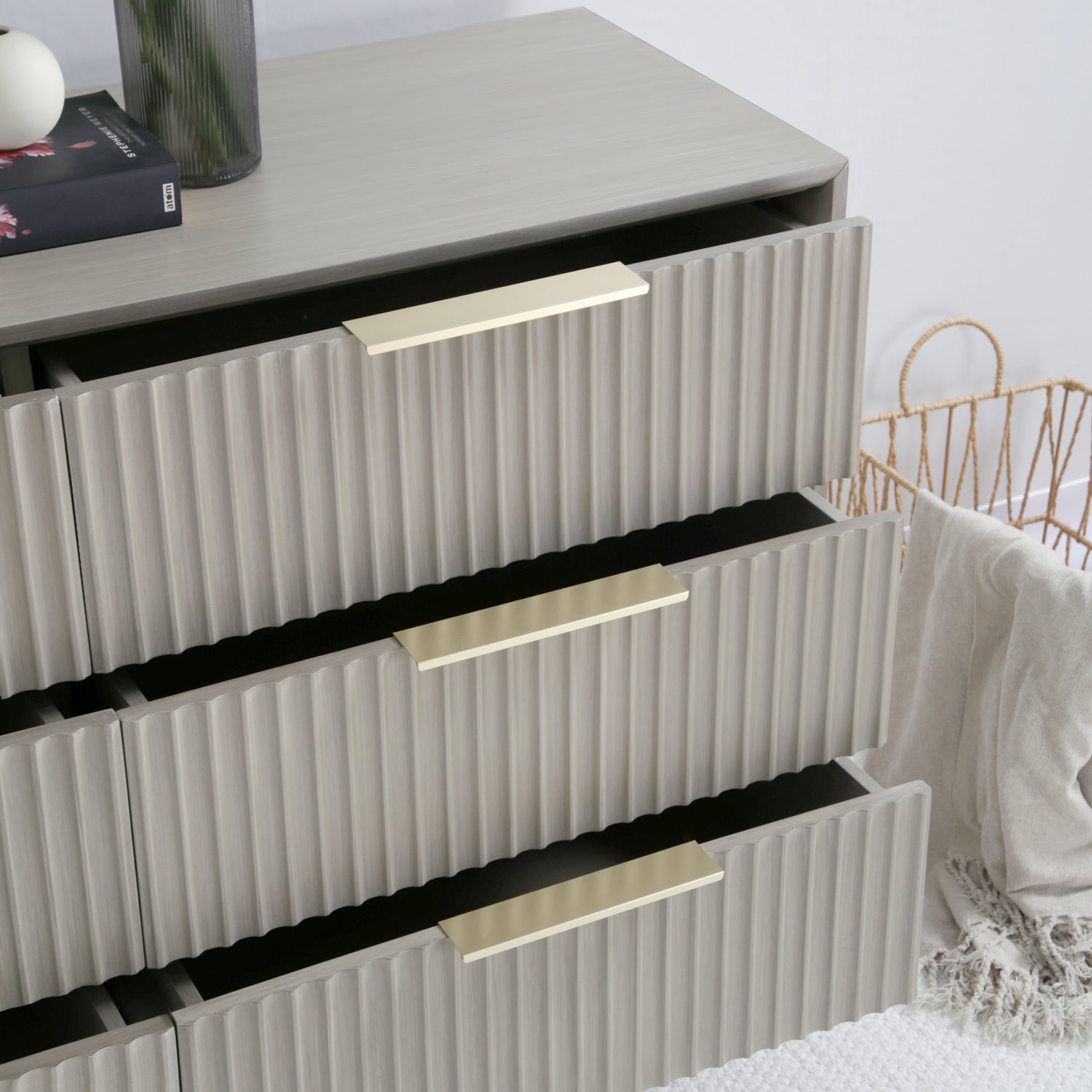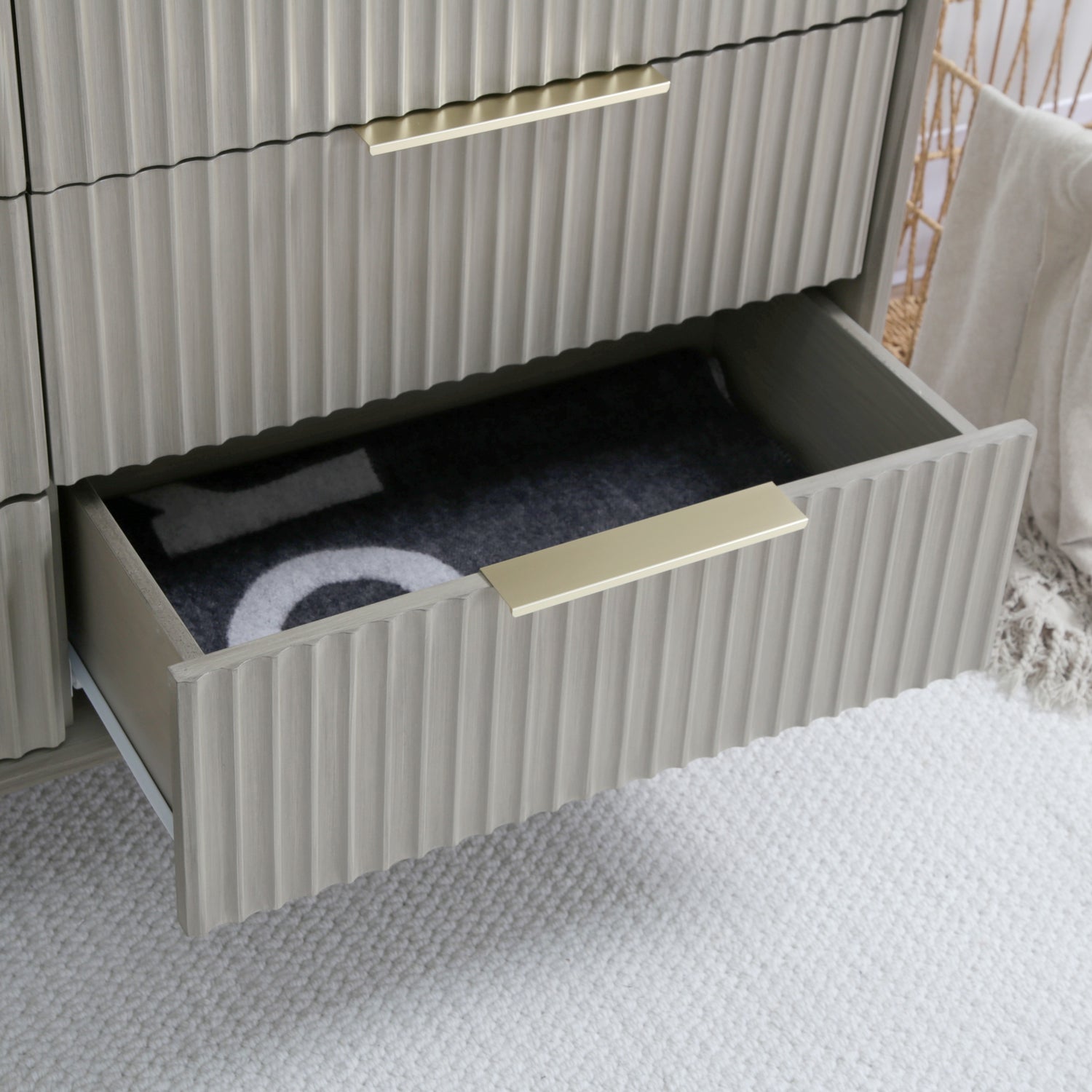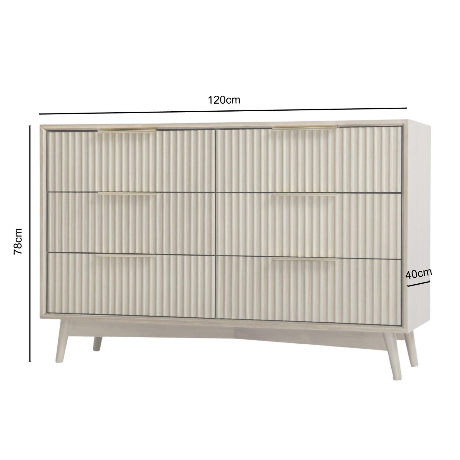 Style meets storage in the Monza  6 Chest of Drawers, a refined and functional piece crafted to elevate any room. Finished in your choice of bold black wash or soft pale ash wash, this wide drawer chest brings modern elegance and everyday practicality into your home. Featuring signature fluted drawer fronts and brushed gold handles, it’s a standout addition for those who value both design and utility.