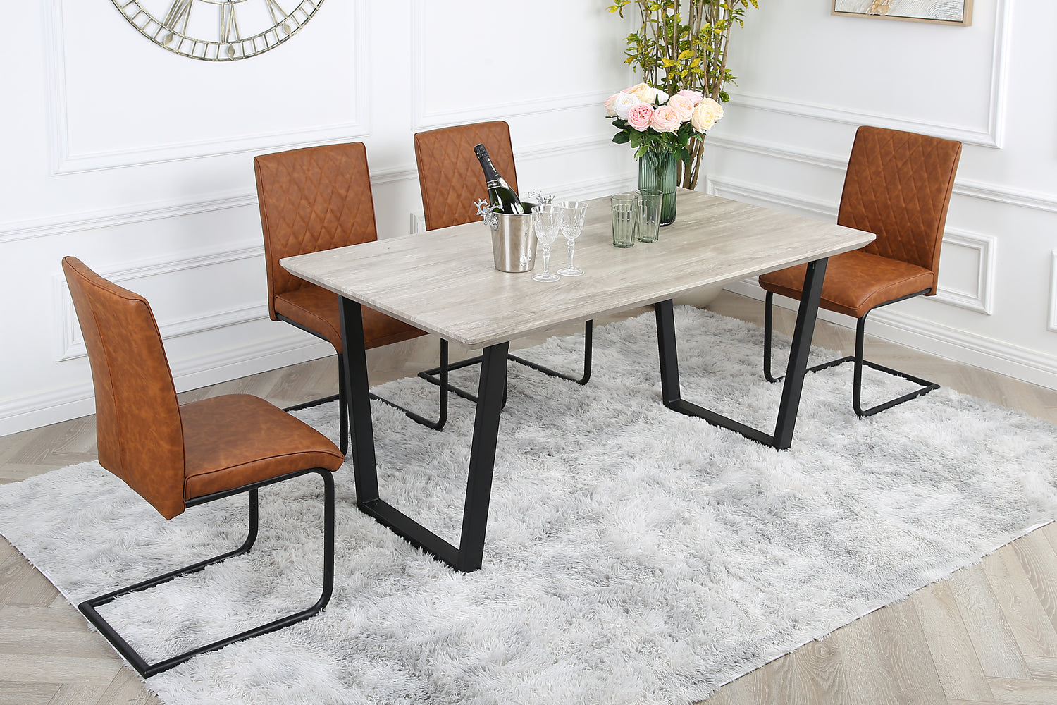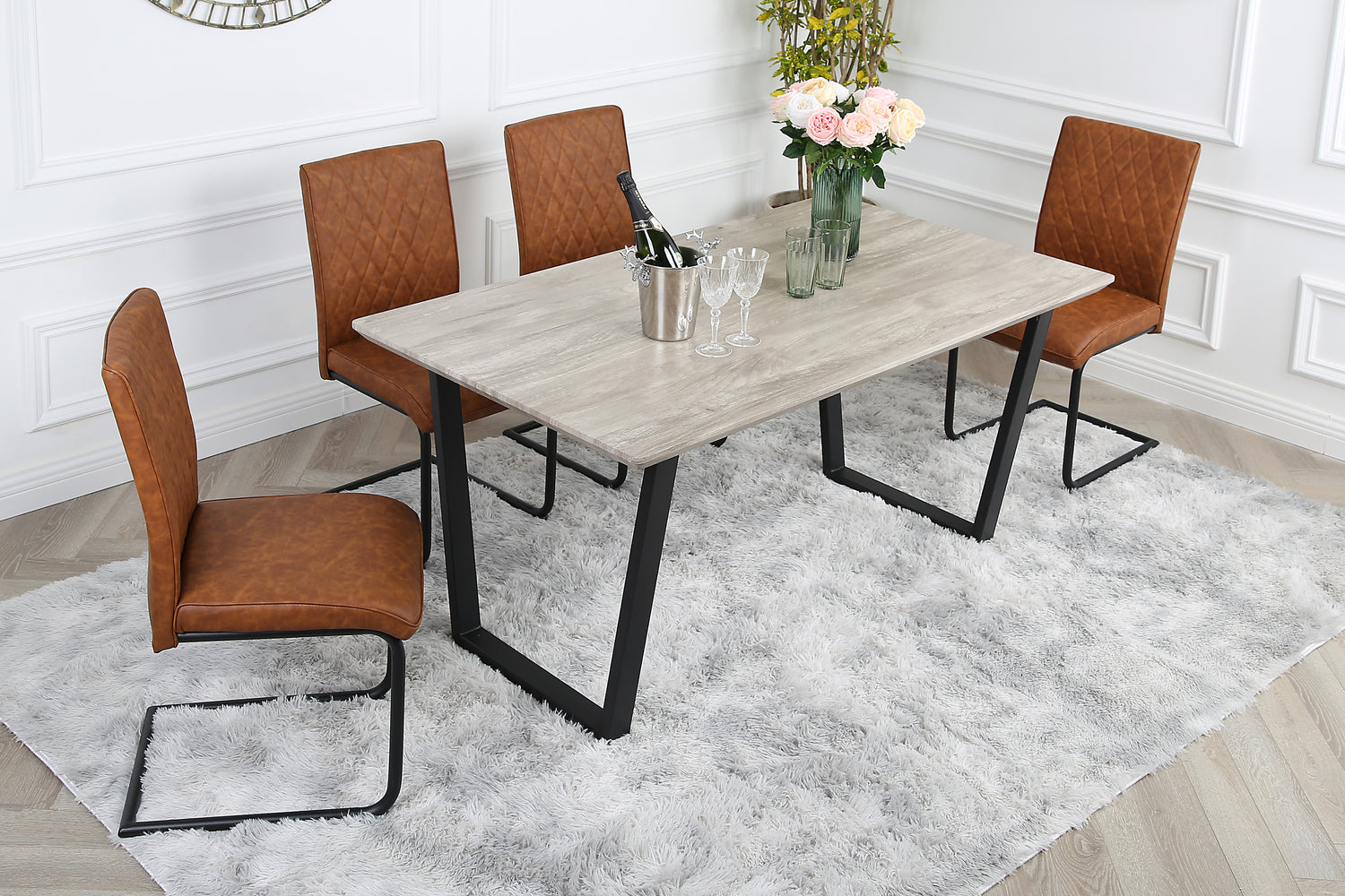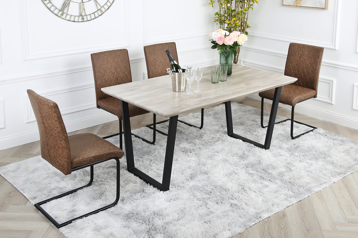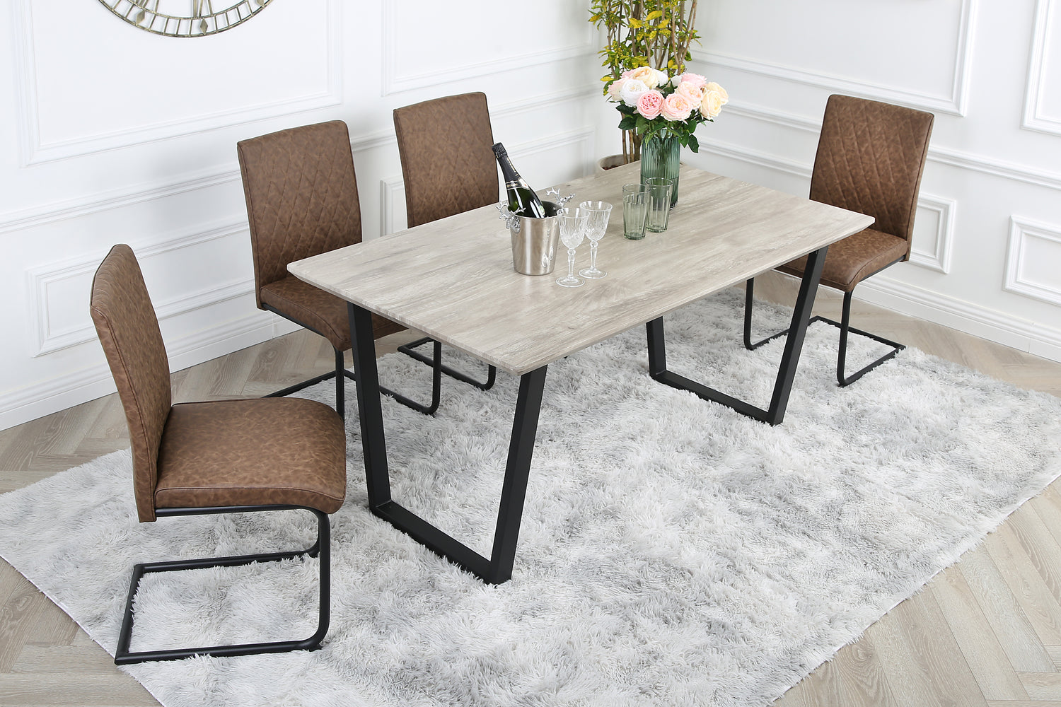 Complementing the table are our sturdy industrial chairs, available in a choice of brown, tan, and grey. These table and 4 chairs set is designed for both comfort and durability, featuring an industrial-inspired design that adds a unique touch to your dining space. Their availability in different colours allows you to select the perfect shade to suit your decor. These chairs not only enhance the visual appeal of the dining set but also offer comfortable seating, making every dining experience enjoyable.