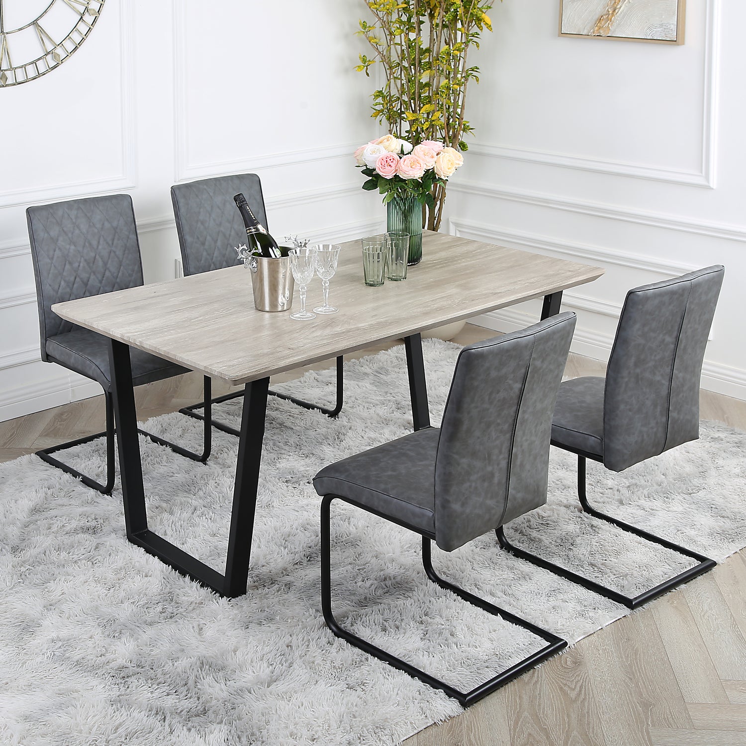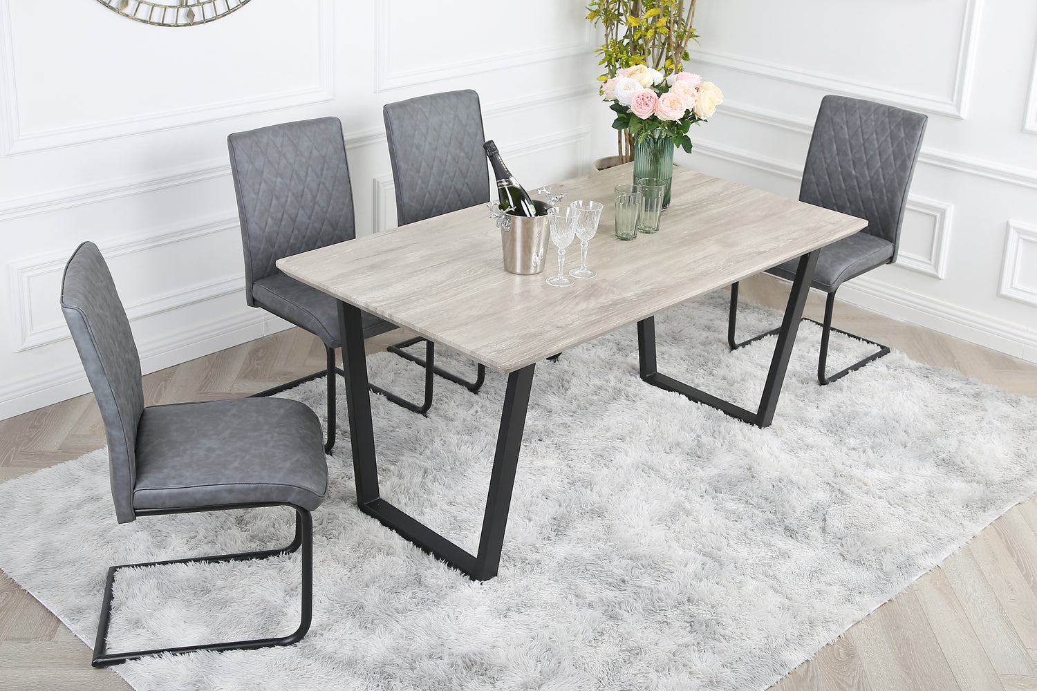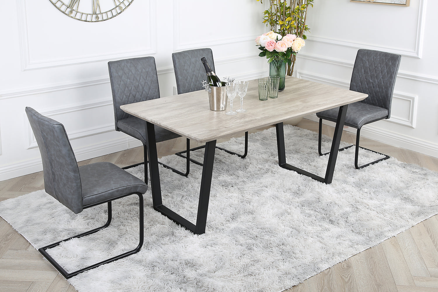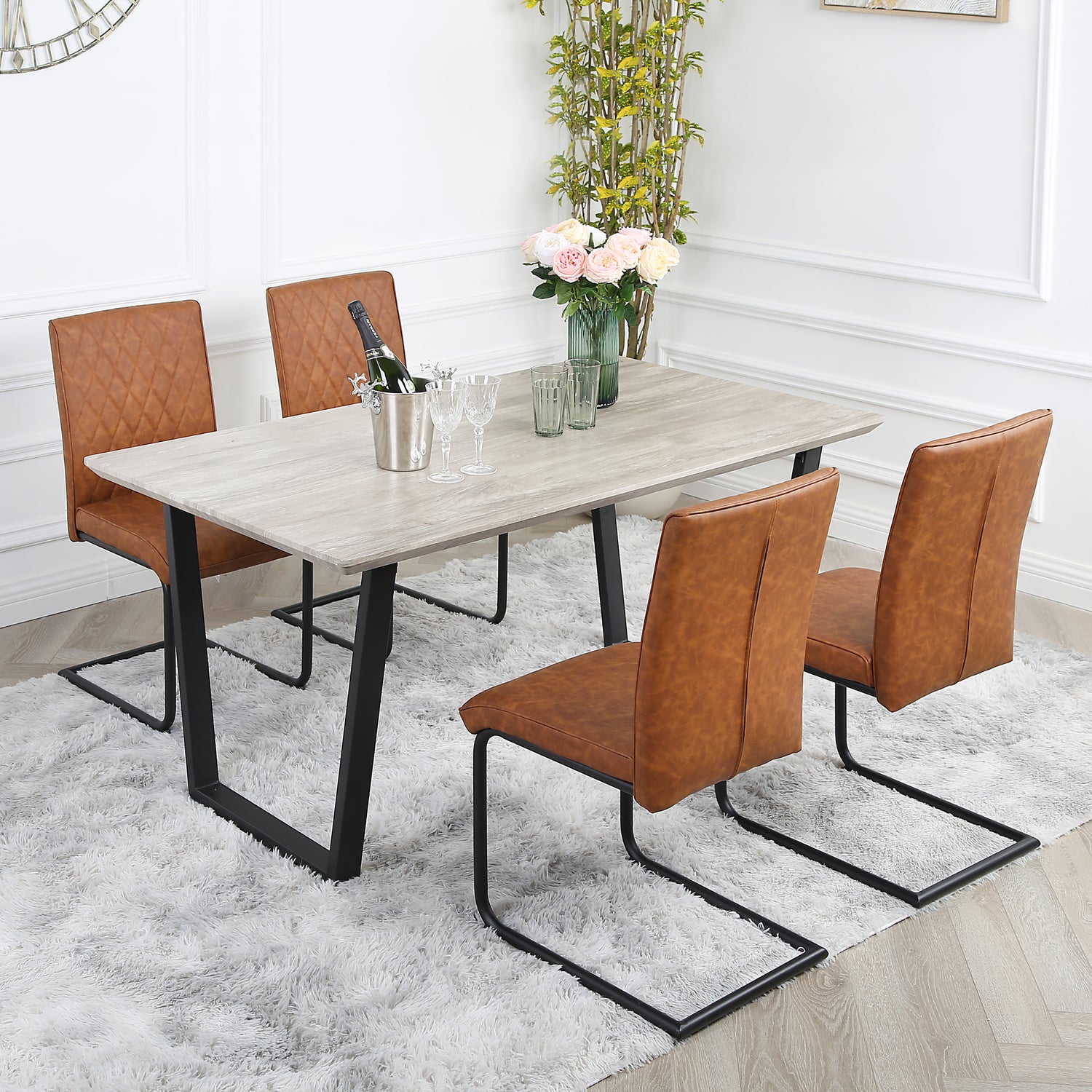 Complementing the table are our sturdy industrial chairs, available in a choice of brown, tan, and grey. These table and 4 chairs set is designed for both comfort and durability, featuring an industrial-inspired design that adds a unique touch to your dining space. Their availability in different colours allows you to select the perfect shade to suit your decor. These chairs not only enhance the visual appeal of the dining set but also offer comfortable seating, making every dining experience enjoyable.