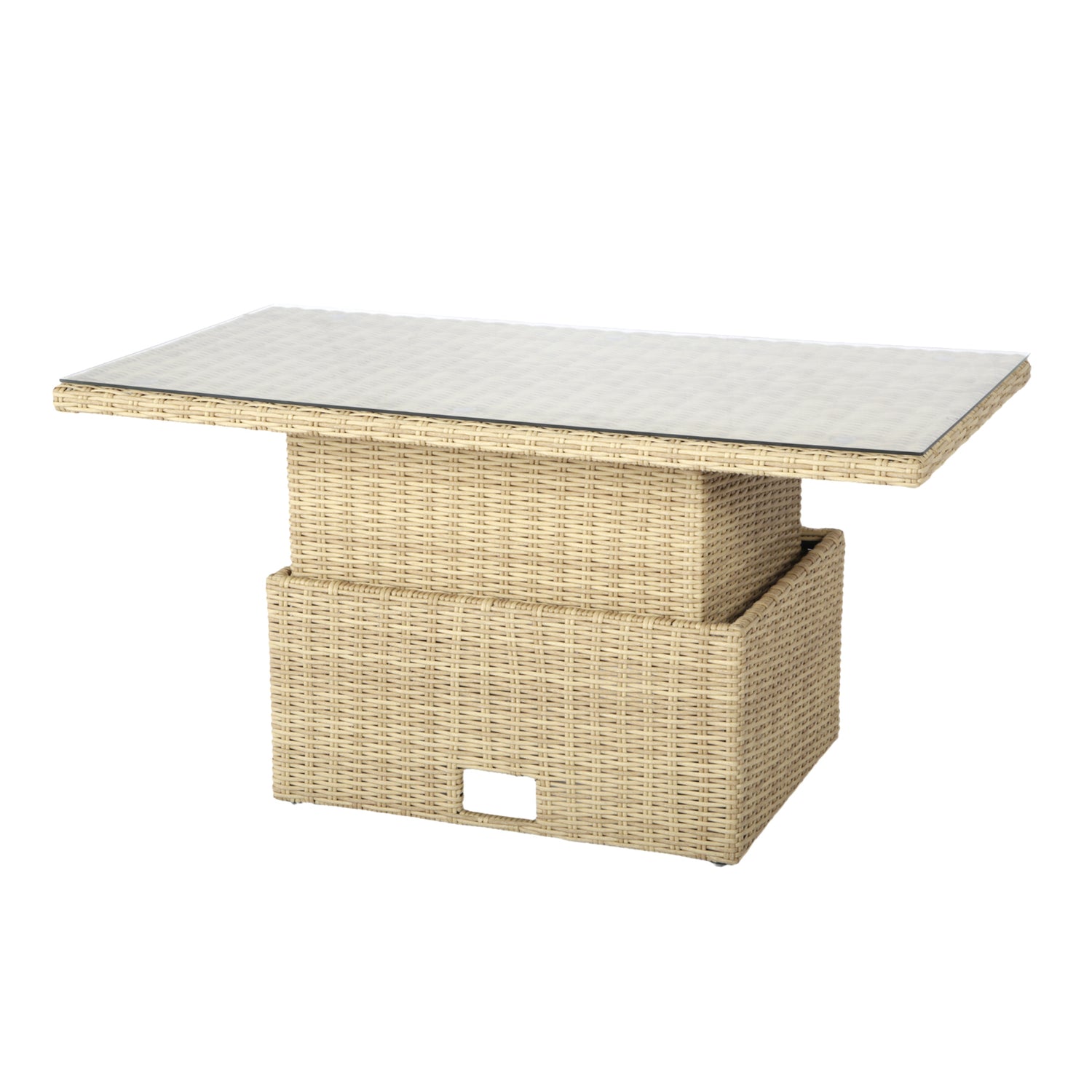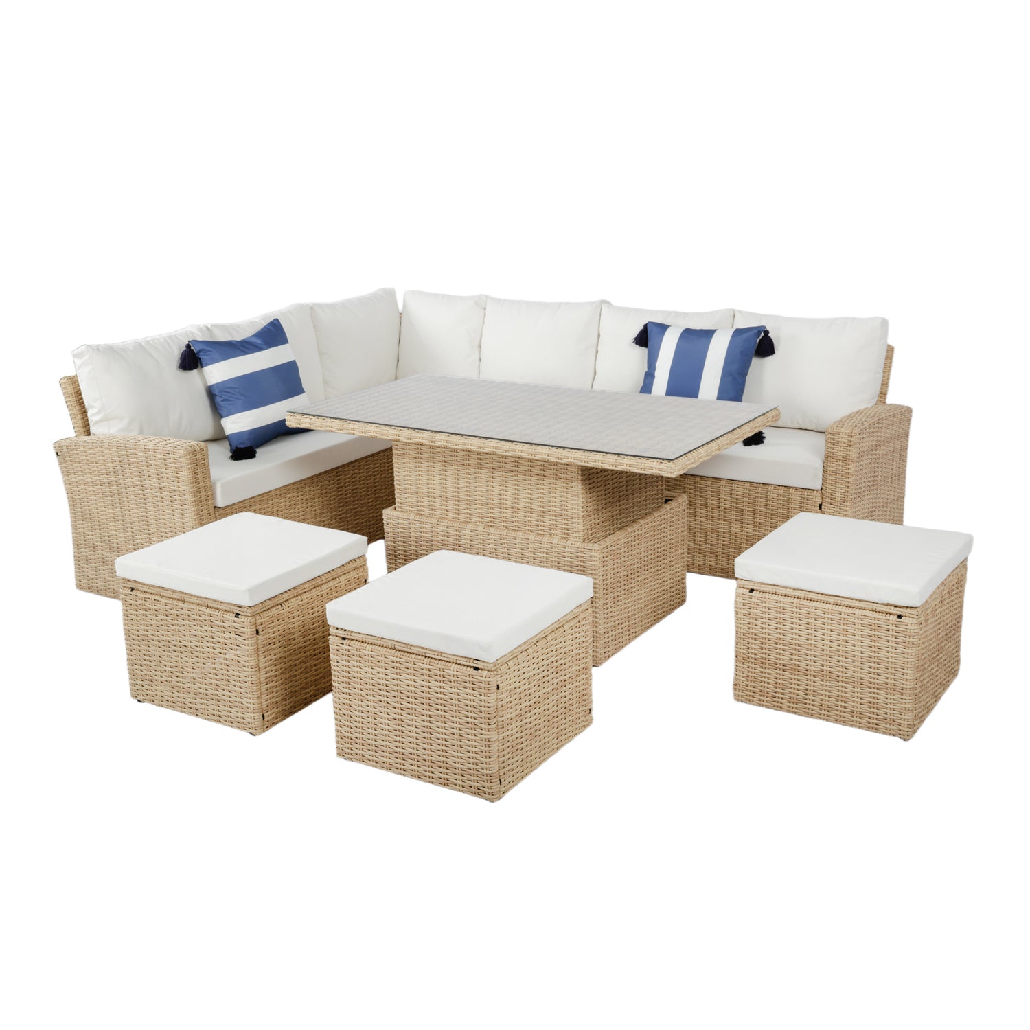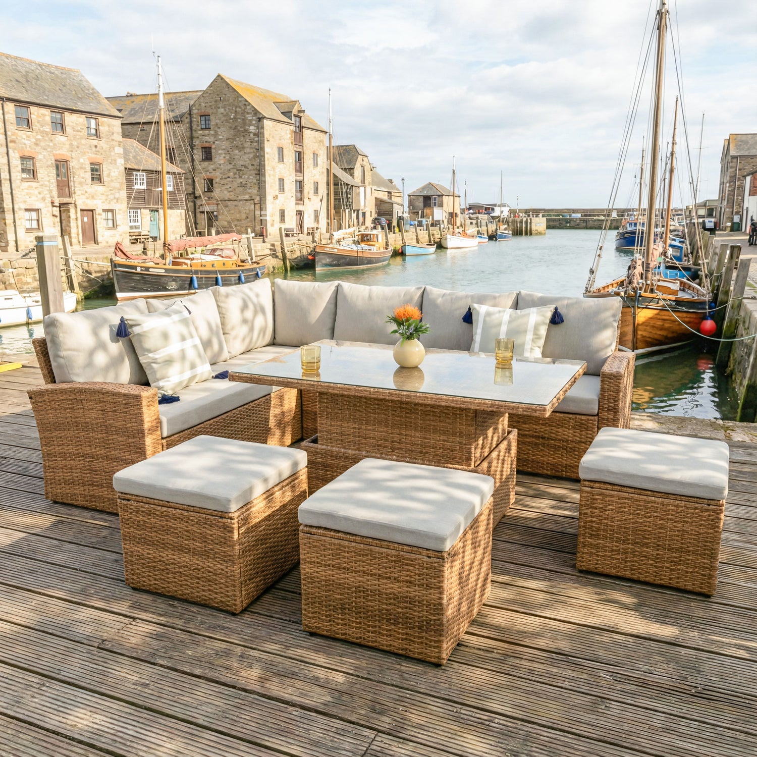 Pelias Rattan Garden Corner 8 Seater Outdoor Sofa Dining Set with Rising Table - Natural/Brown