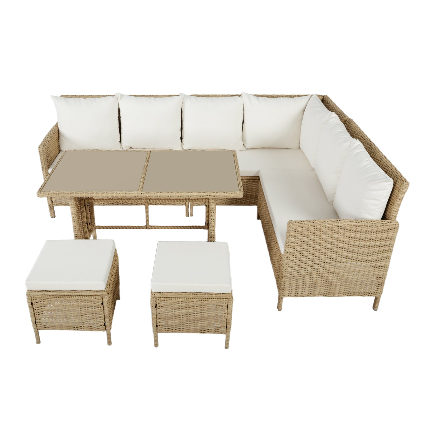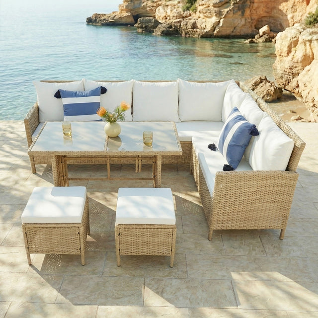 Thalia Rattan Garden Corner 8 Seater Outdoor Dining Sofa Set with Glass Table - Natural - Natural is backordered and will ship as soon as it is back in stock.