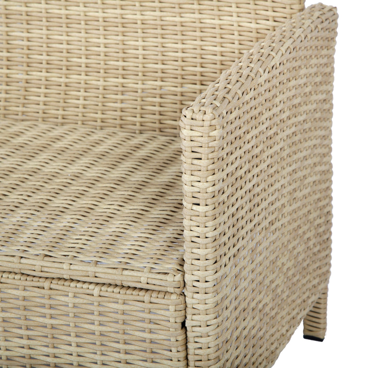 The Thalia set features a premium PE half-moon rattan weave, which is thicker, stronger, and more durable than standard rattan, providing superior strength and long-term performance for outdoor use. Finished in sleek Natural, the set is paired with soft white, weather-resistant cushions for a contemporary yet timeless look. A modern glass-top dining table completes the set, offering both elegance and practicality for outdoor meals, drinks, and casual gatherings.