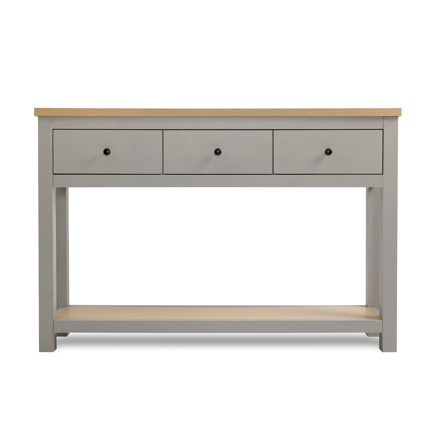 The Wiltshire console table with storage seamlessly blends practicality with sophistication. This contemporary console table effortlessly integrates with various decor styles, enriching your home with both functionality and allure. The versatile grey console table design is suitable for displaying decorative items, and whether positioned in a hallway, living room, or bedroom, the Wiltshire console table with 3 drawers presents a pragmatic and visually appealing storage solution.
